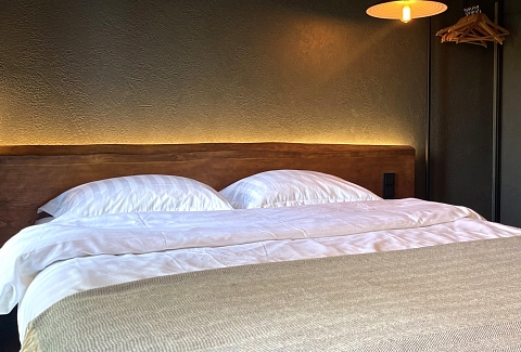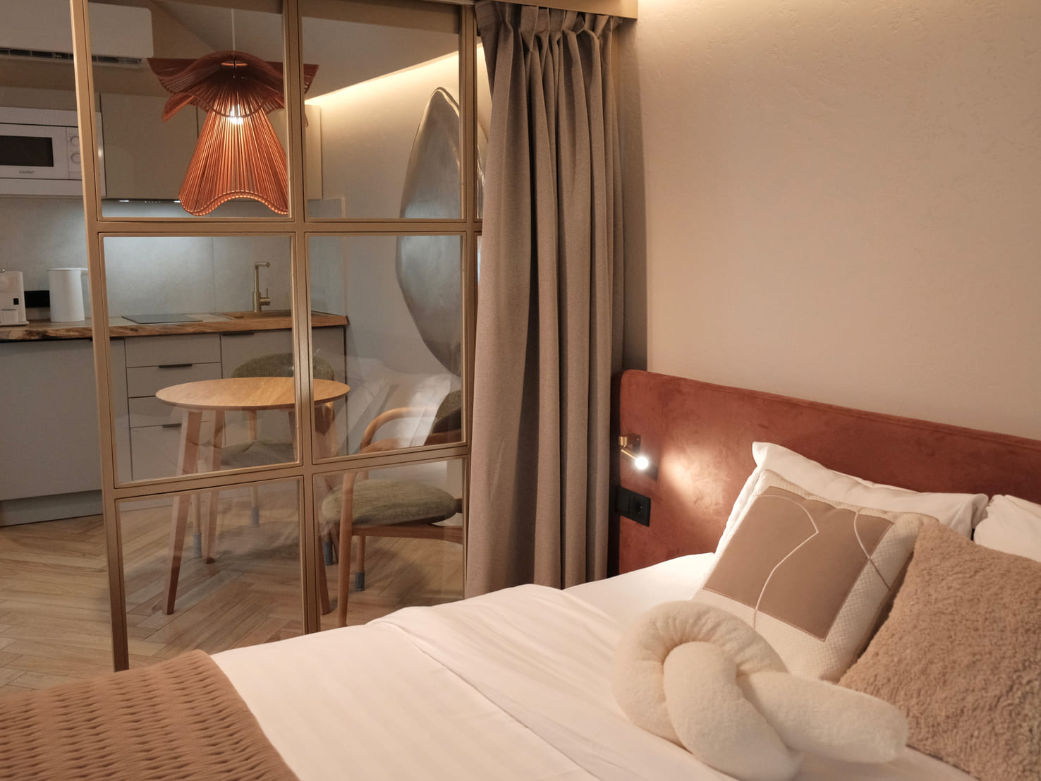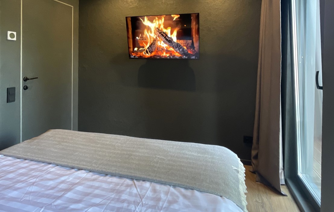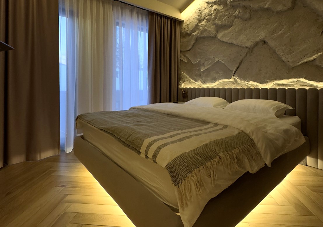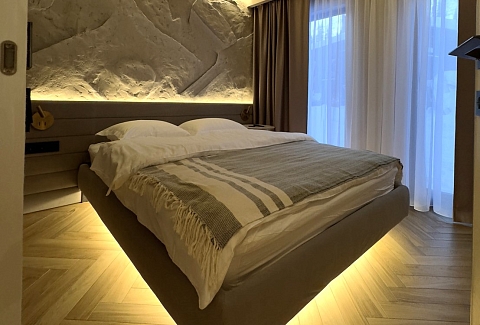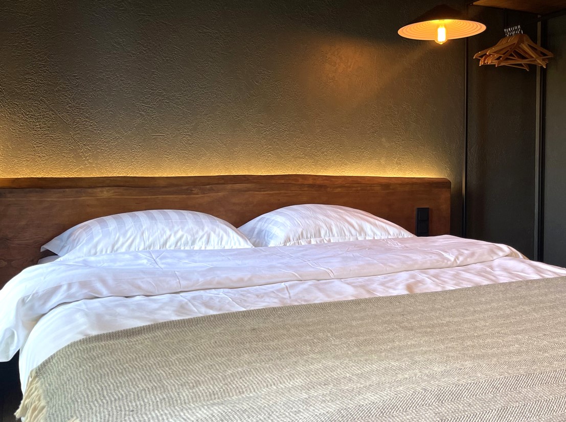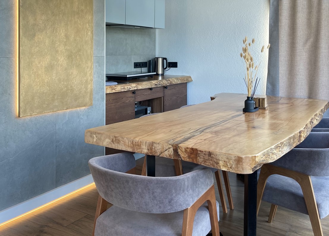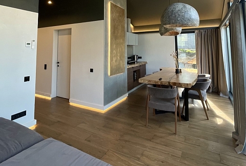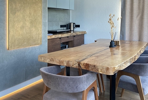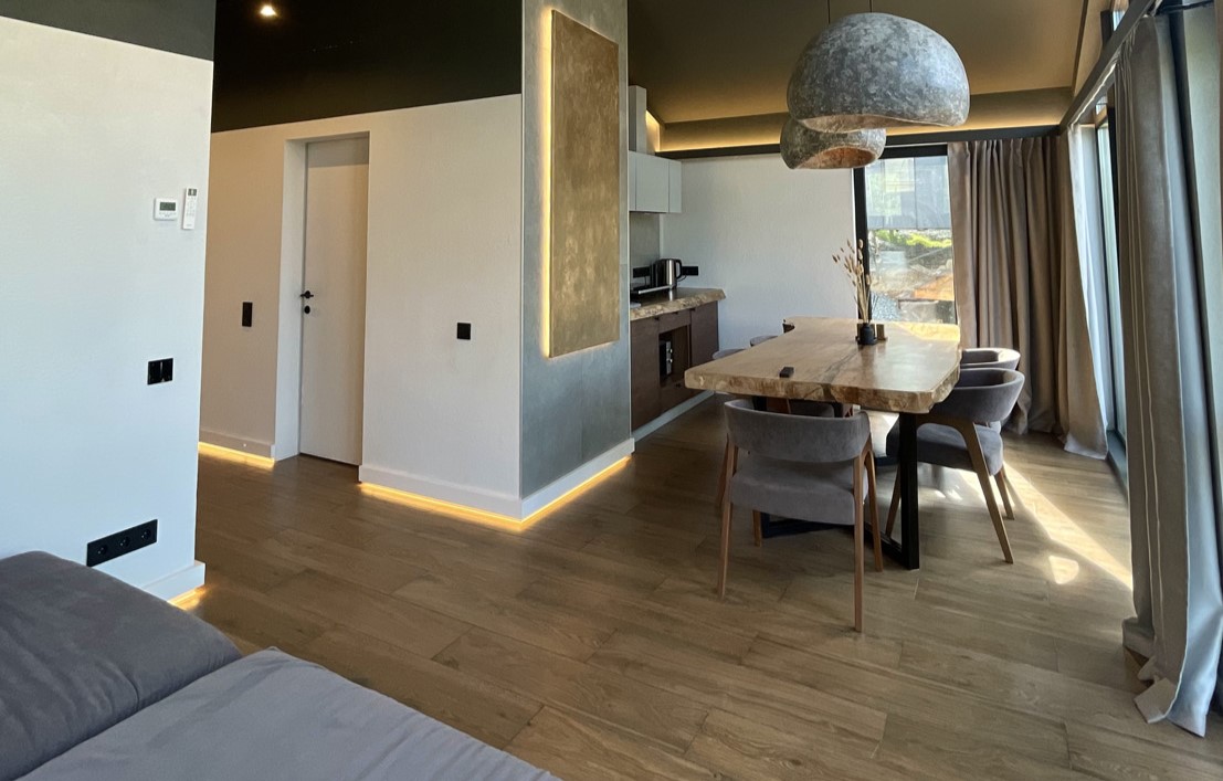 В номере: кровать двуспальная, кухонная мебель, прикроватные тумбочки, стол, стулья, шкаф, кондиционер, кофемашина, микроволновая печь, набор посуды, плита электрическая, телевизор, теплый пол, умная колонка, холодильник, электрочайник