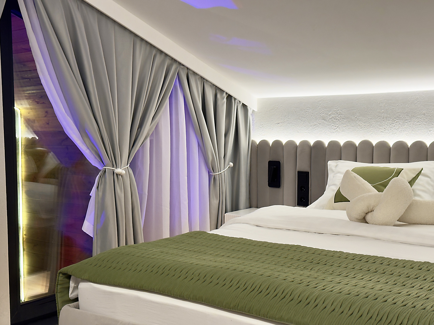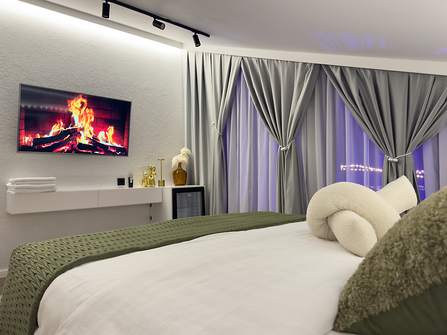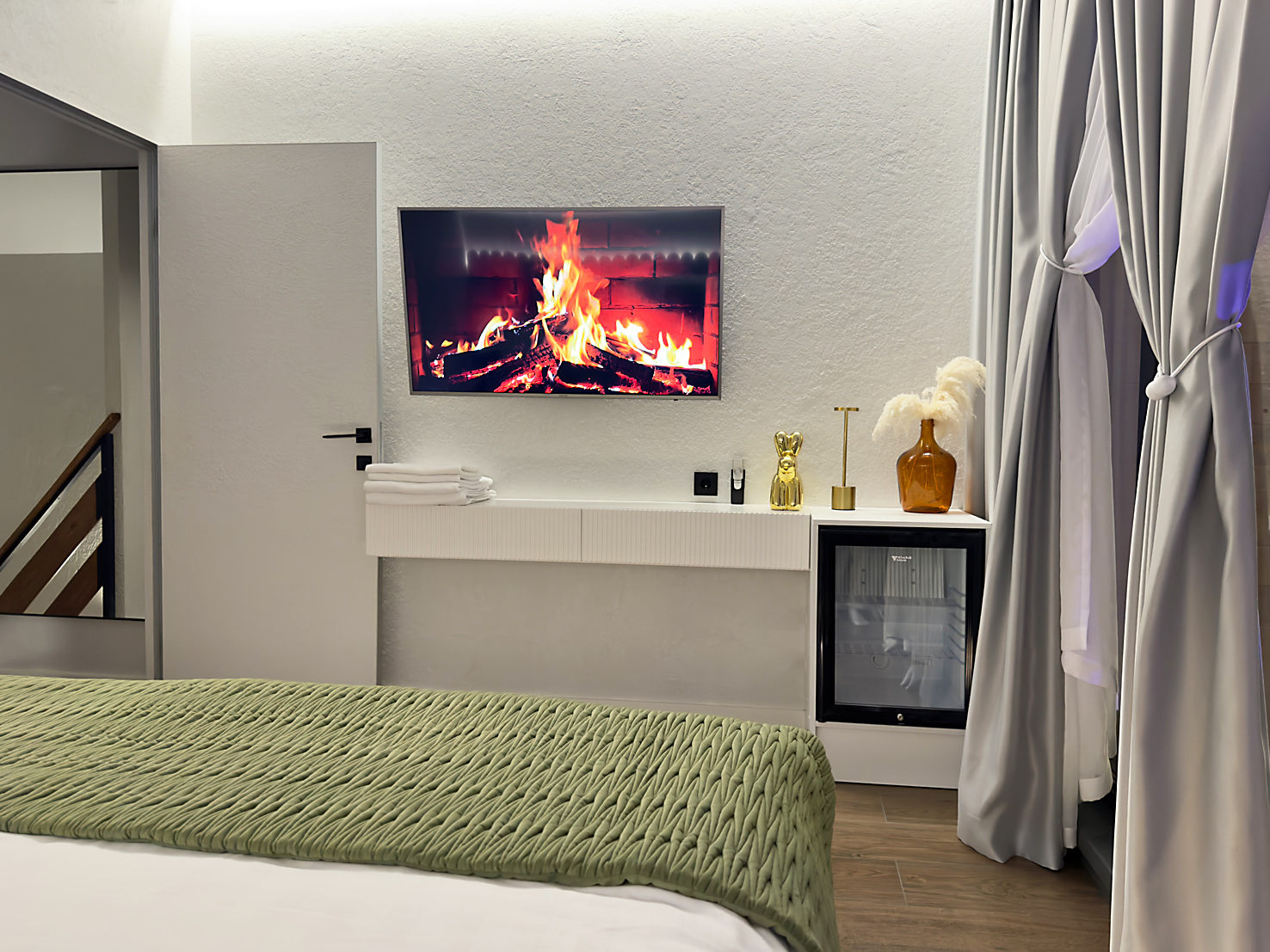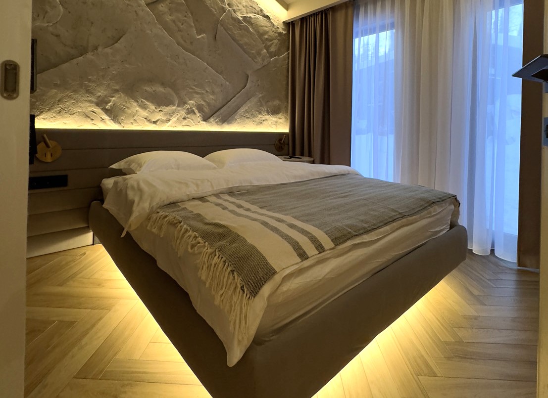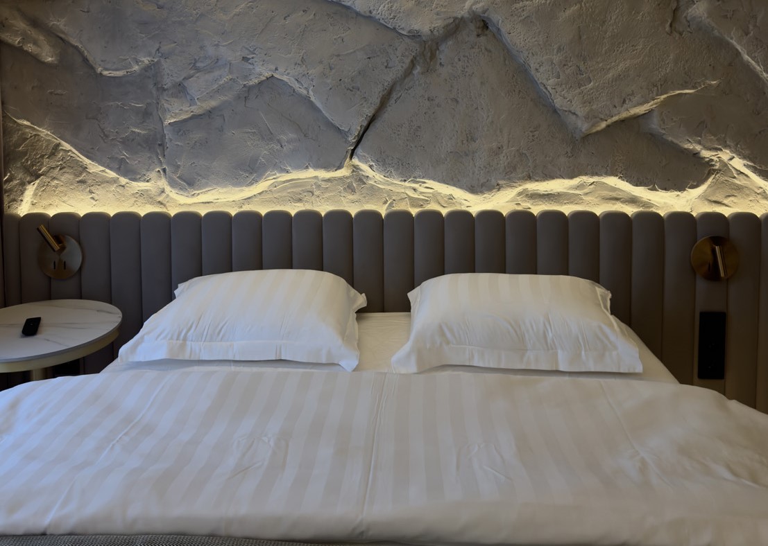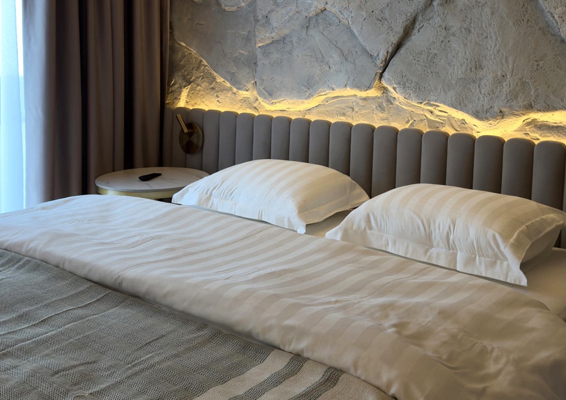 В номере: кровать двуспальная, кухонная мебель, прикроватные тумбочки, стол, стулья, шкаф, кондиционер, кофемашина, микроволновая печь, набор посуды, плита электрическая, телевизор, теплый пол, умная колонка, холодильник, электрочайник