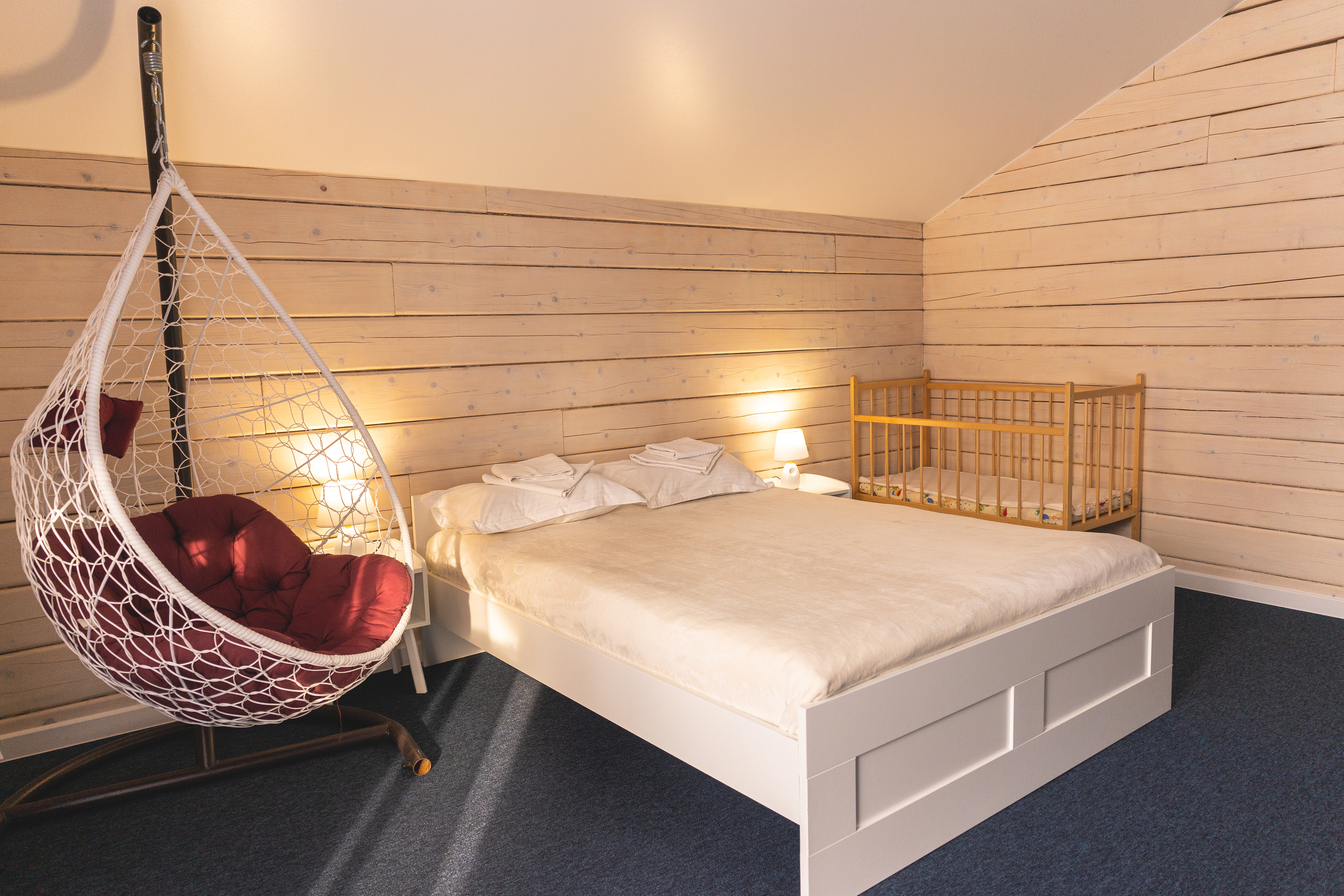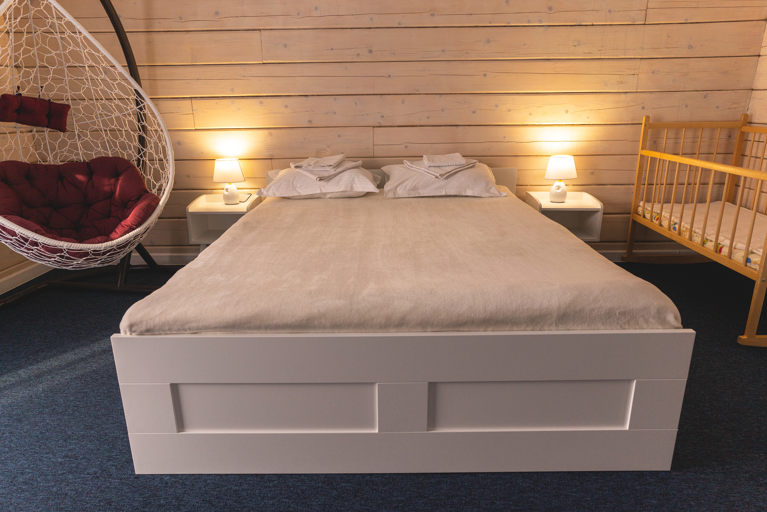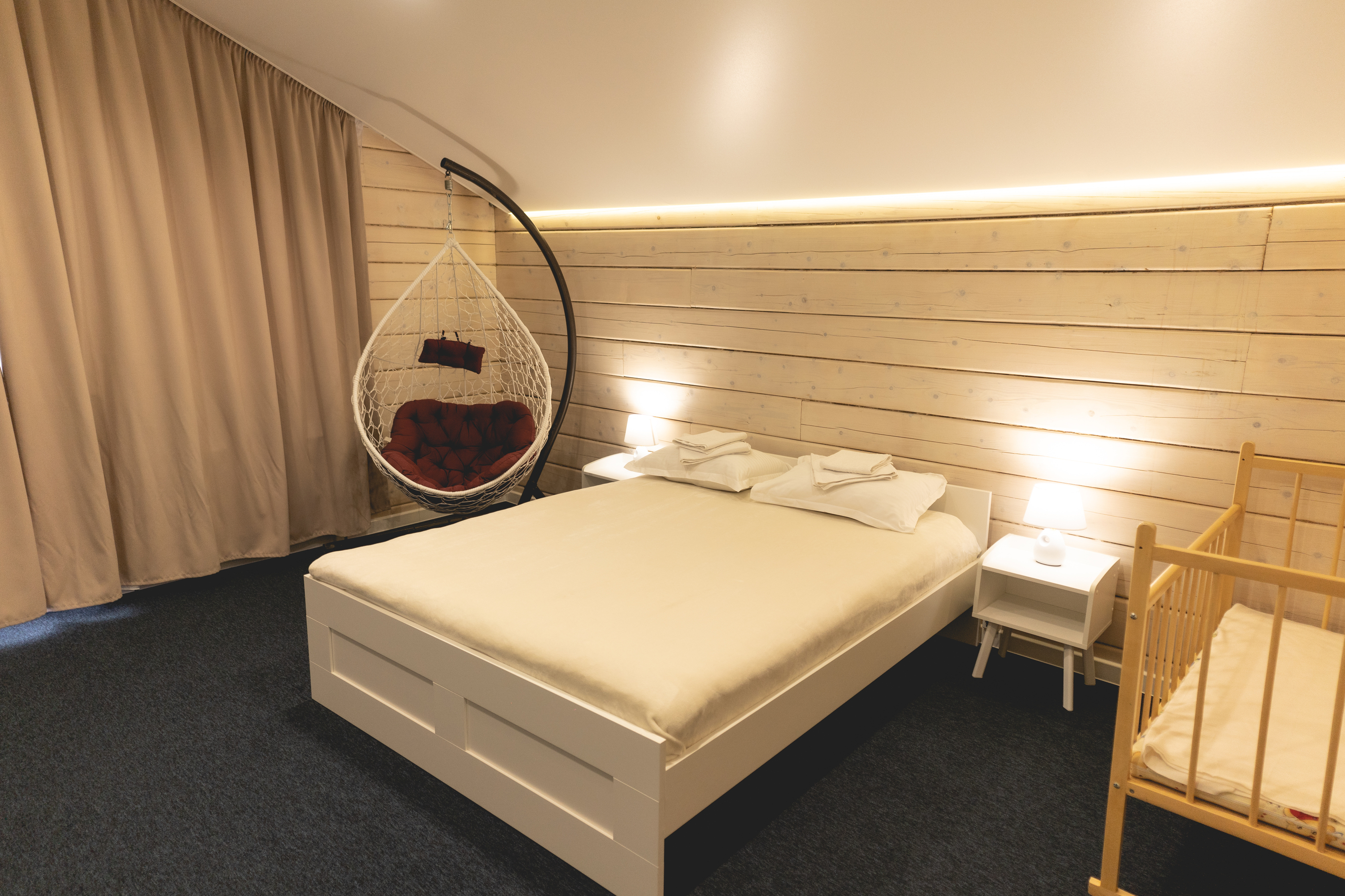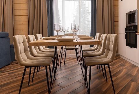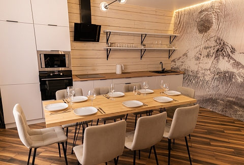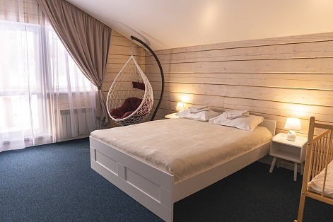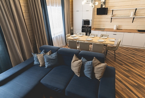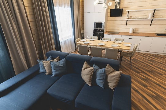 В номере: диван раскладной, кресло, кровати односпальные, кровать двуспальная, кухонная мебель, прикроватные тумбочки, стол, стулья, шкаф, духовой шкаф, лыжехранилище, микроволновая печь, набор посуды, плита электрическая, посудомоечная машина, стиральная машина, телевизор, утюг, холодильник, электрочайник