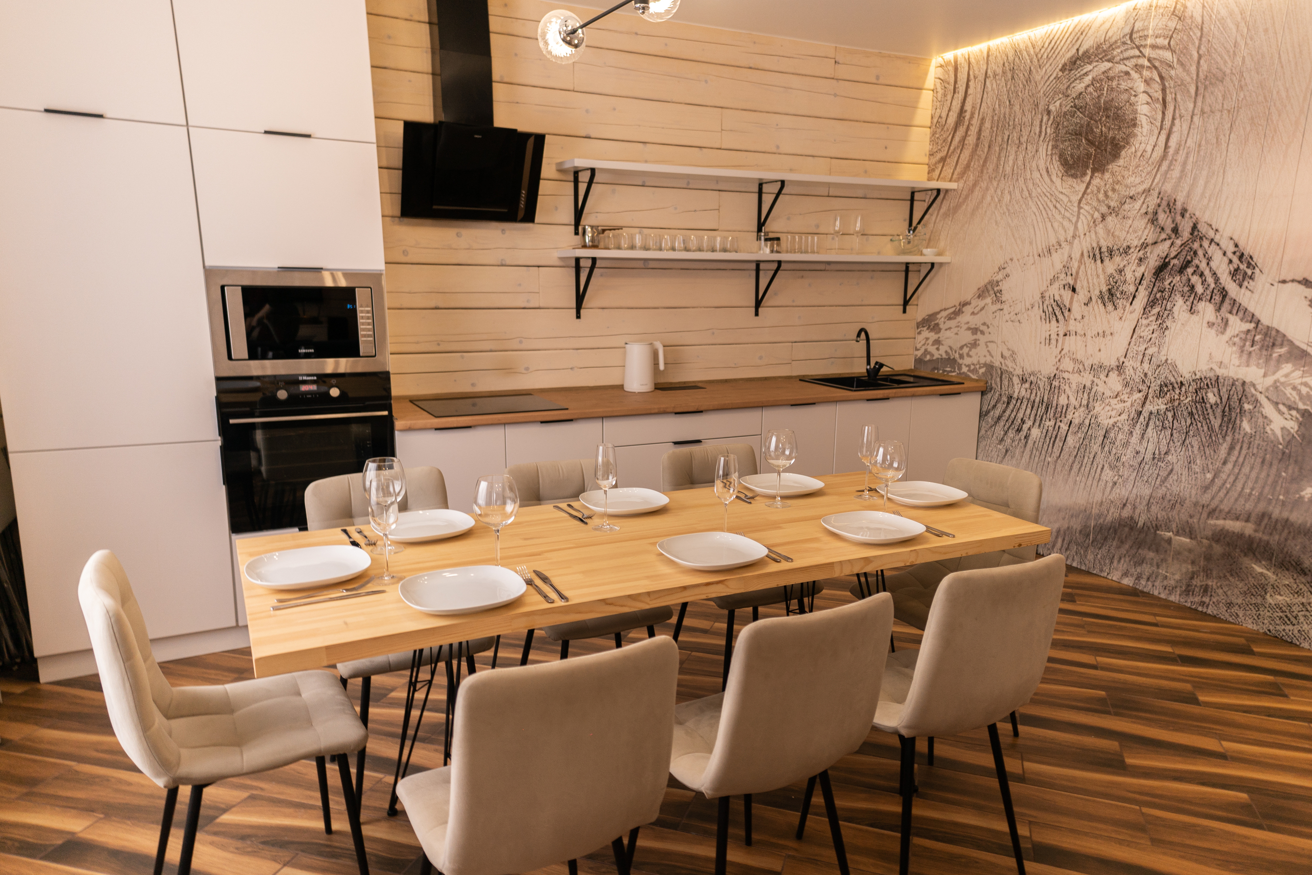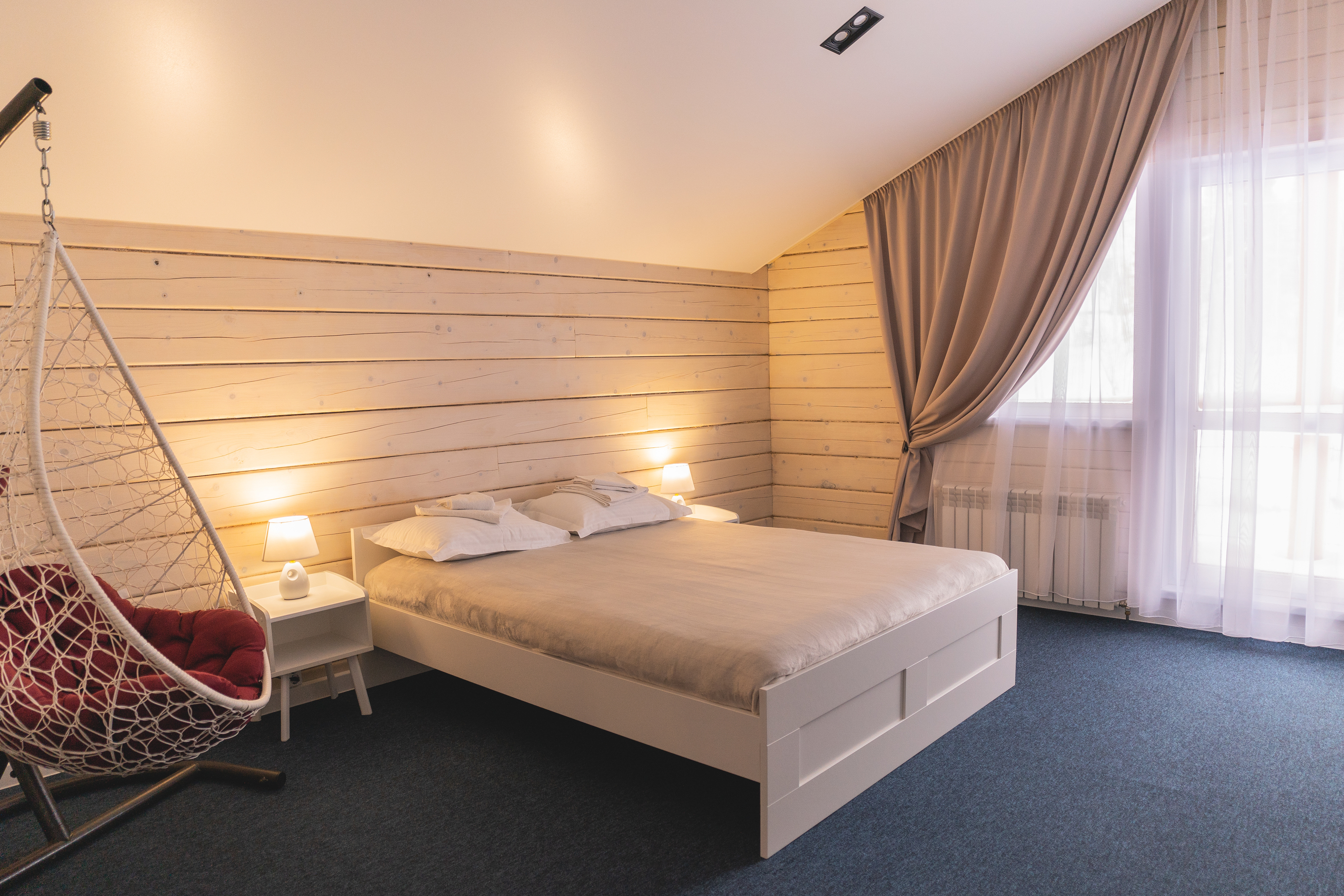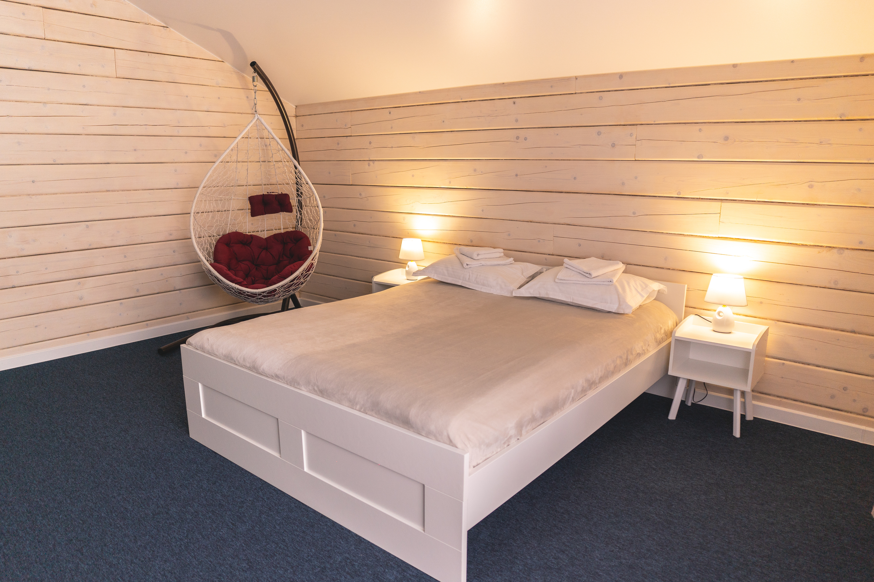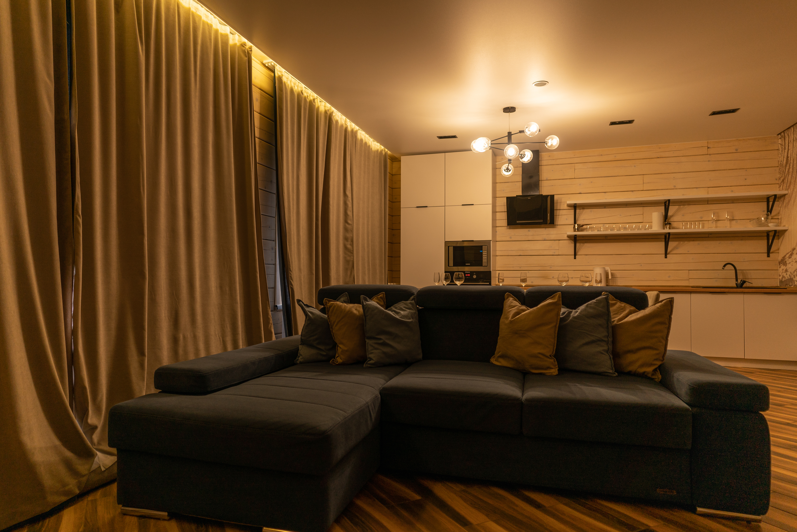 В номере: диван раскладной, кресло, кровати односпальные, кровать двуспальная, кухонная мебель, прикроватные тумбочки, стол, стулья, шкаф, духовой шкаф, лыжехранилище, микроволновая печь, набор посуды, плита электрическая, посудомоечная машина, стиральная машина, телевизор, утюг, холодильник, электрочайник