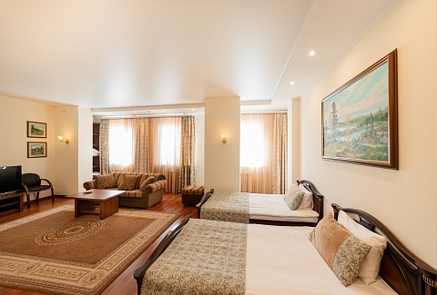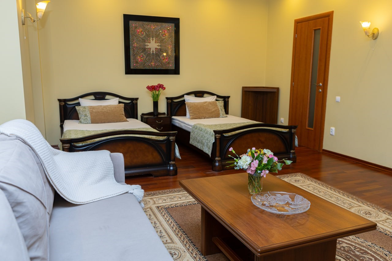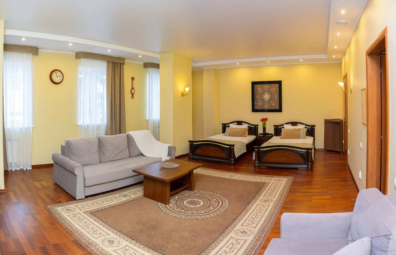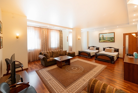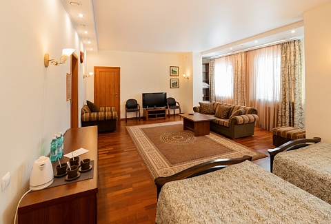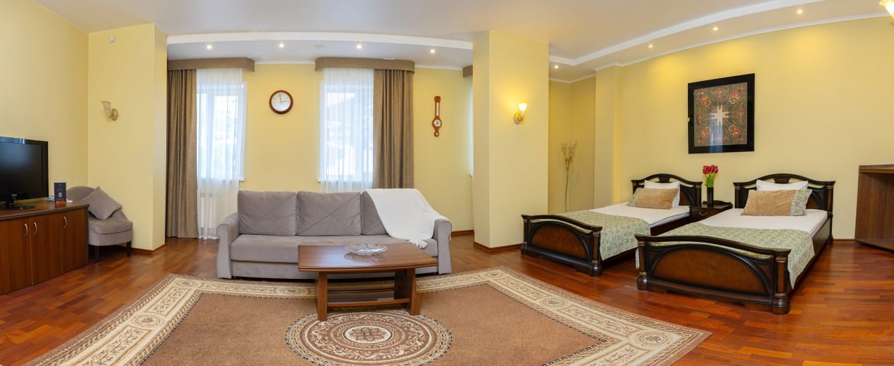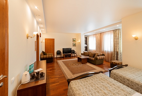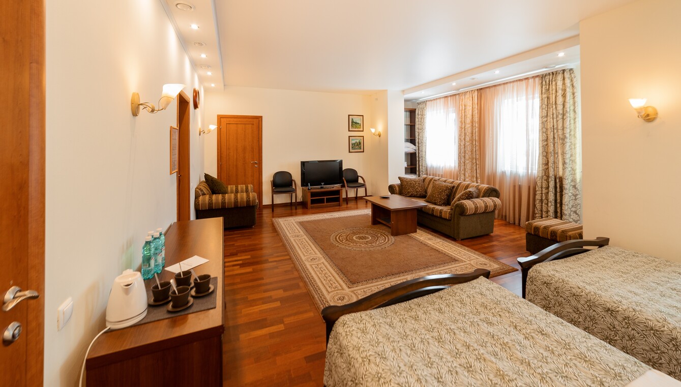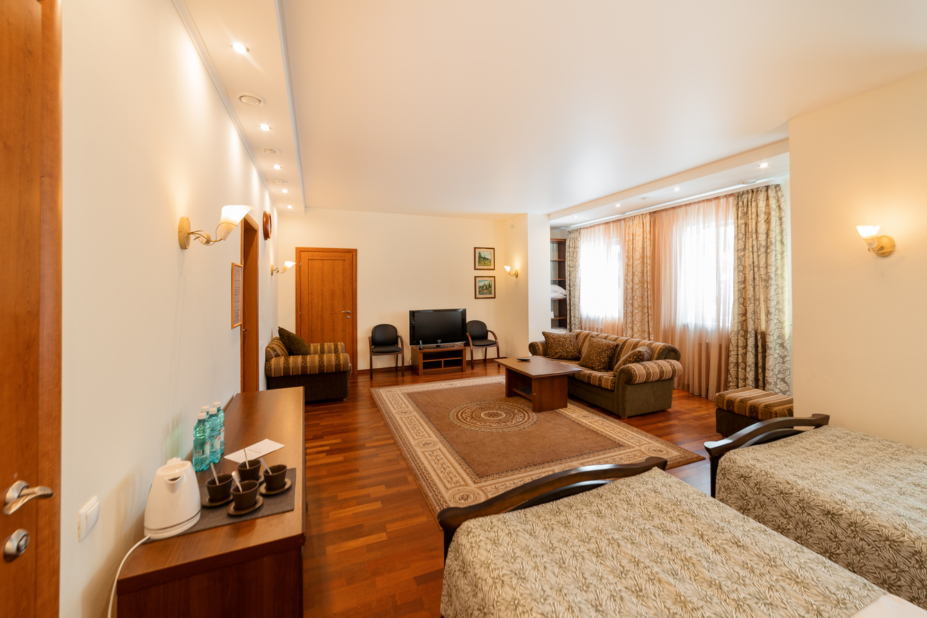 В номере: диван раскладной, кровати полутороспальные, прикроватные тумбочки, стол, шкаф, сейф, телевизор, холодильник