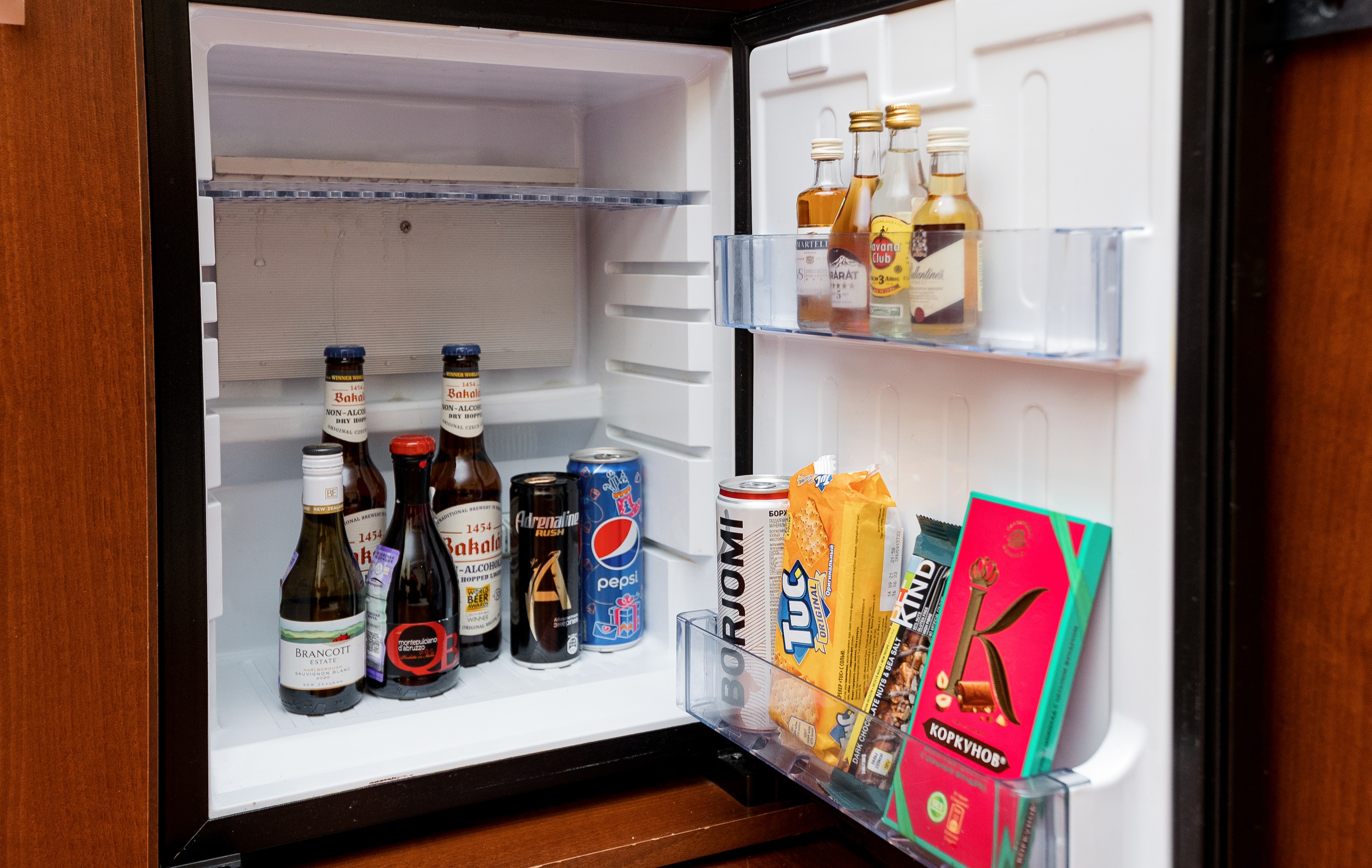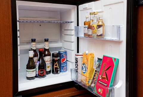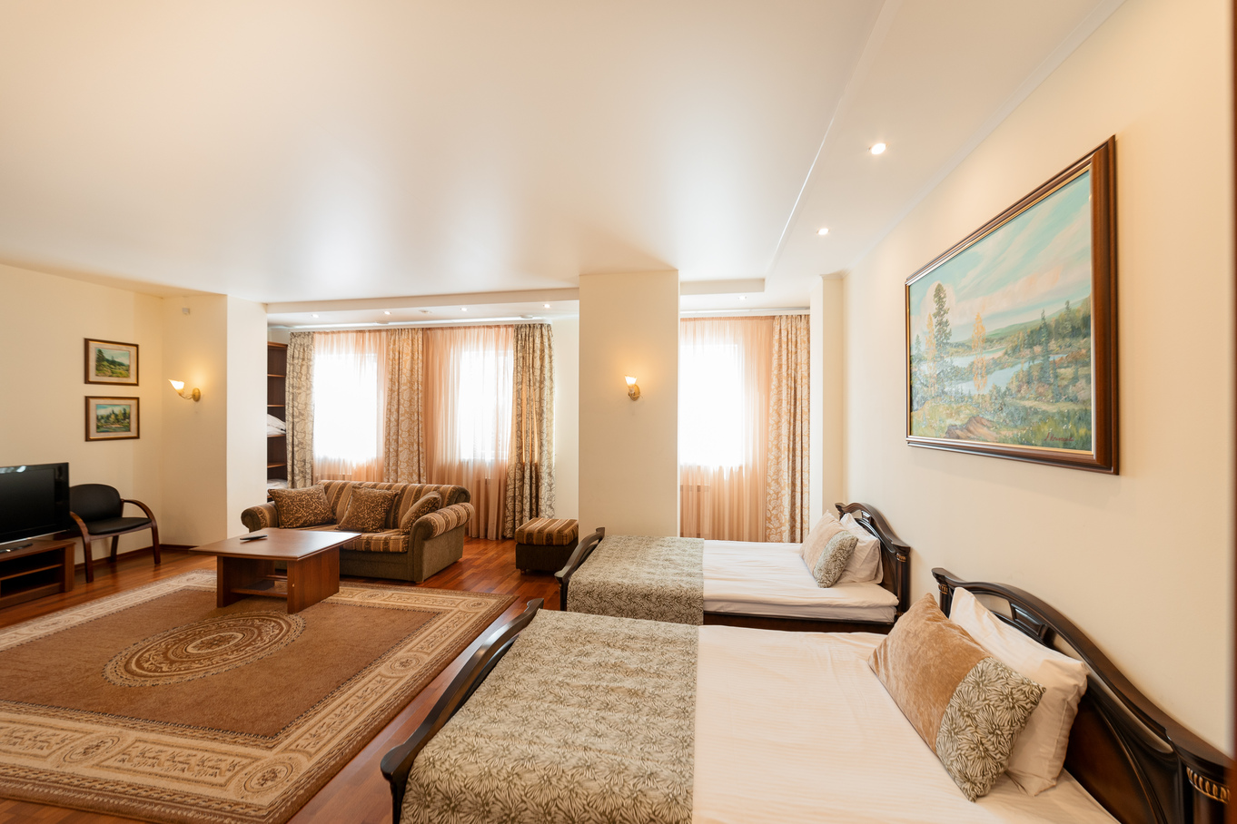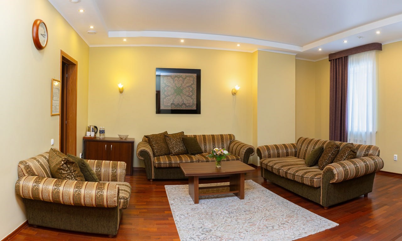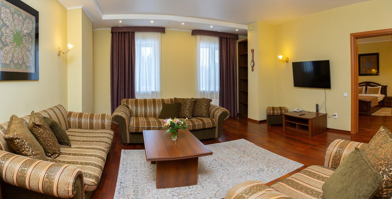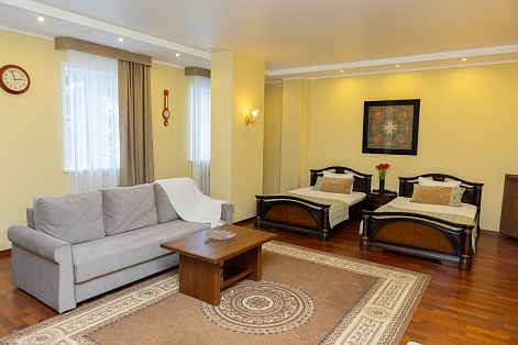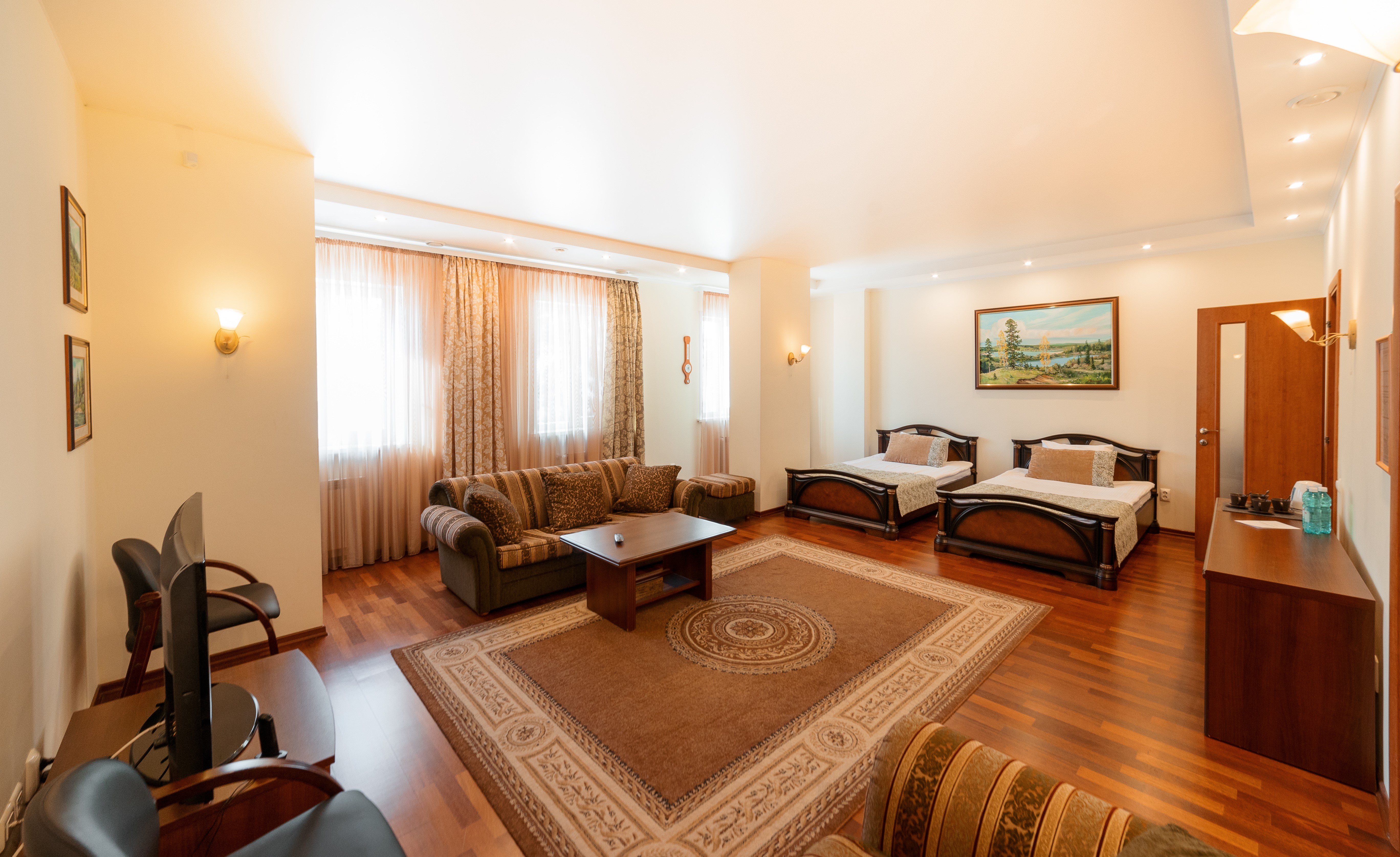 В номере: диван раскладной, кровати полутороспальные, прикроватные тумбочки, стол, шкаф, сейф, телевизор, холодильник