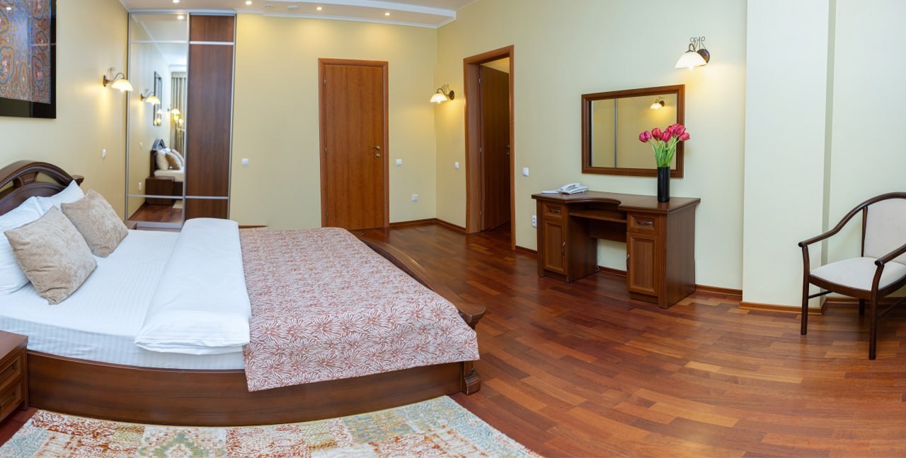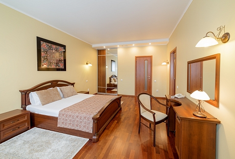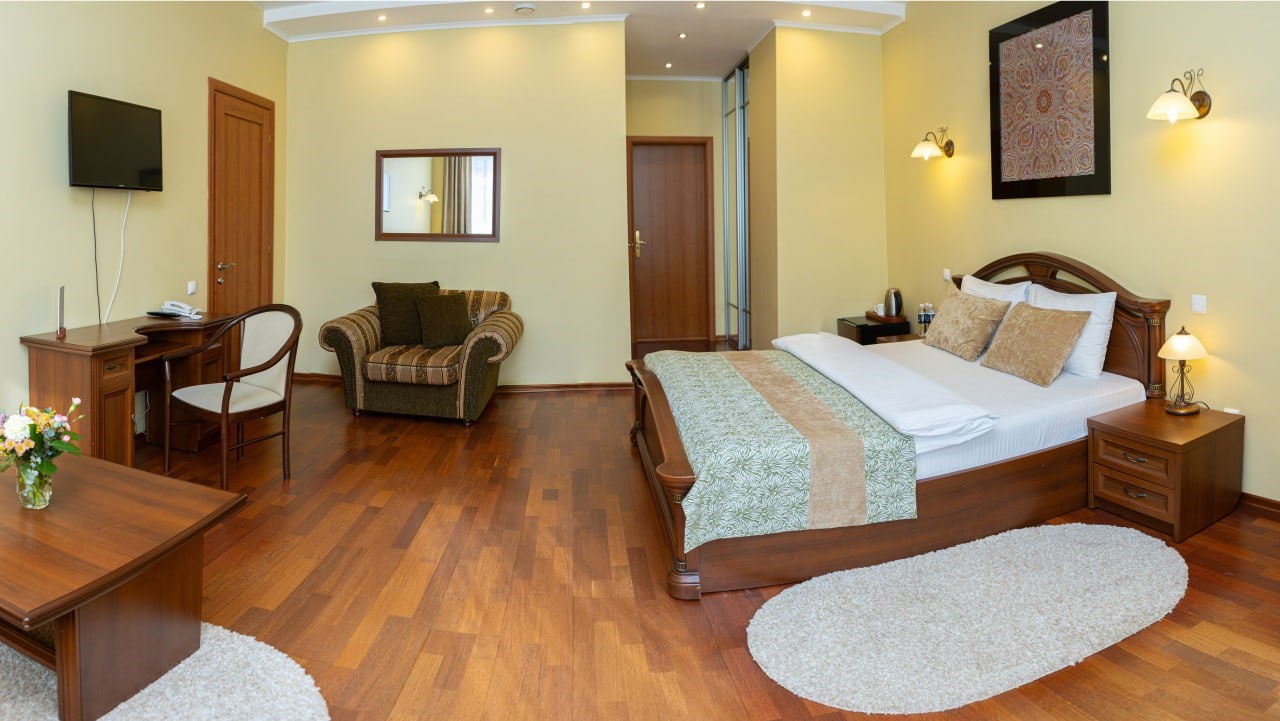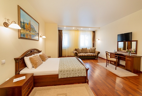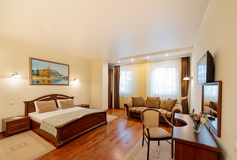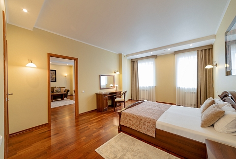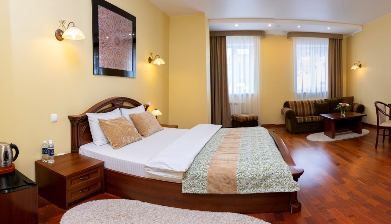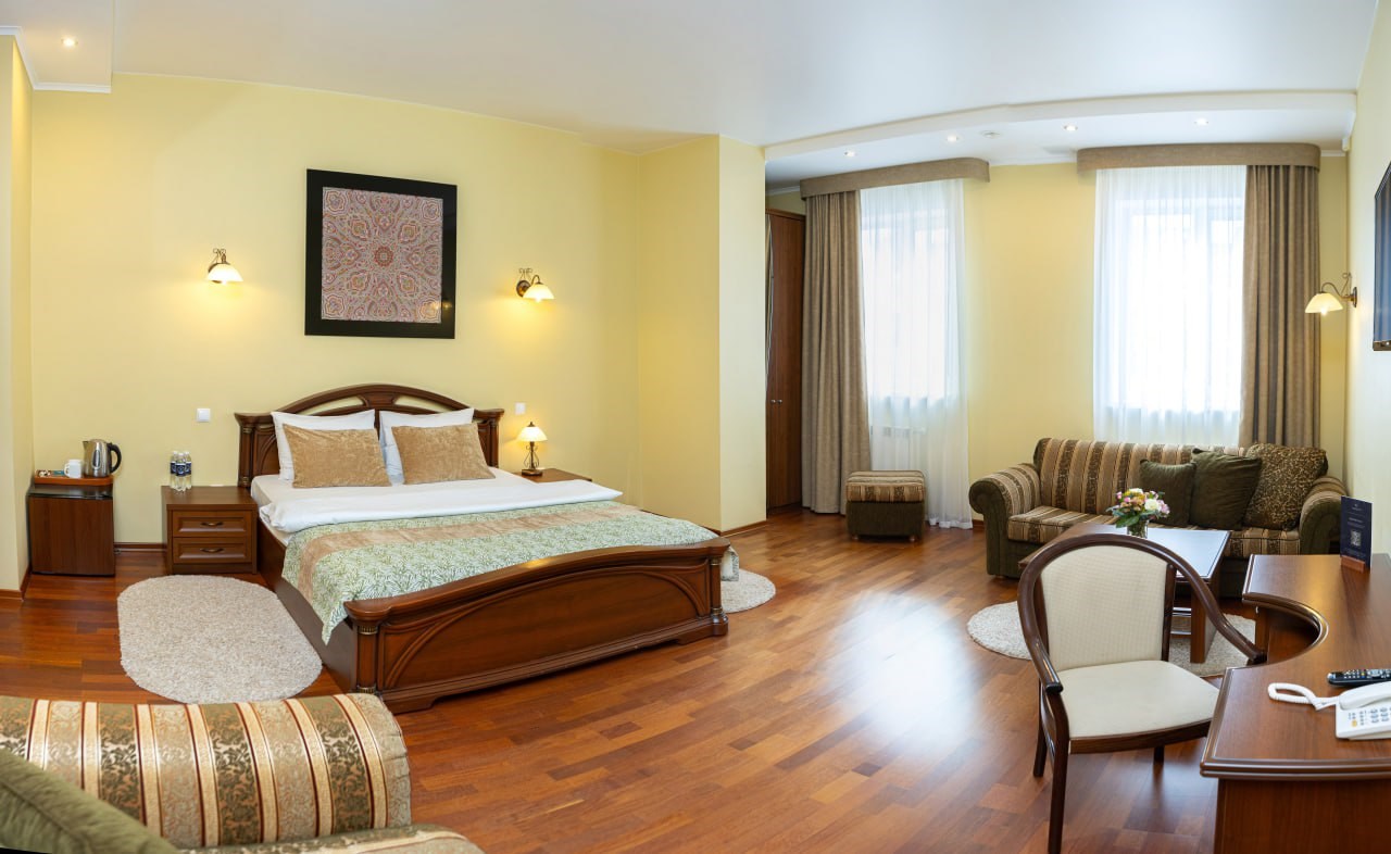 В номере: диван, кресло, кровать двуспальная, прикроватные тумбочки, стол, столик журнальный, стул, шкаф, сейф, телевизор, холодильник