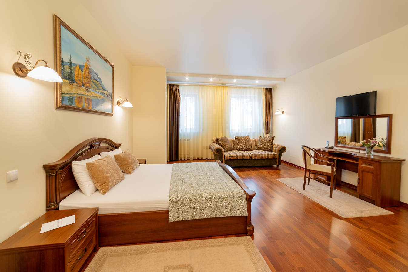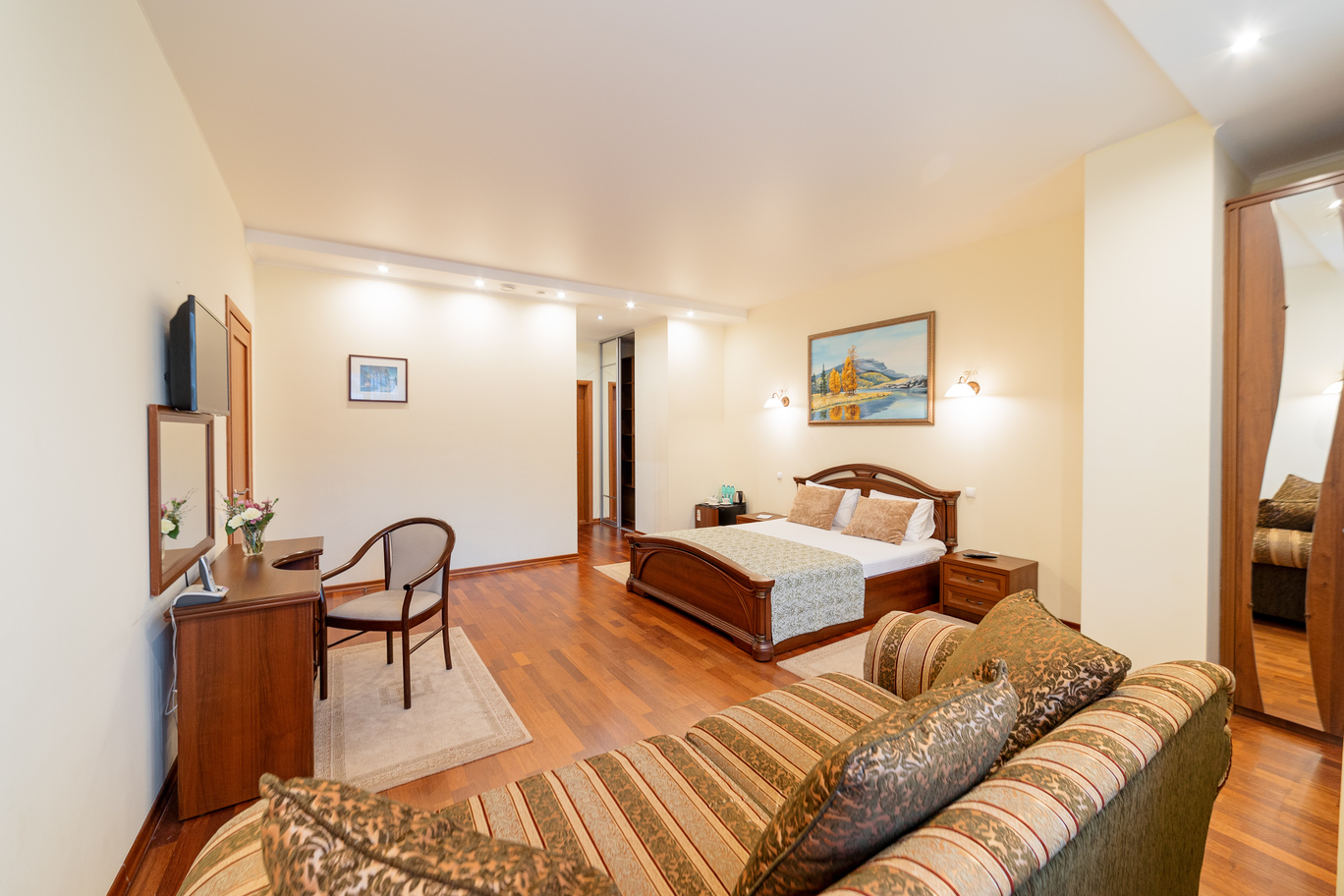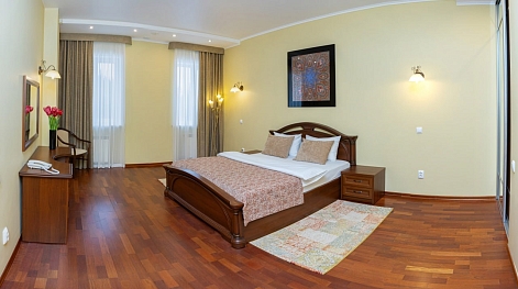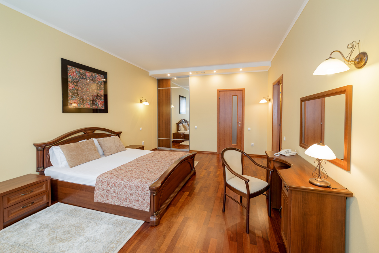 В номере: диван, кресло, кровать двуспальная, прикроватные тумбочки, стол, столик журнальный, стул, шкаф, сейф, телевизор, холодильник