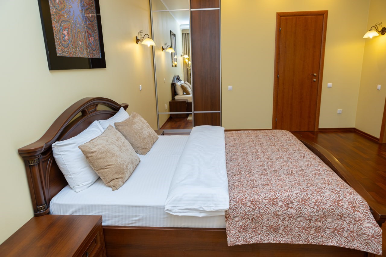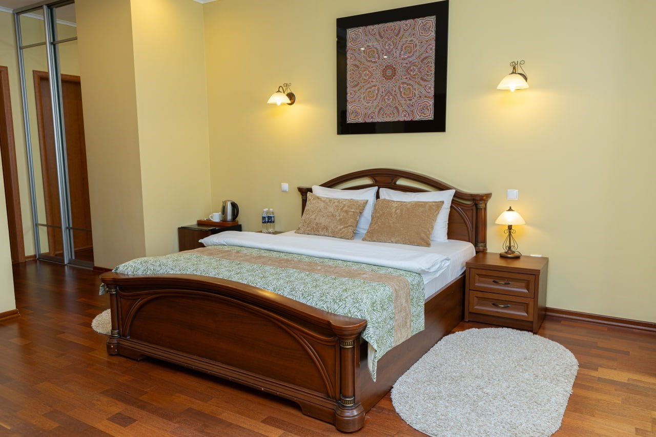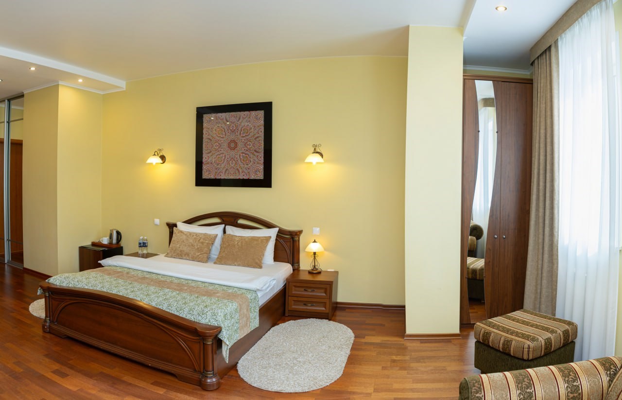 В номере: диван, кровать двуспальная, прикроватные тумбочки, шкаф, сейф, телевизор, холодильник