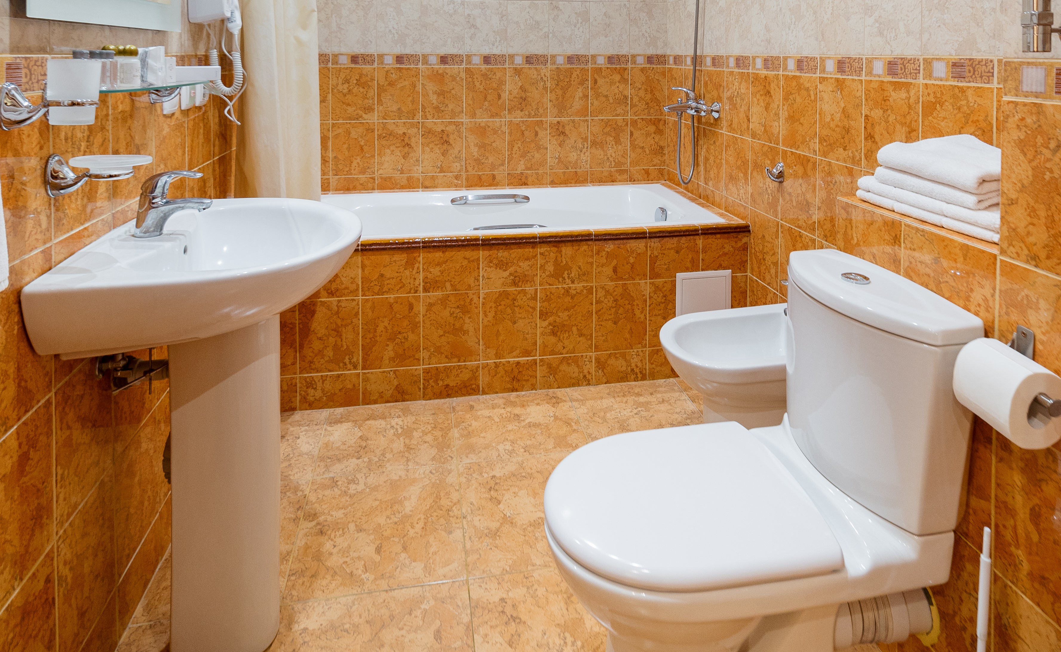 Санузел: биде, с ванной, туалетные принадлежности, фен