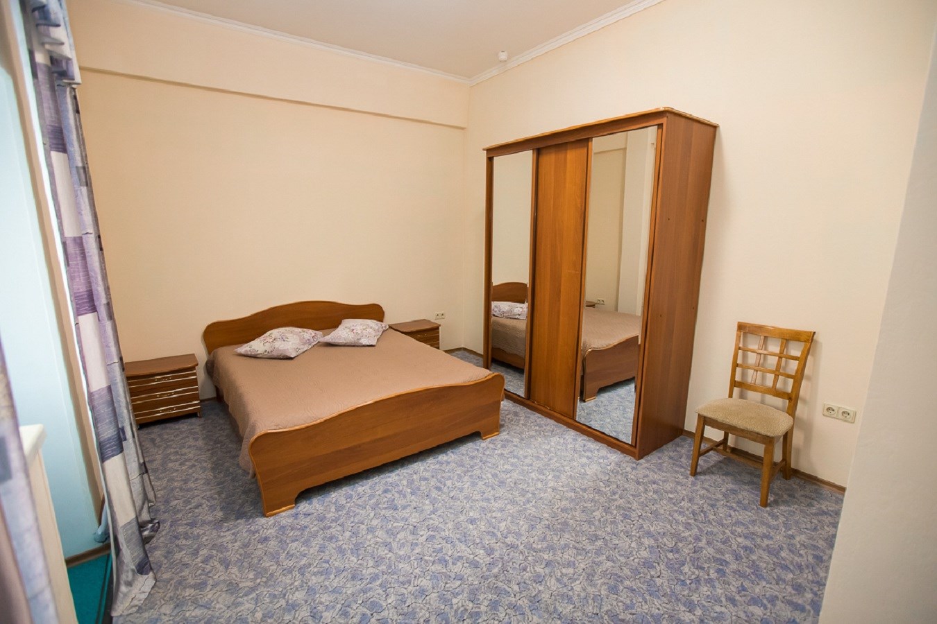 В номере: вешалка, диван раскладной, зеркало, кровать двуспальная, стол, стулья, шкаф, телевизор, холодильник