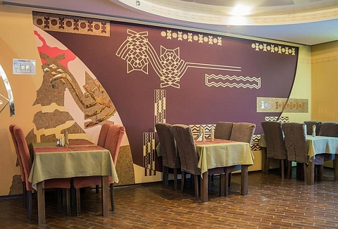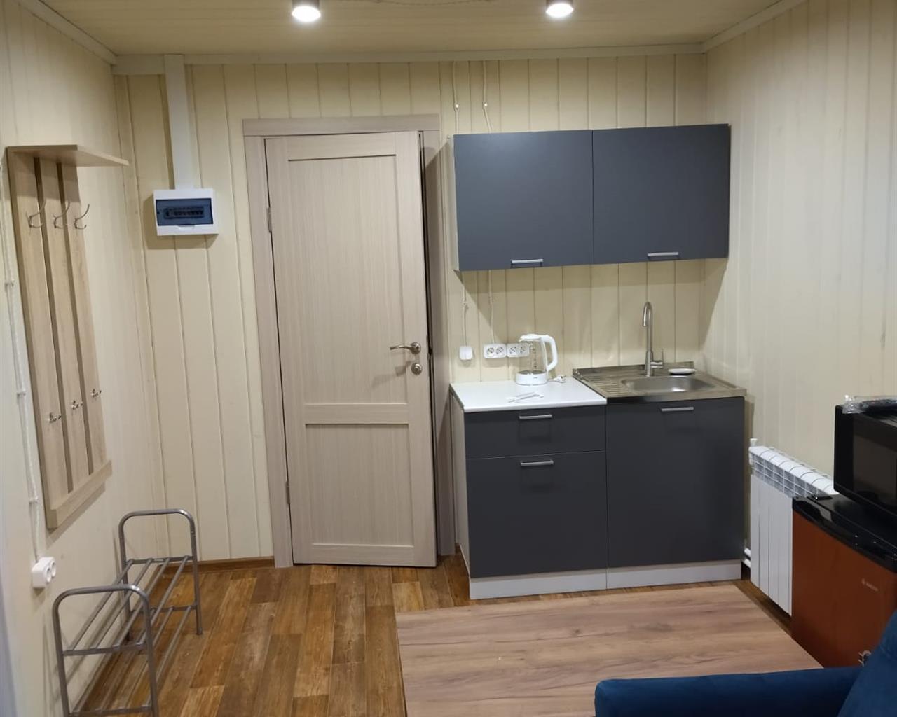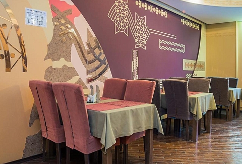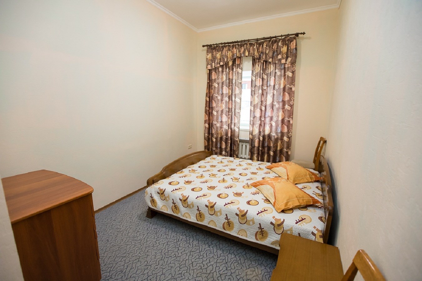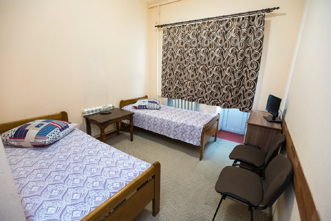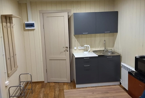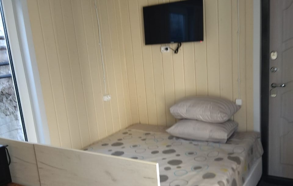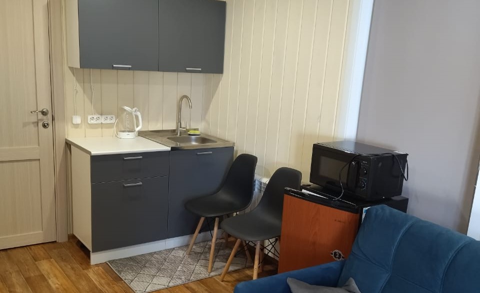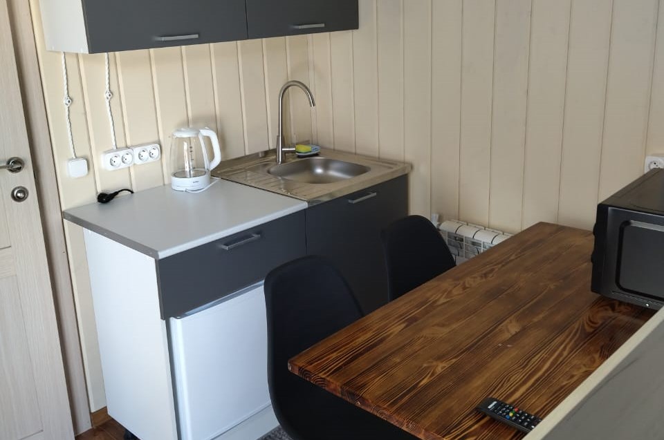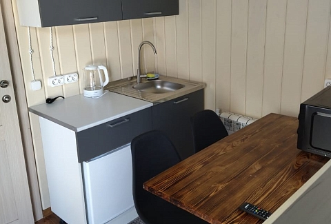 В номере: вешалка, кровать двуспальная, стол, стулья, микроволновая печь, мини-холодильник, набор посуды, телевизор ЖК, электрочайник
