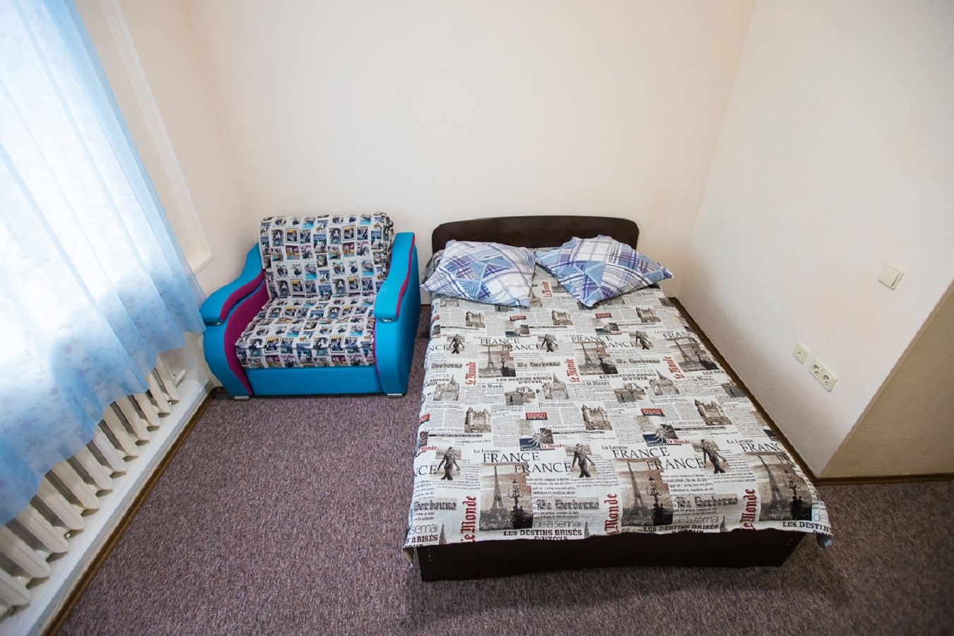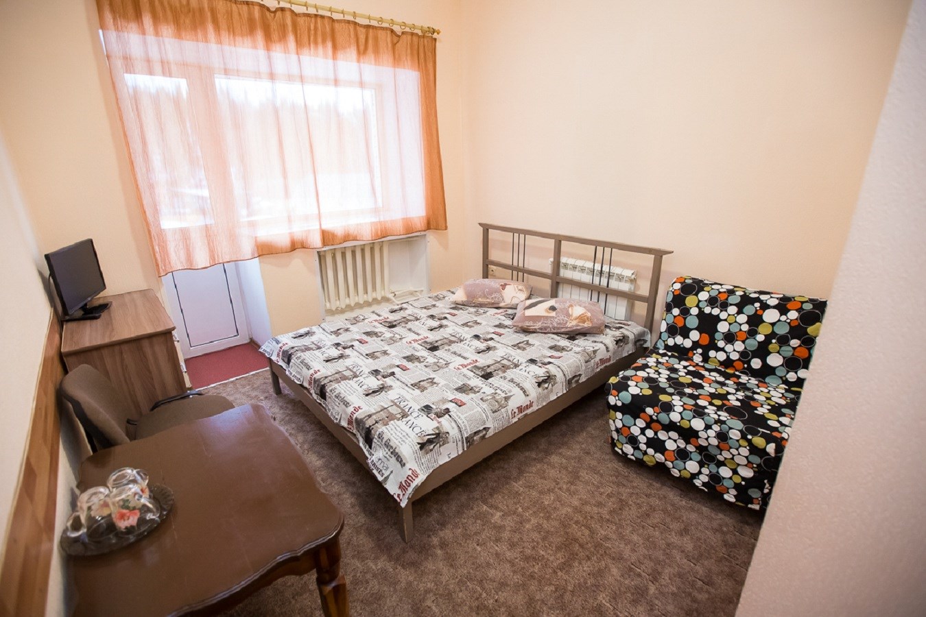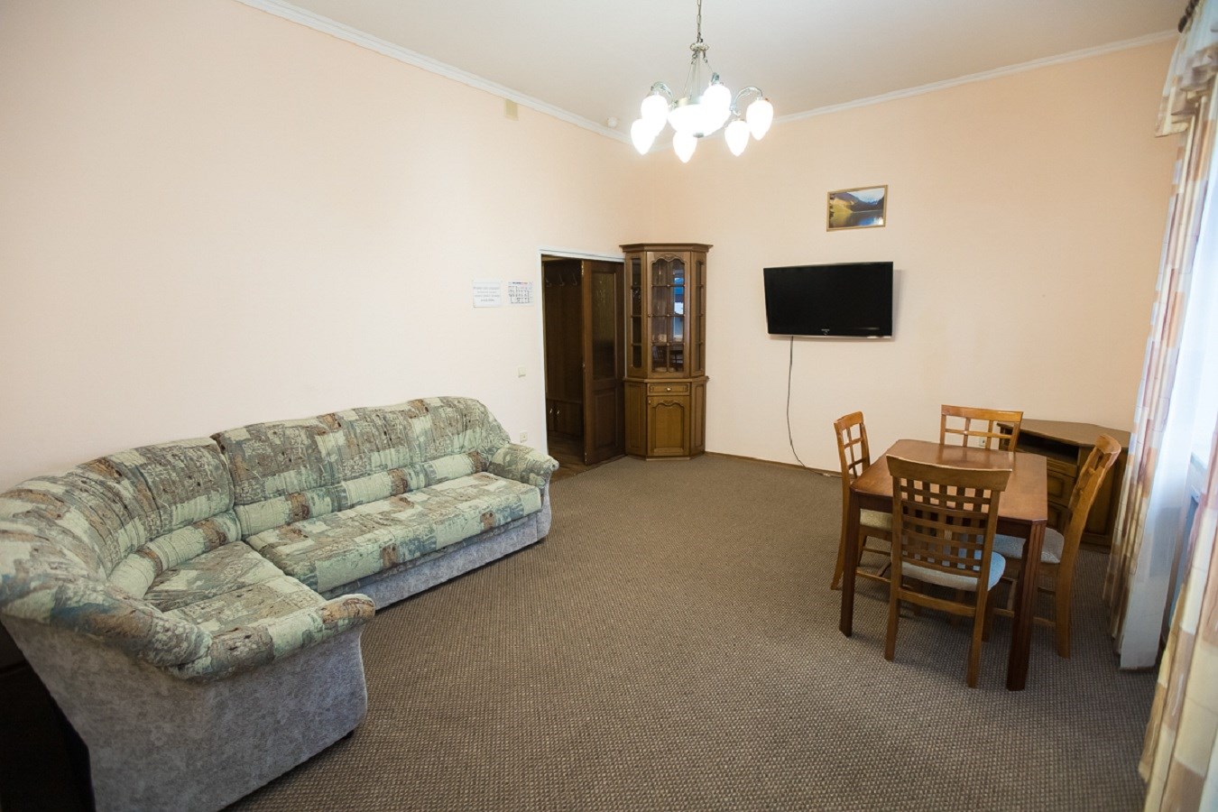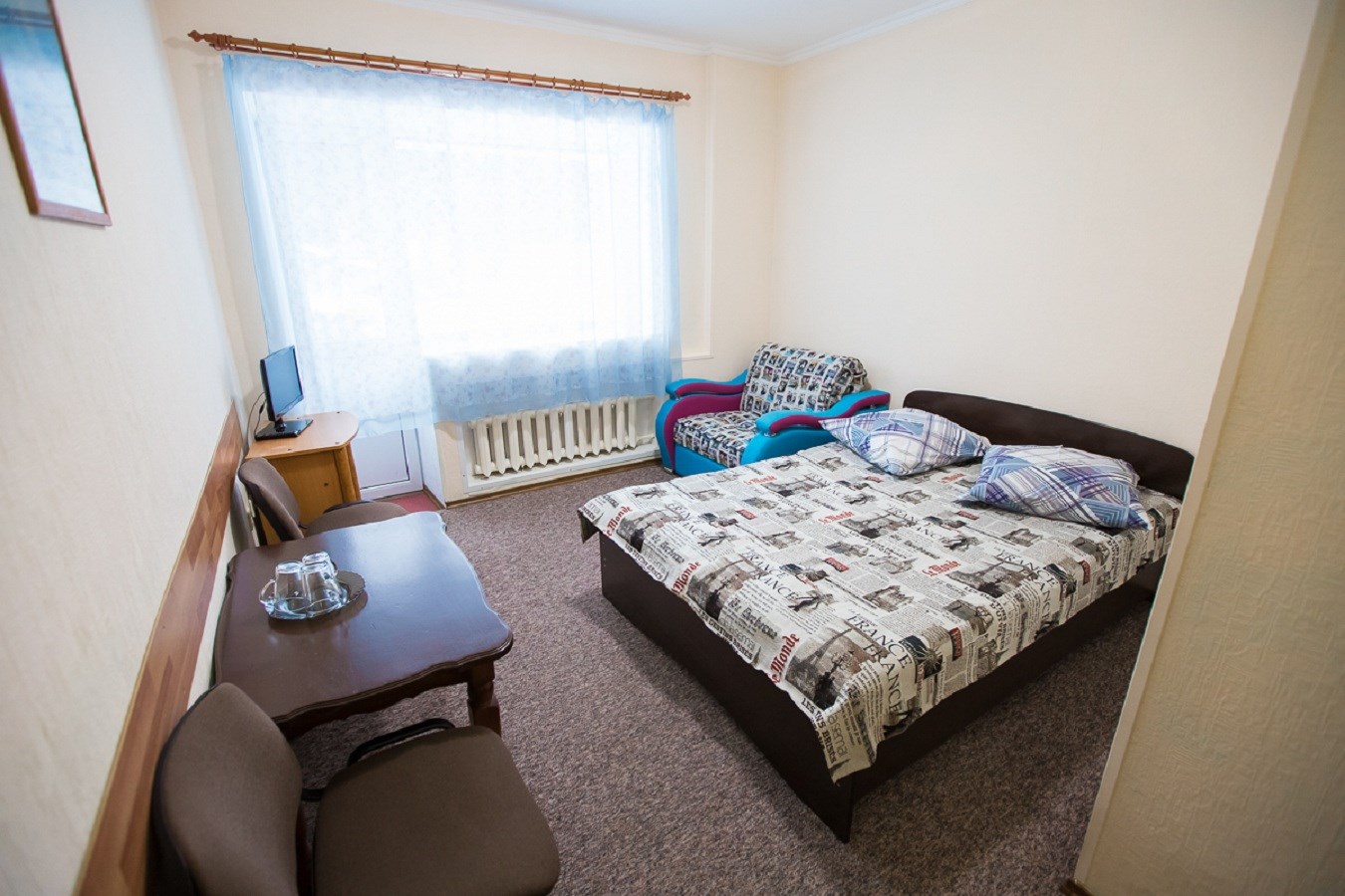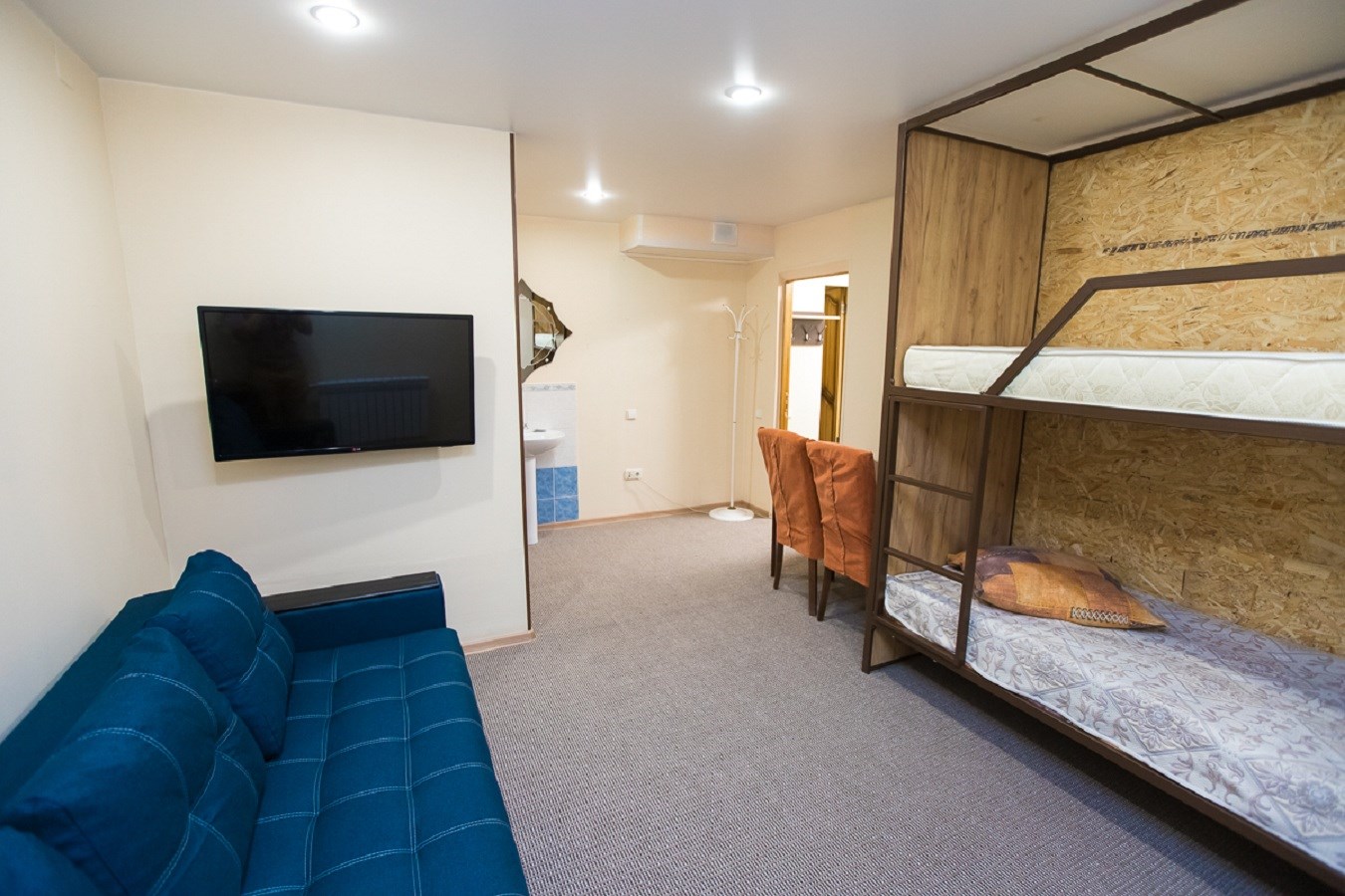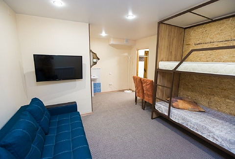 В номере: вешалка, диван, зеркало, кресла, кровать двухъярусная, стол, стулья, шкаф, набор посуды, телевизор, холодильник