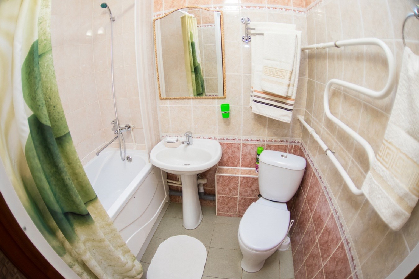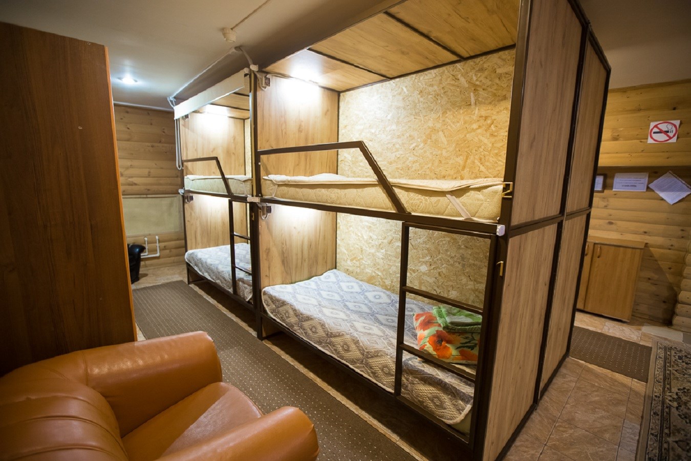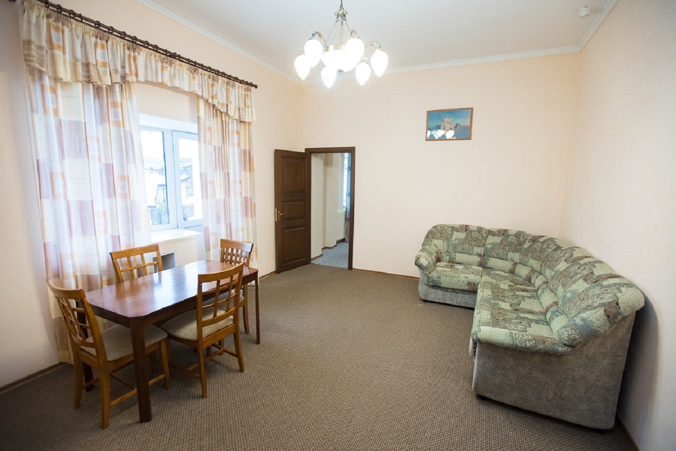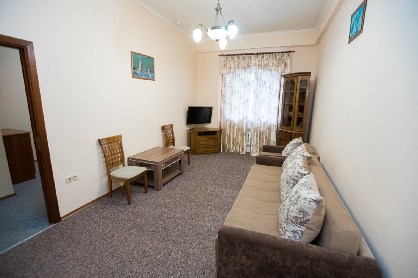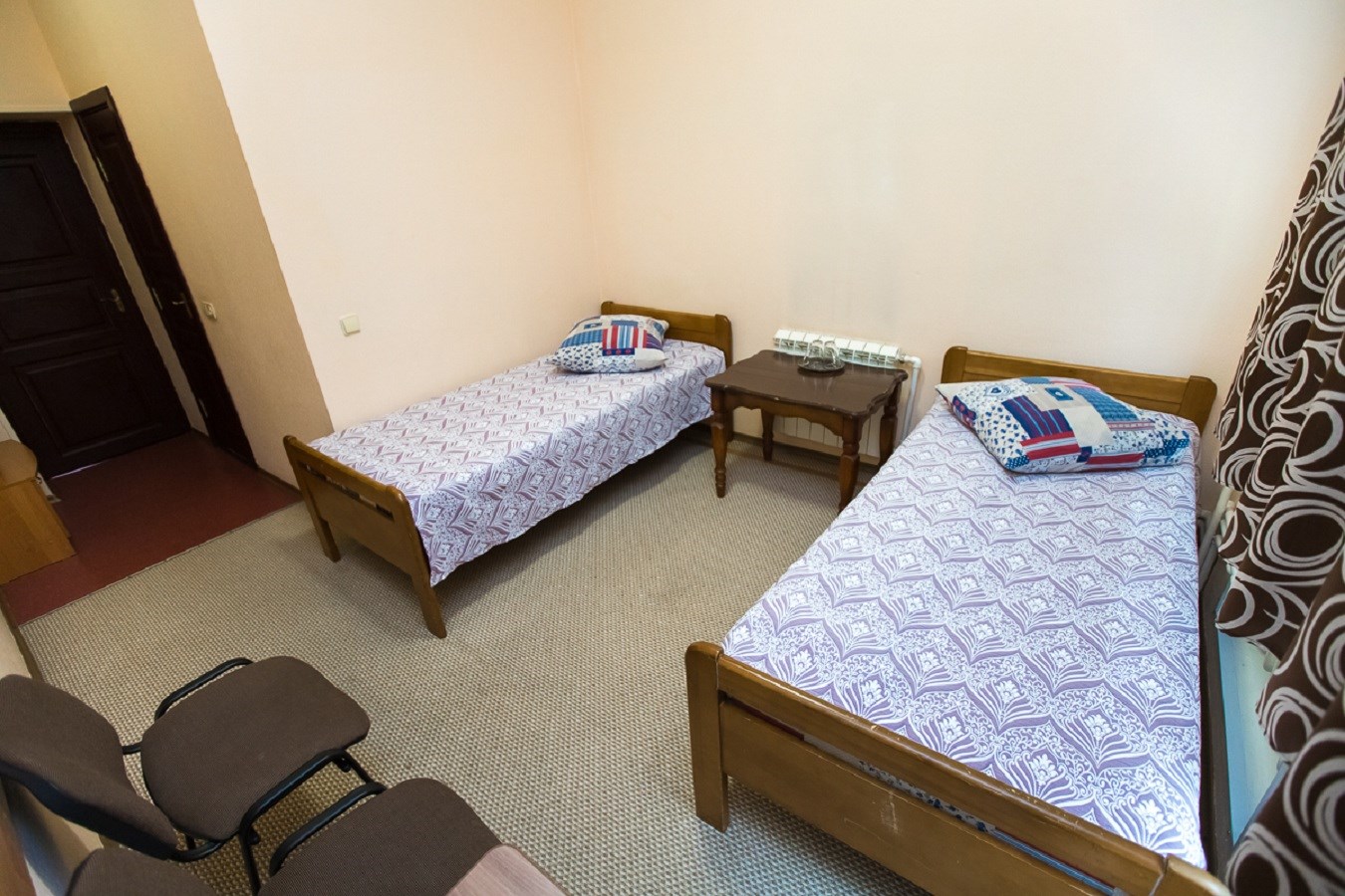 В номере: вешалка, диван, зеркало, кресла, кровать двухъярусная, стол, стулья, шкаф, набор посуды, телевизор, холодильник