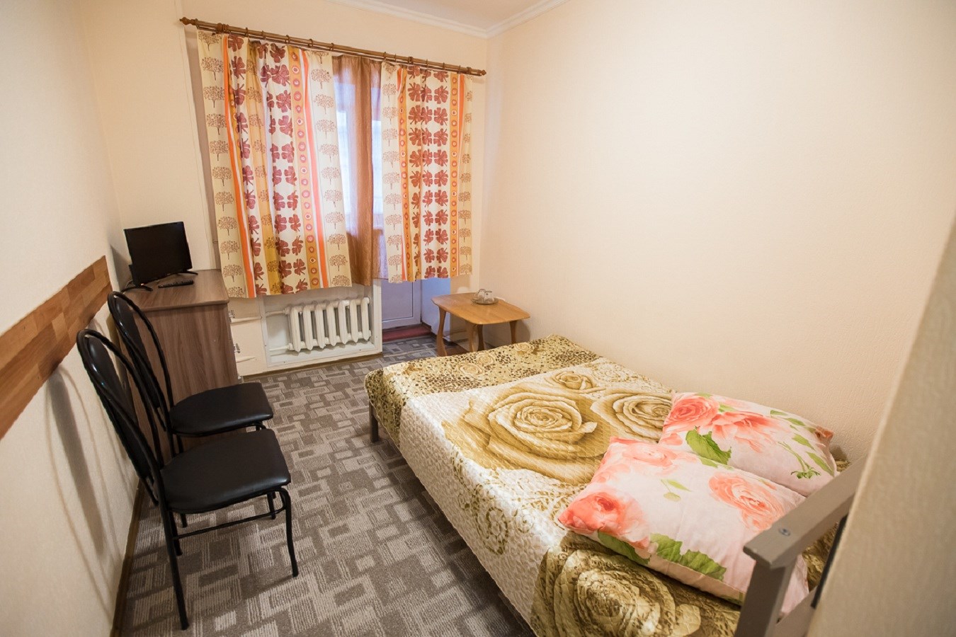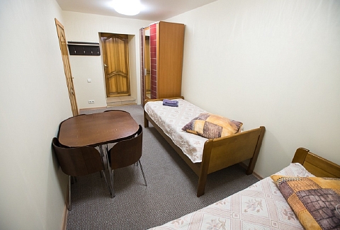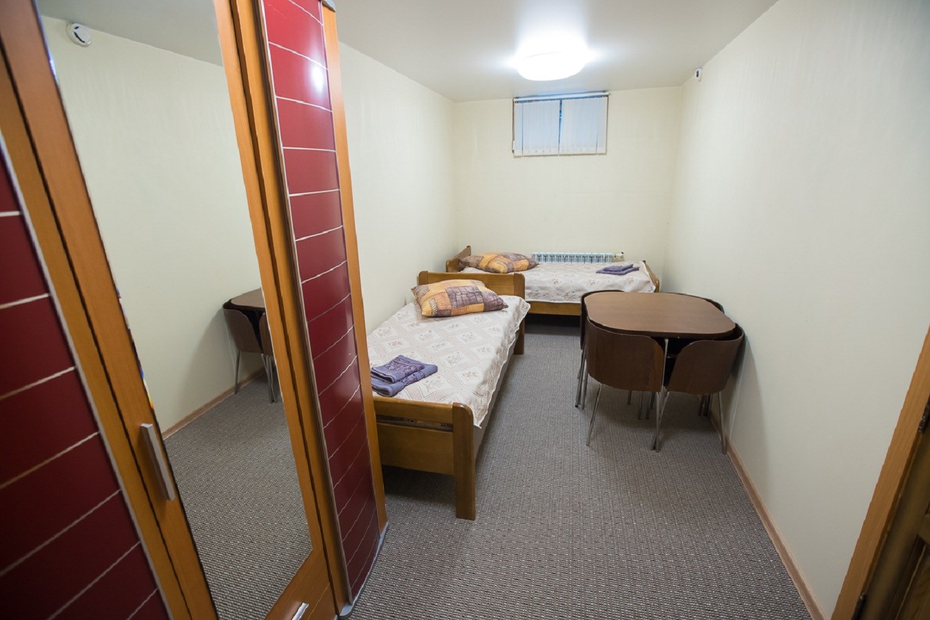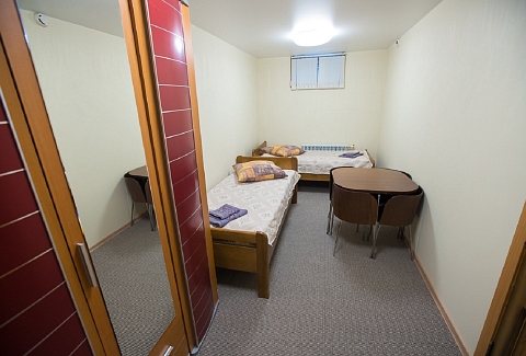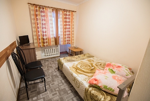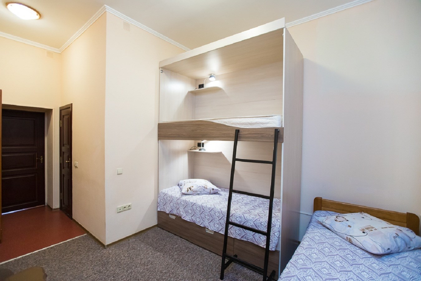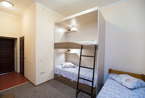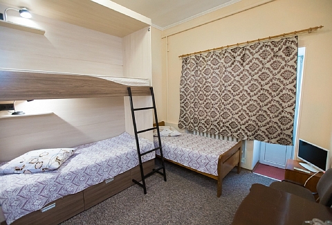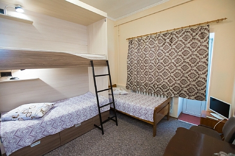 В номере: вешалка, зеркало, кровать двухъярусная, кровать односпальная, стол, стулья, шкаф, телевизор, холодильник