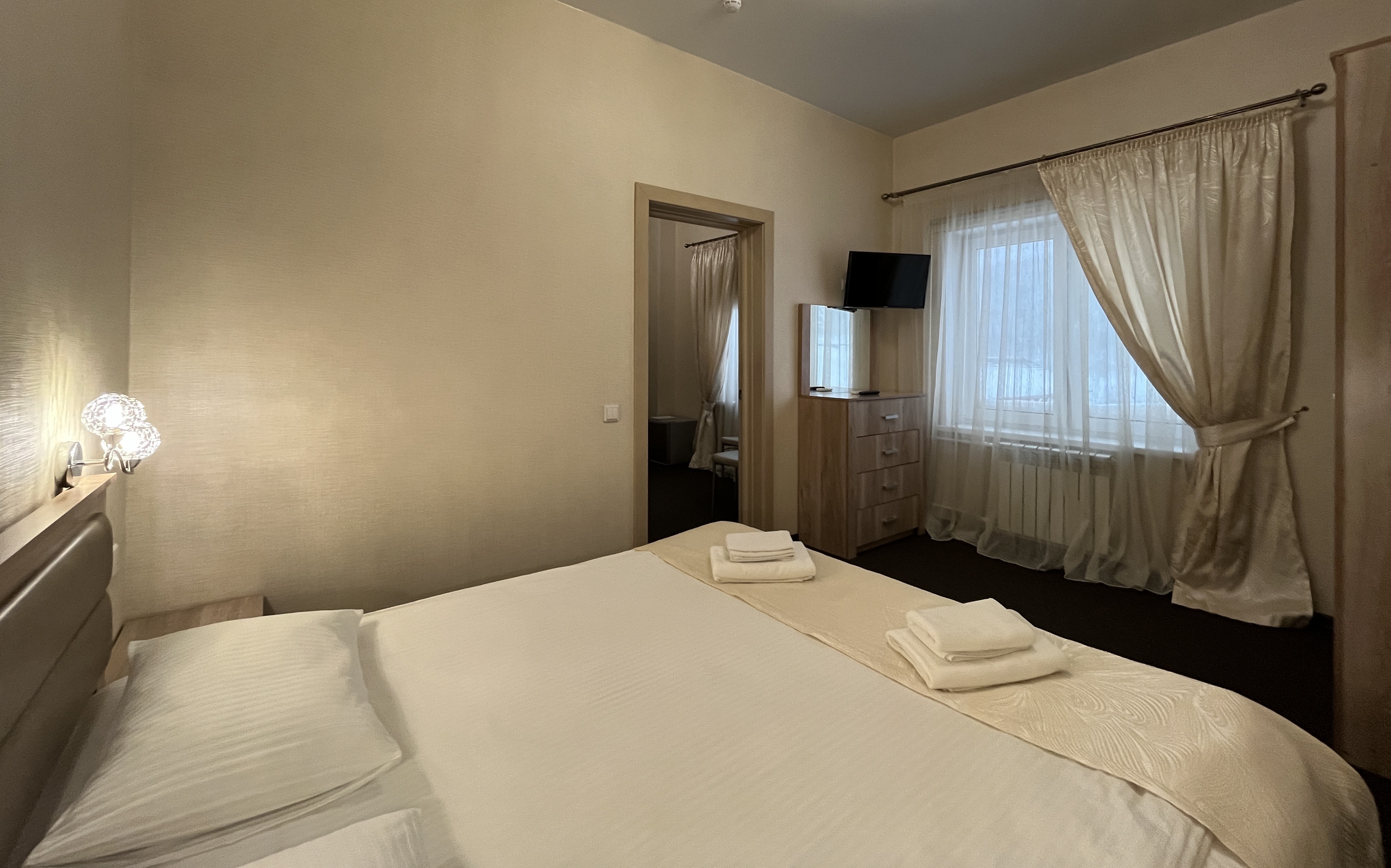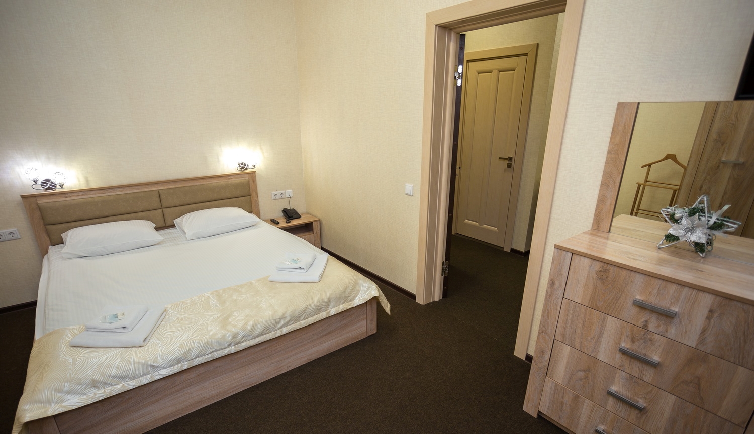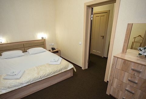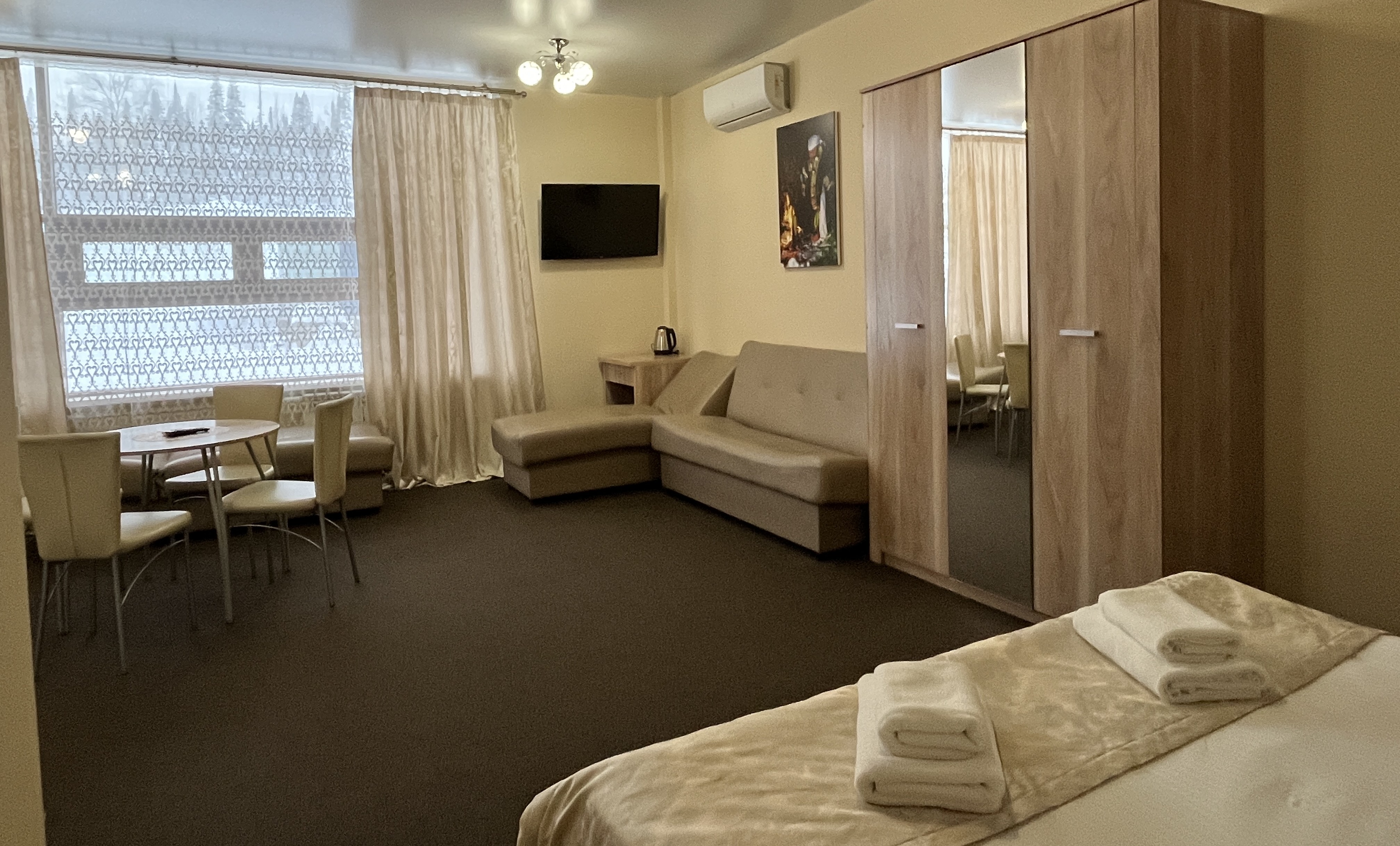 В номере: диван, кровать двуспальная, прикроватные тумбочки, стол, стулья, шкаф, набор посуды, телевизор, чайный набор посуды, электрочайник