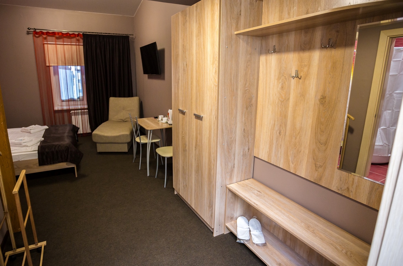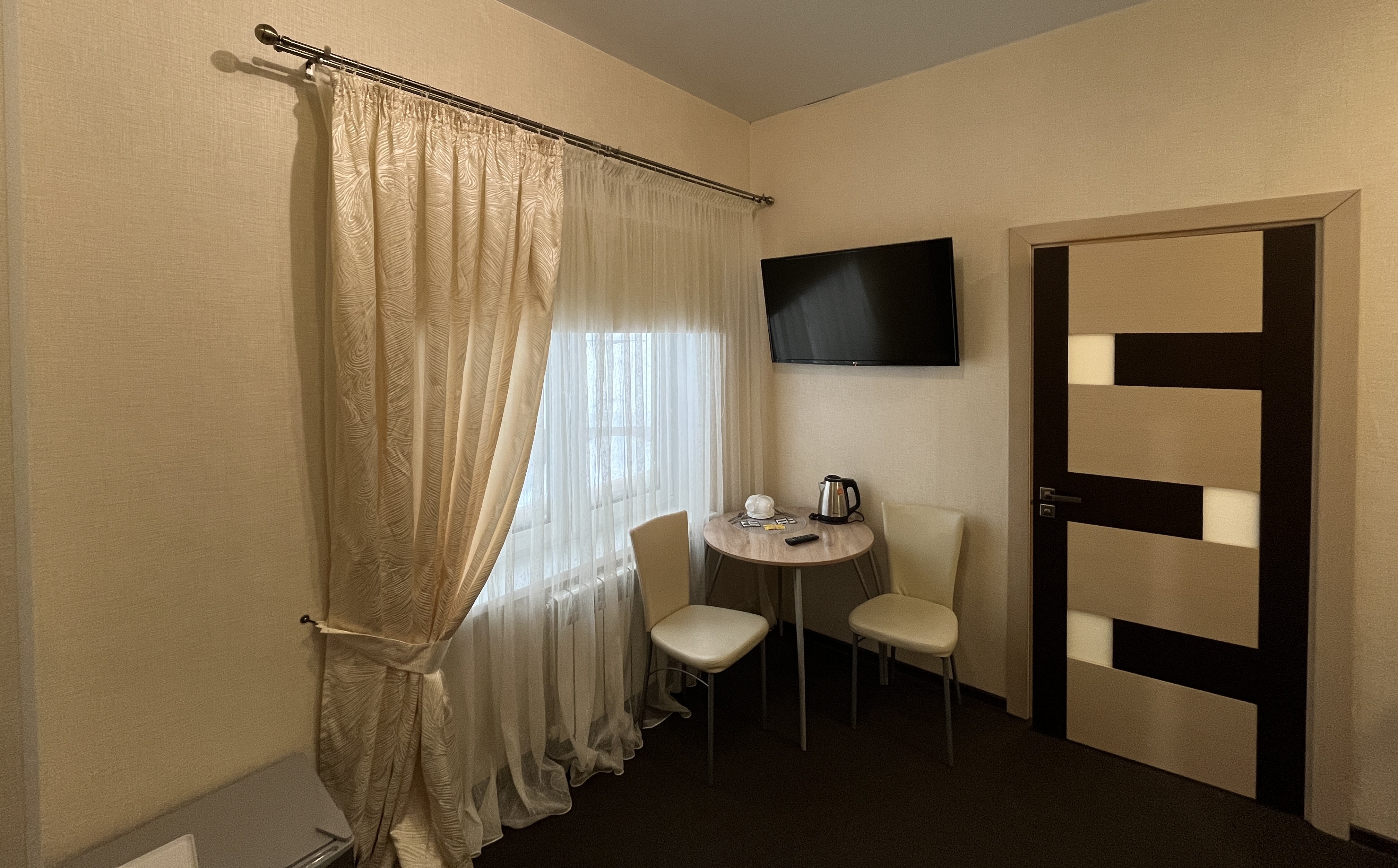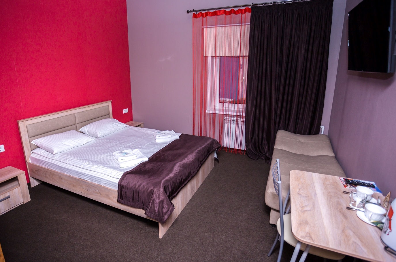 В номере: диван, кровать двуспальная, прикроватные тумбочки, стол, стулья, шкаф, набор посуды, телевизор, чайный набор посуды, электрочайник
