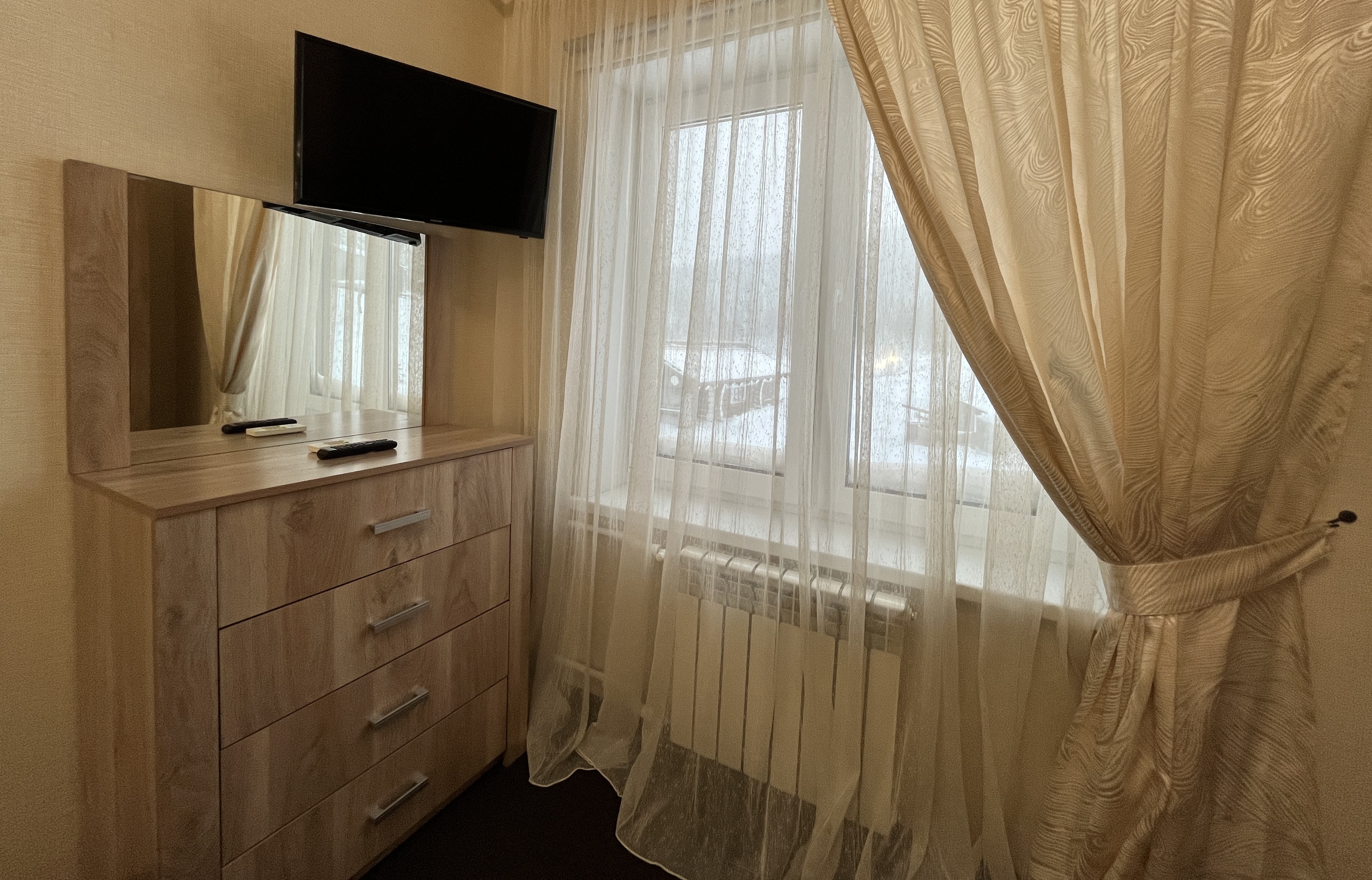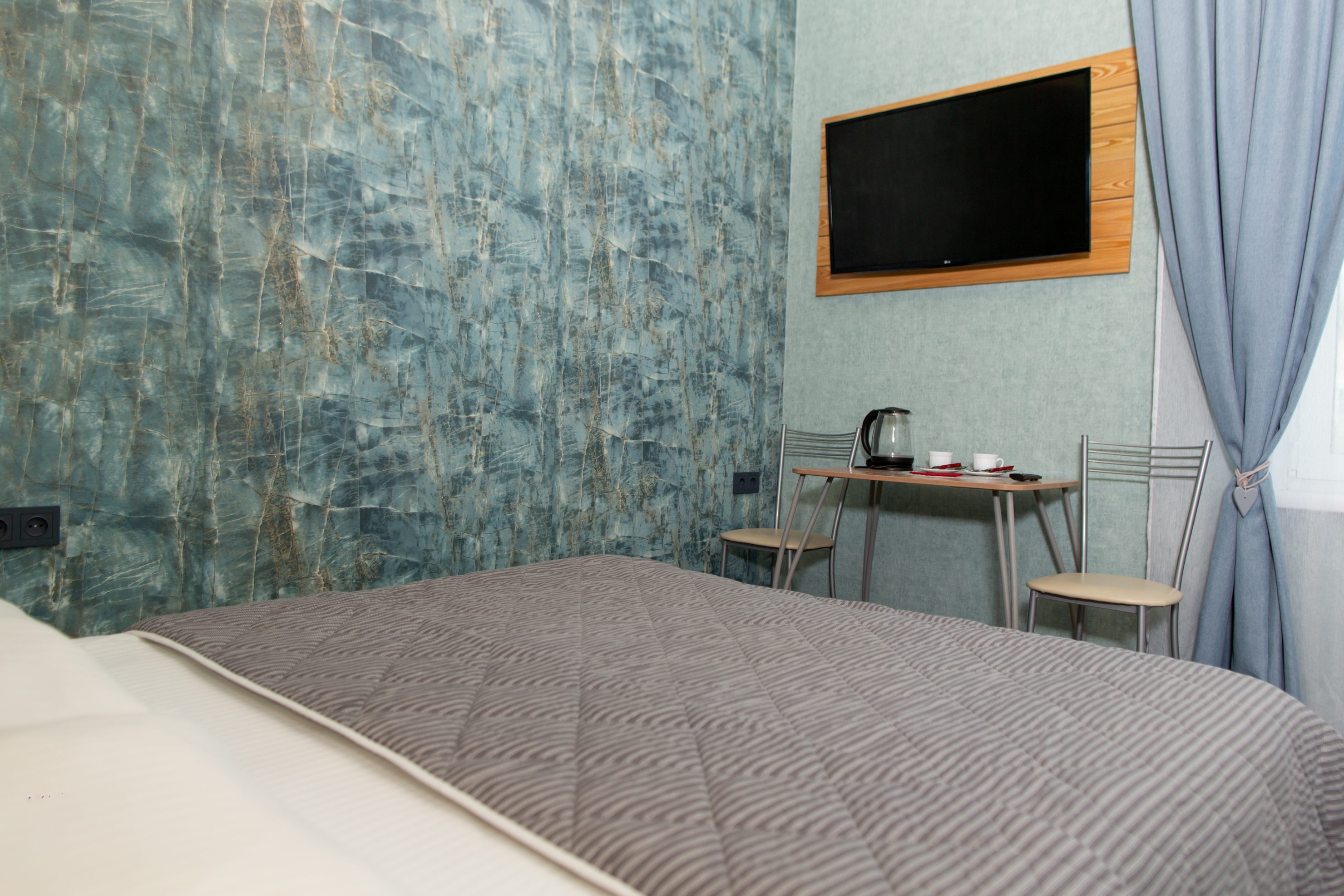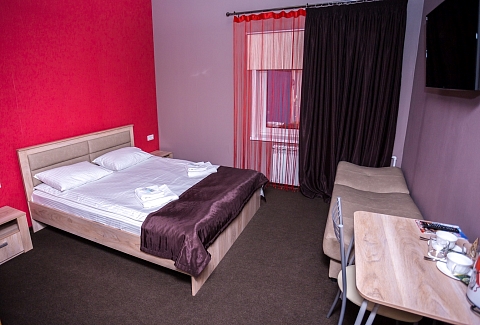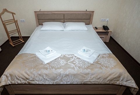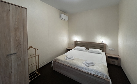 В номере: комод, кровать двуспальная, прикроватные тумбочки, стол, стулья, шкаф, кондиционер, мини-холодильник, телевизор, чайный набор посуды, электрочайник
