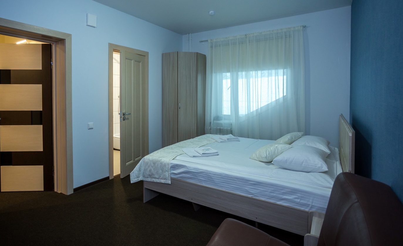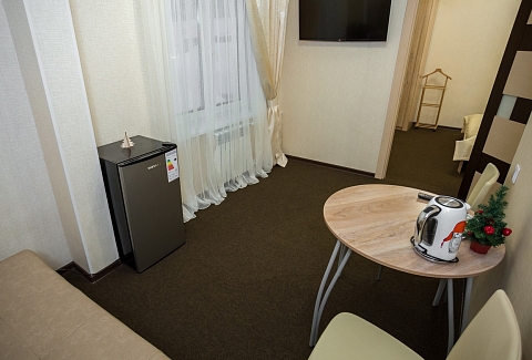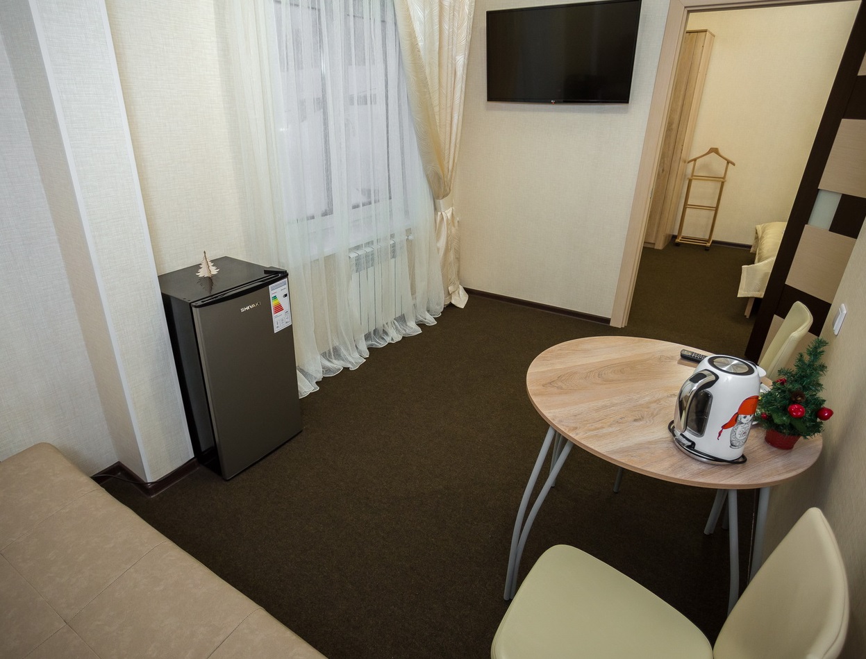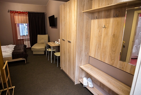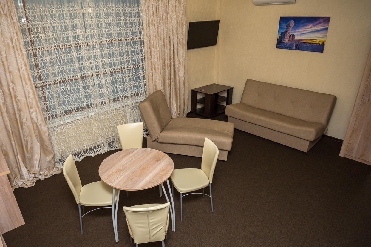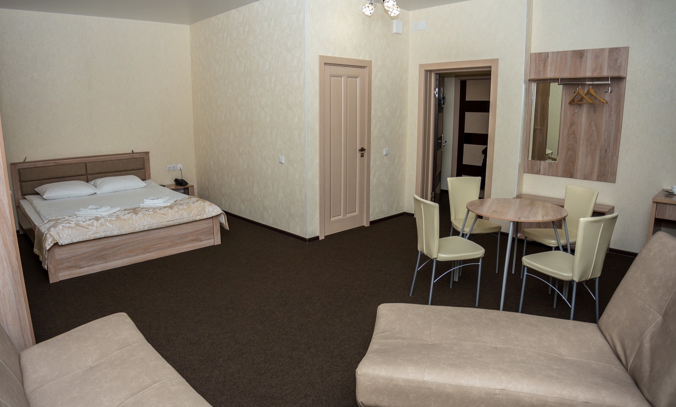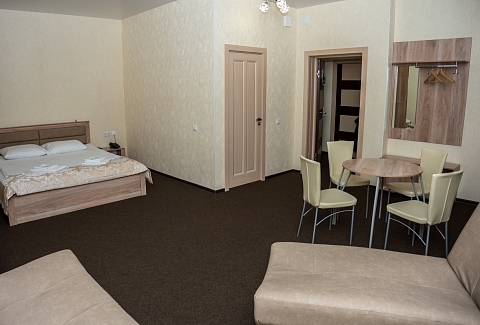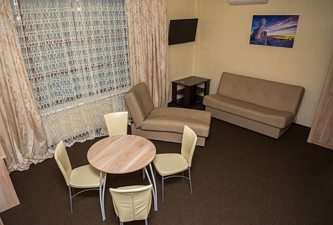 В номере: кровать двуспальная, кровать двухъярусная, набор мягкой мебели, столик журнальный, стол обеденный, стулья, шкаф, кулер, микроволновая печь, мини-холодильник, набор посуды, плита электрическая, телевизор, электрочайник