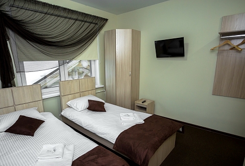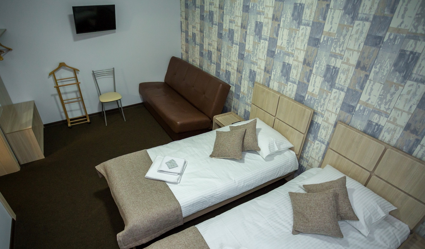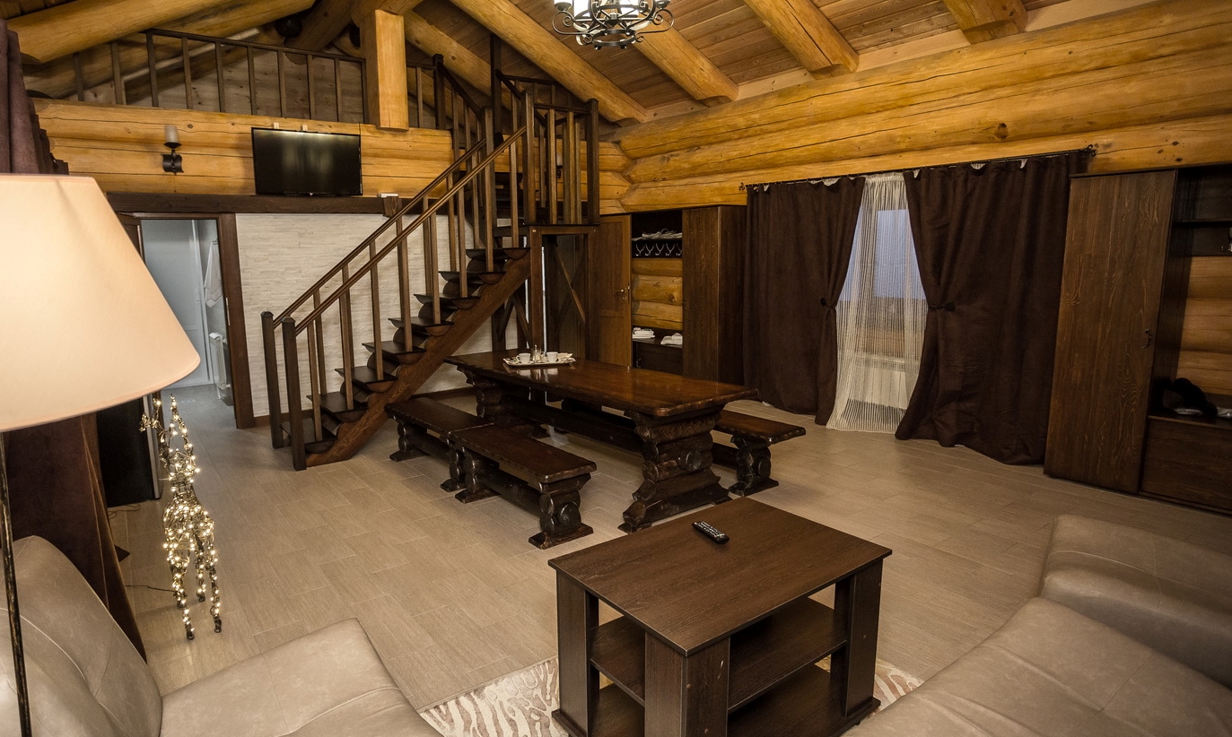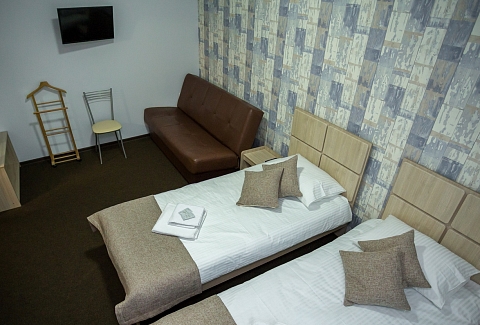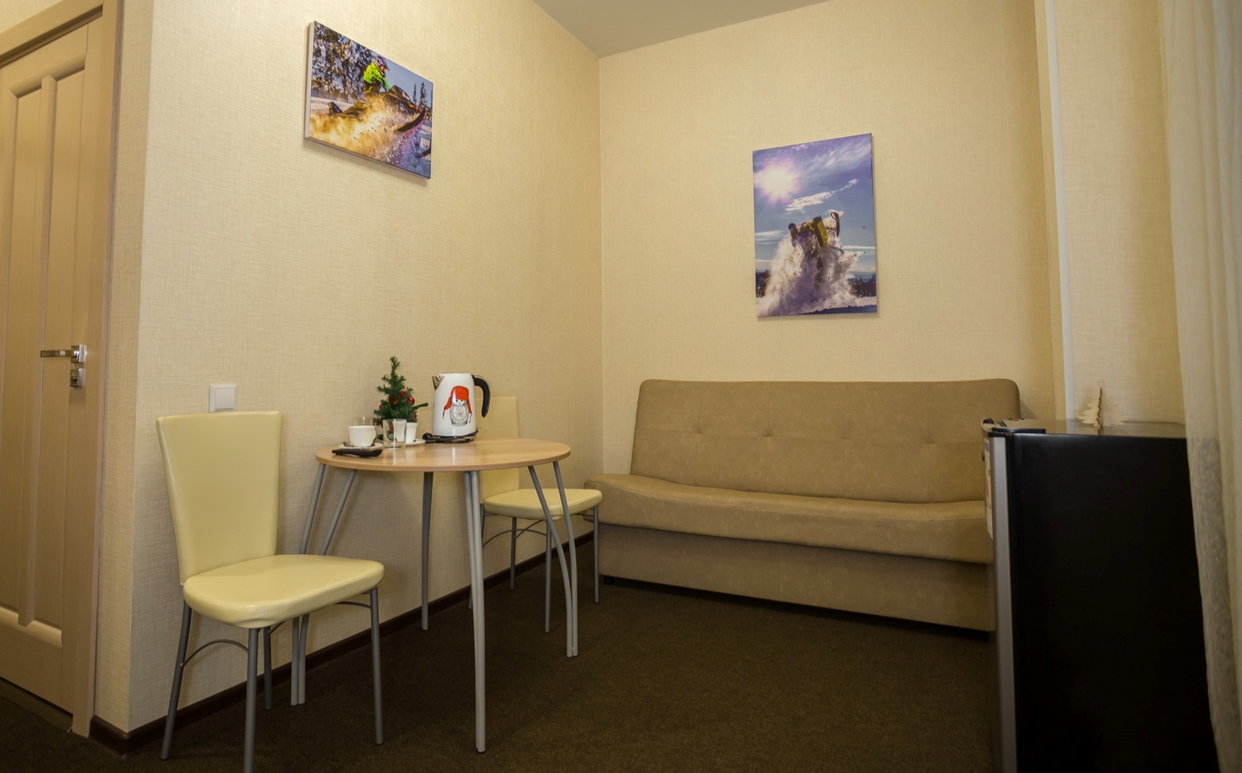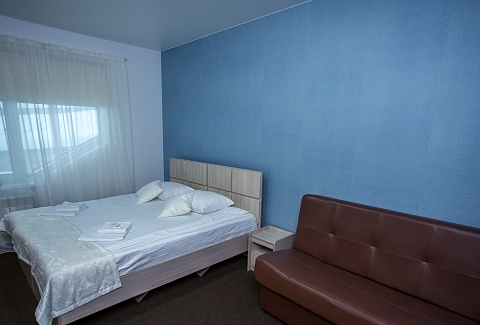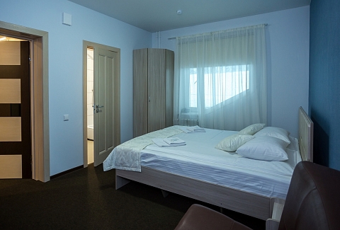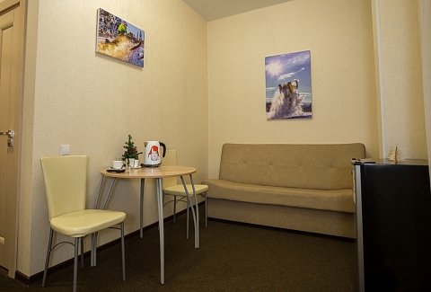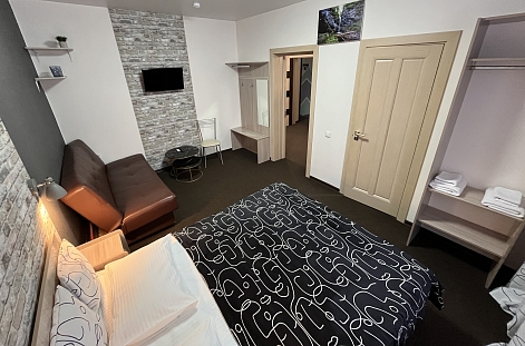 В номере: кровать двуспальная, кровать двухъярусная, набор мягкой мебели, столик журнальный, стол обеденный, стулья, шкаф, кулер, микроволновая печь, мини-холодильник, набор посуды, плита электрическая, телевизор, электрочайник