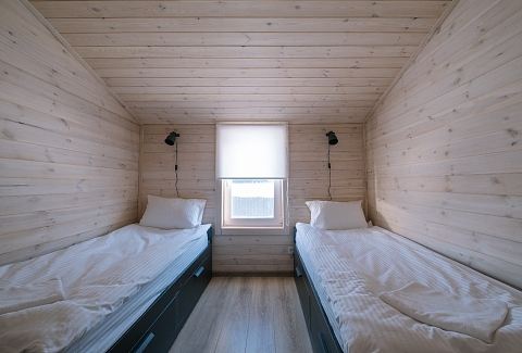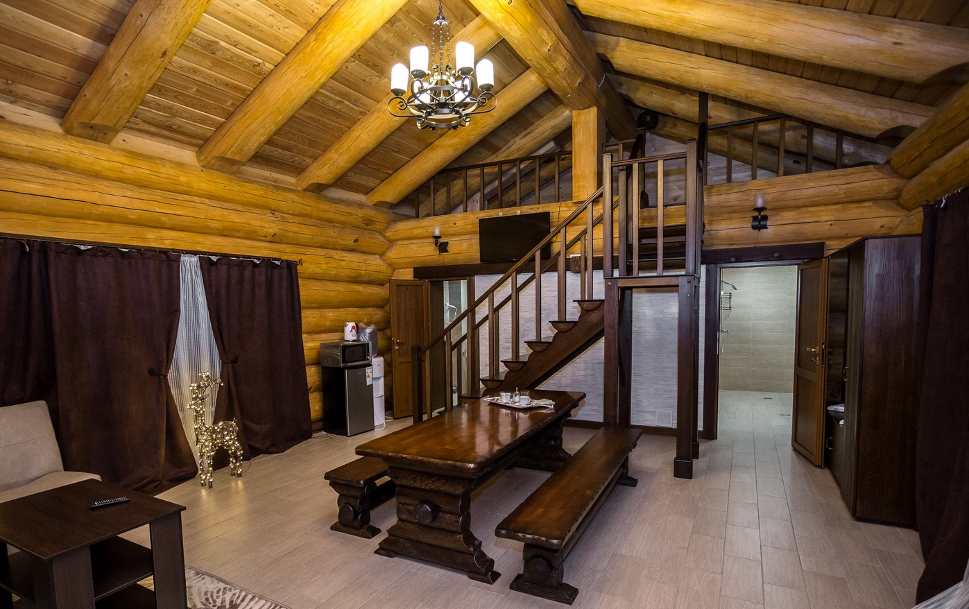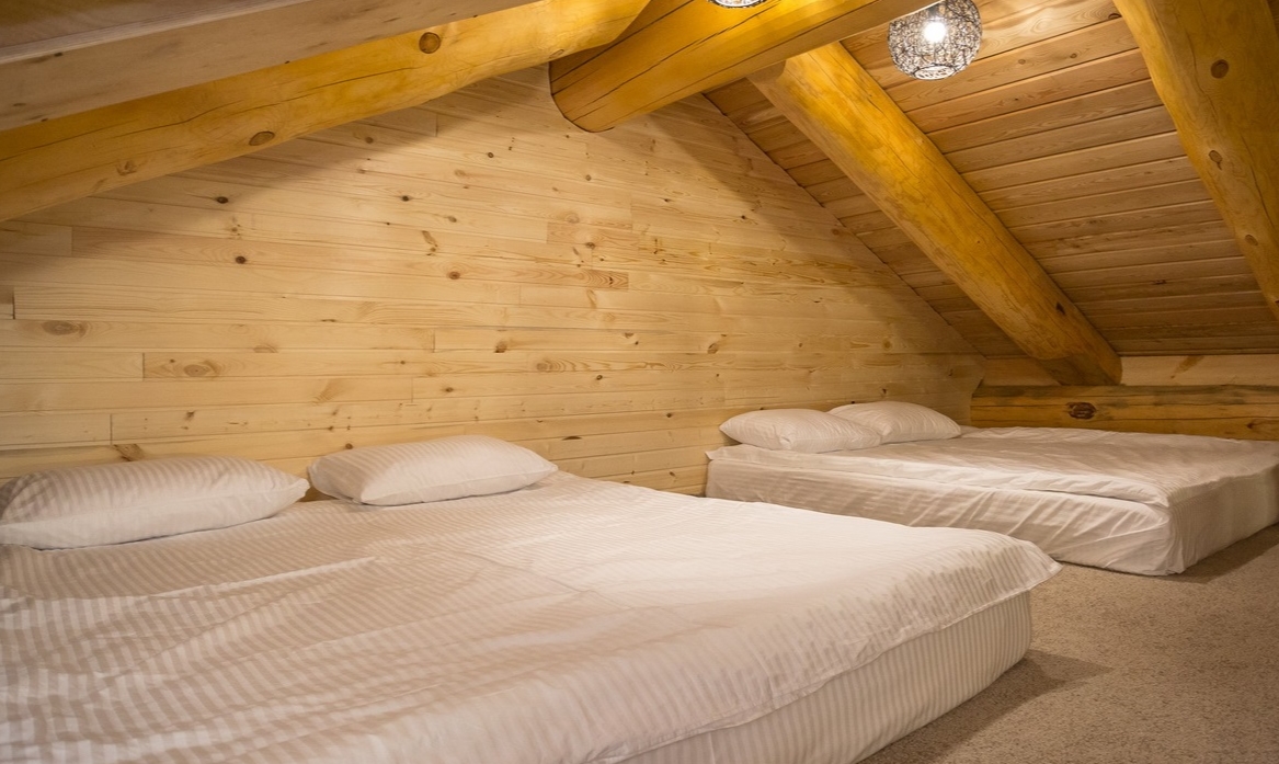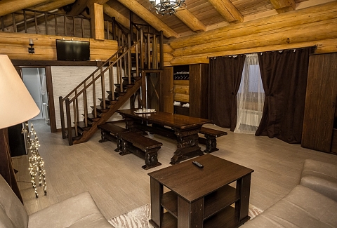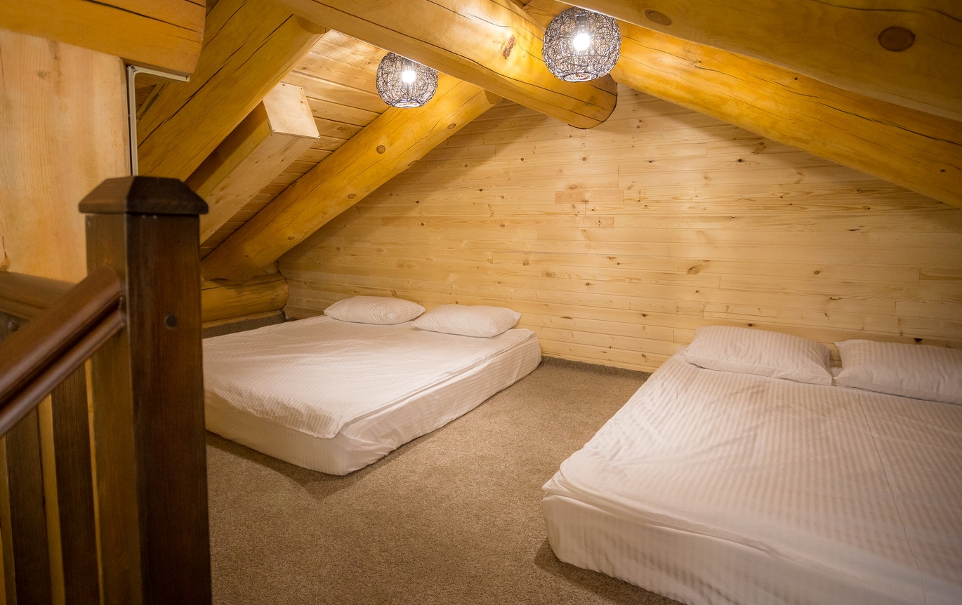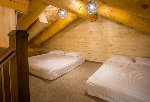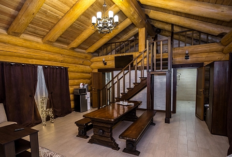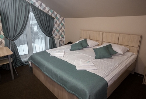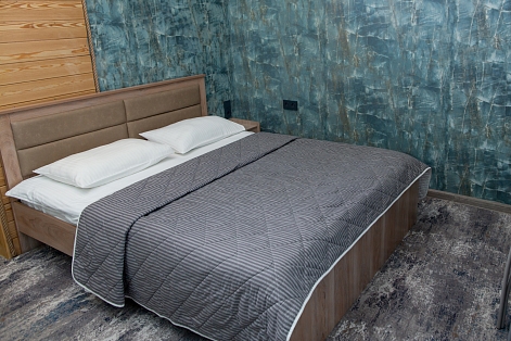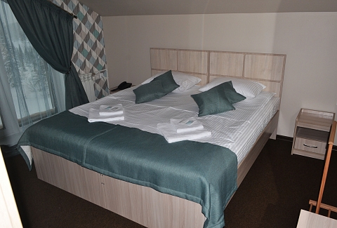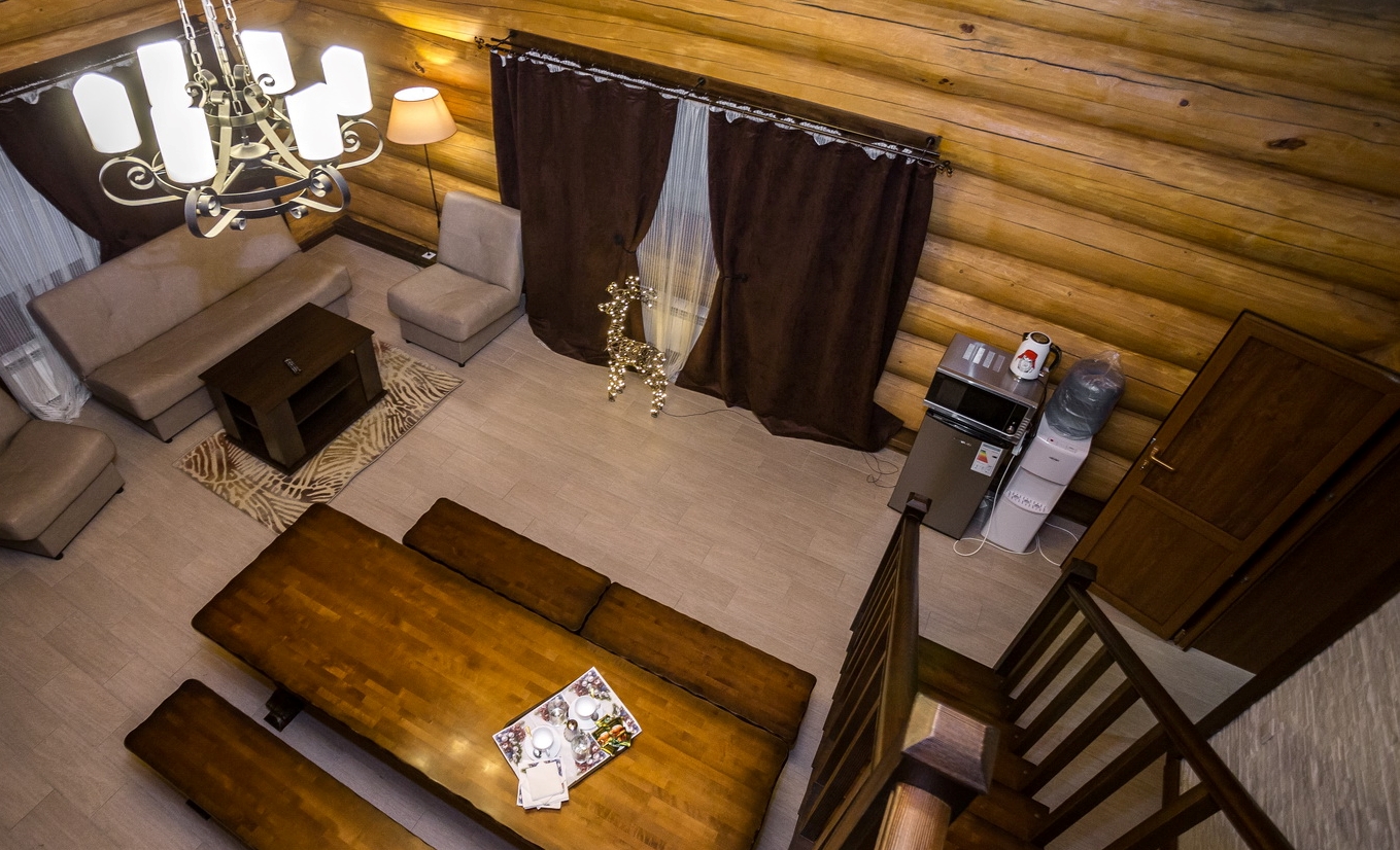 В номере: кровать двуспальная, кровать двухъярусная, набор мягкой мебели, столик журнальный, стол обеденный, стулья, шкаф, кулер, микроволновая печь, мини-холодильник, набор посуды, плита электрическая, телевизор, электрочайник