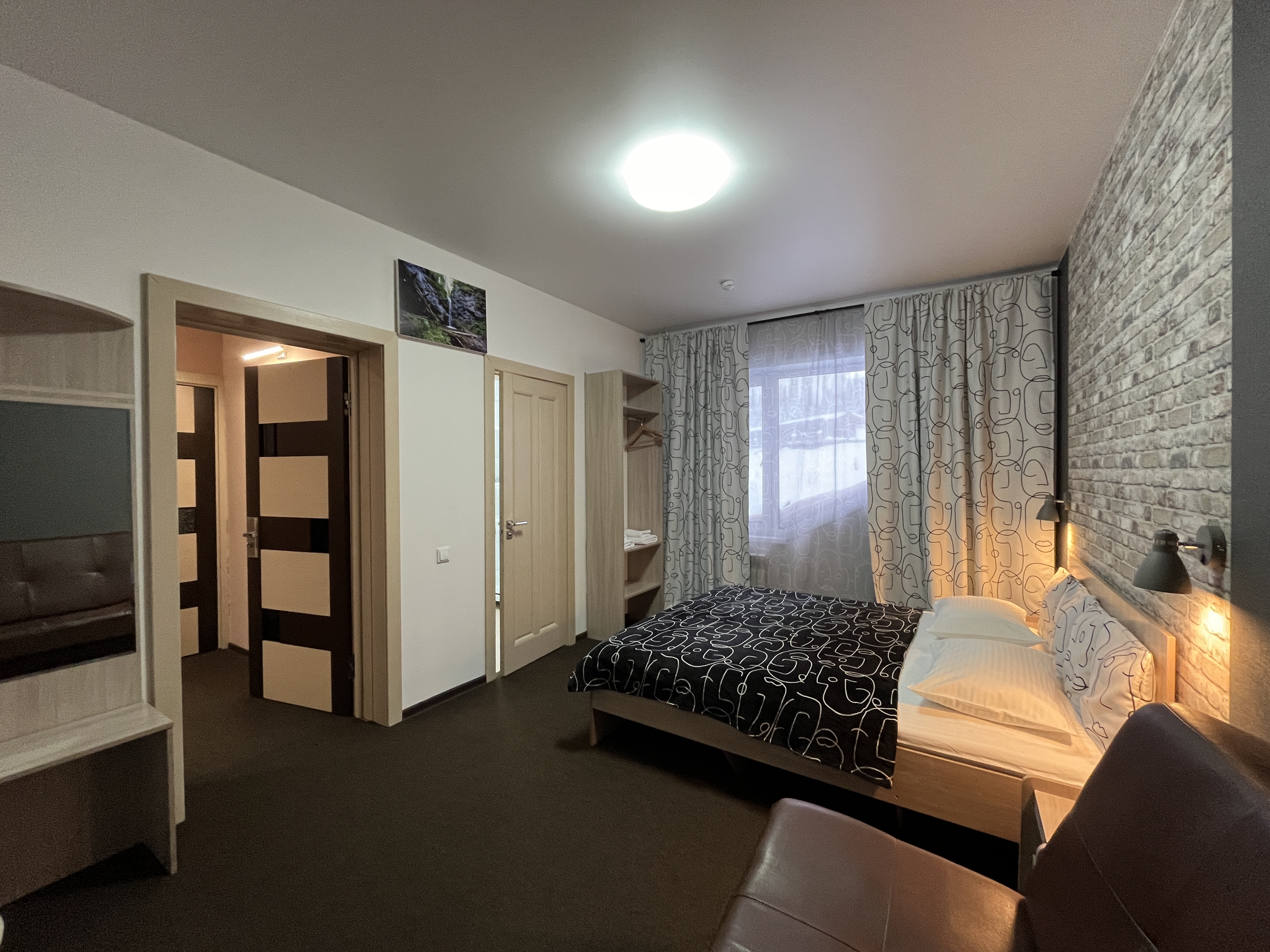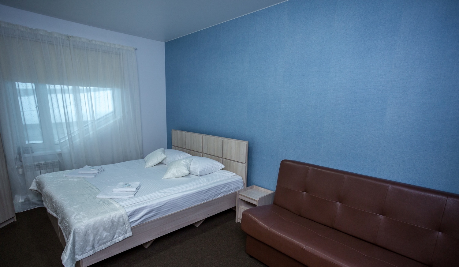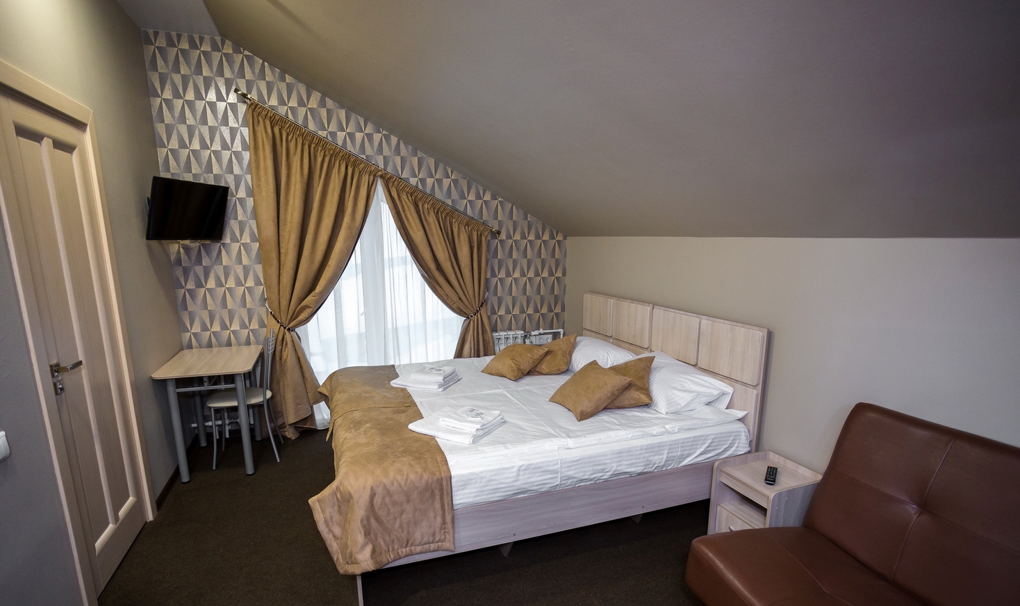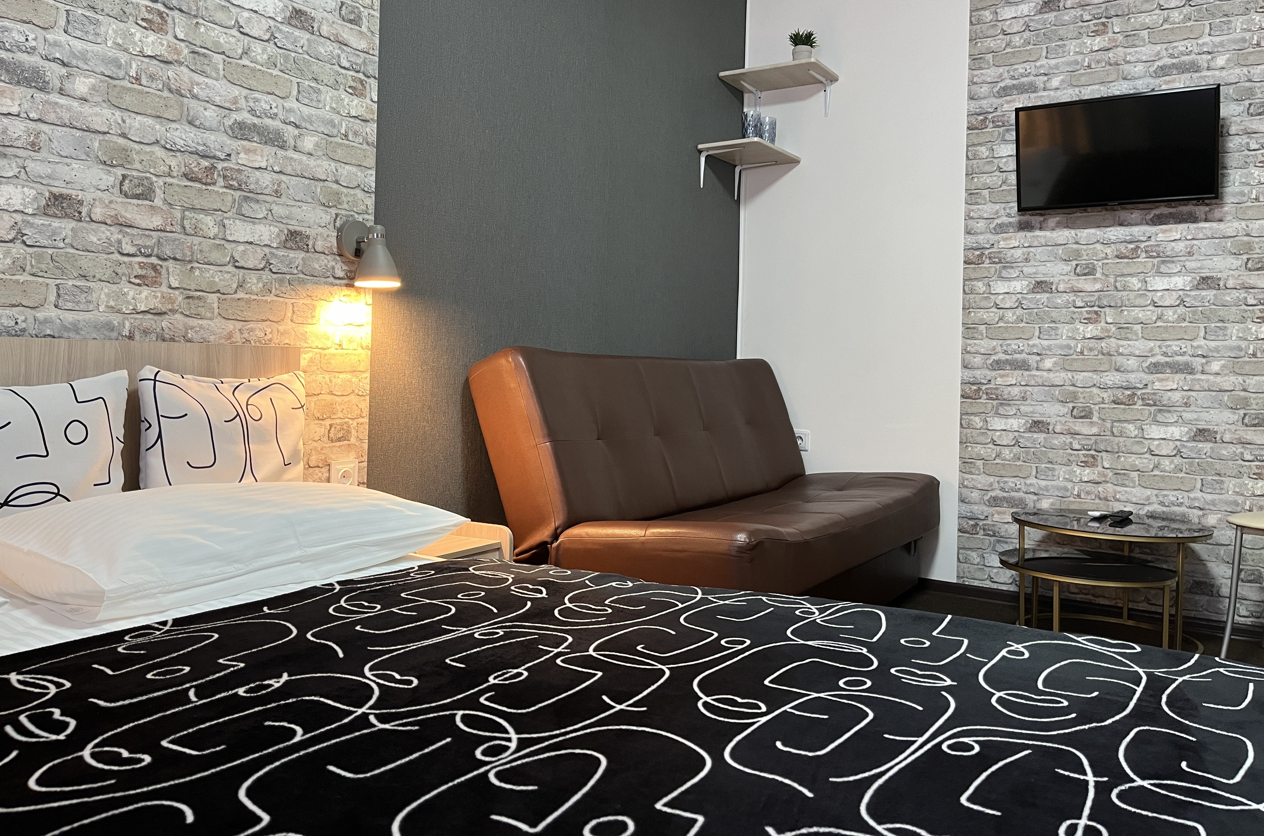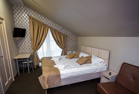 В номере: диван, кровать двуспальная, прикроватные тумбочки, стол, стул, шкаф, телевизор