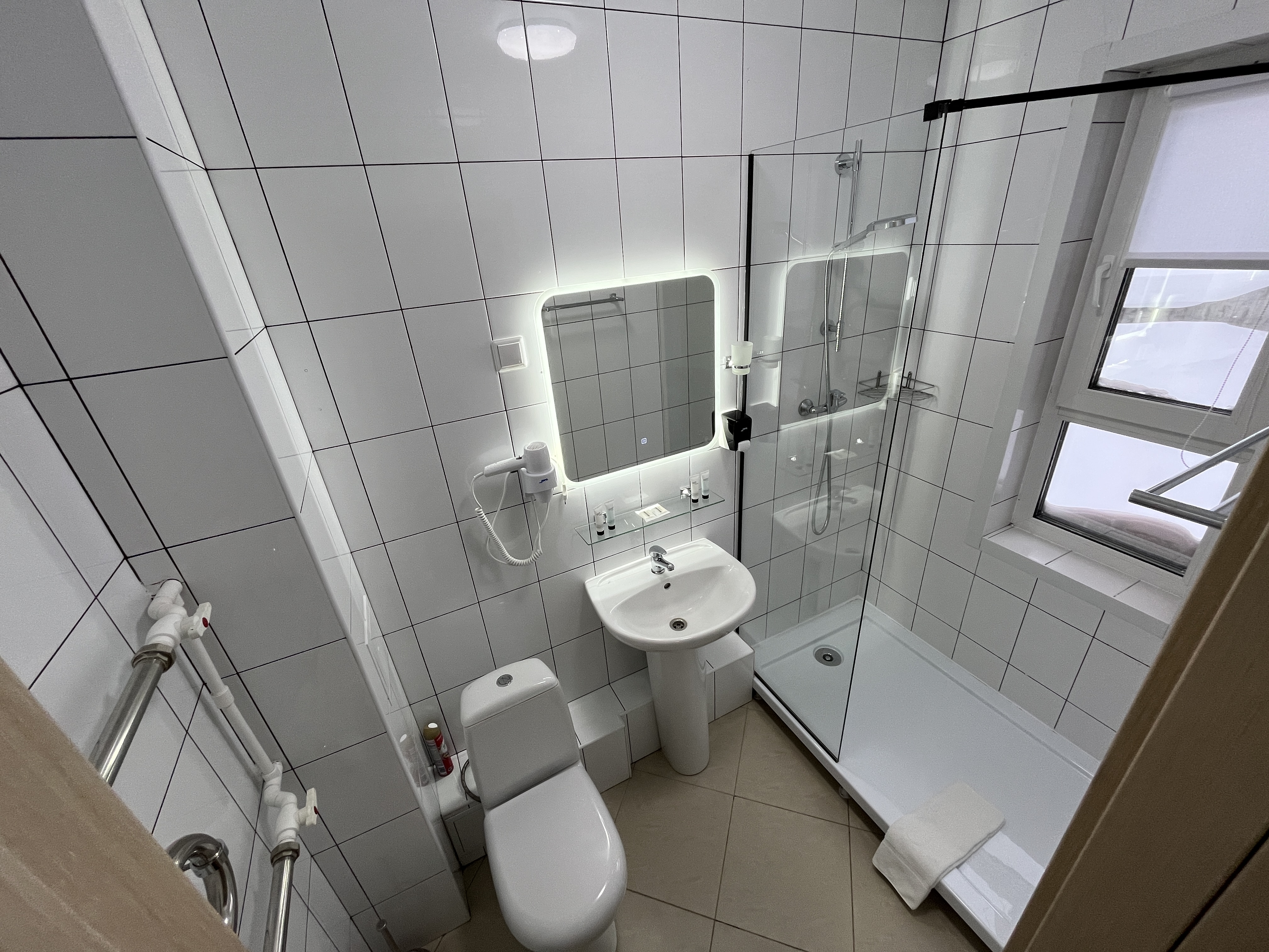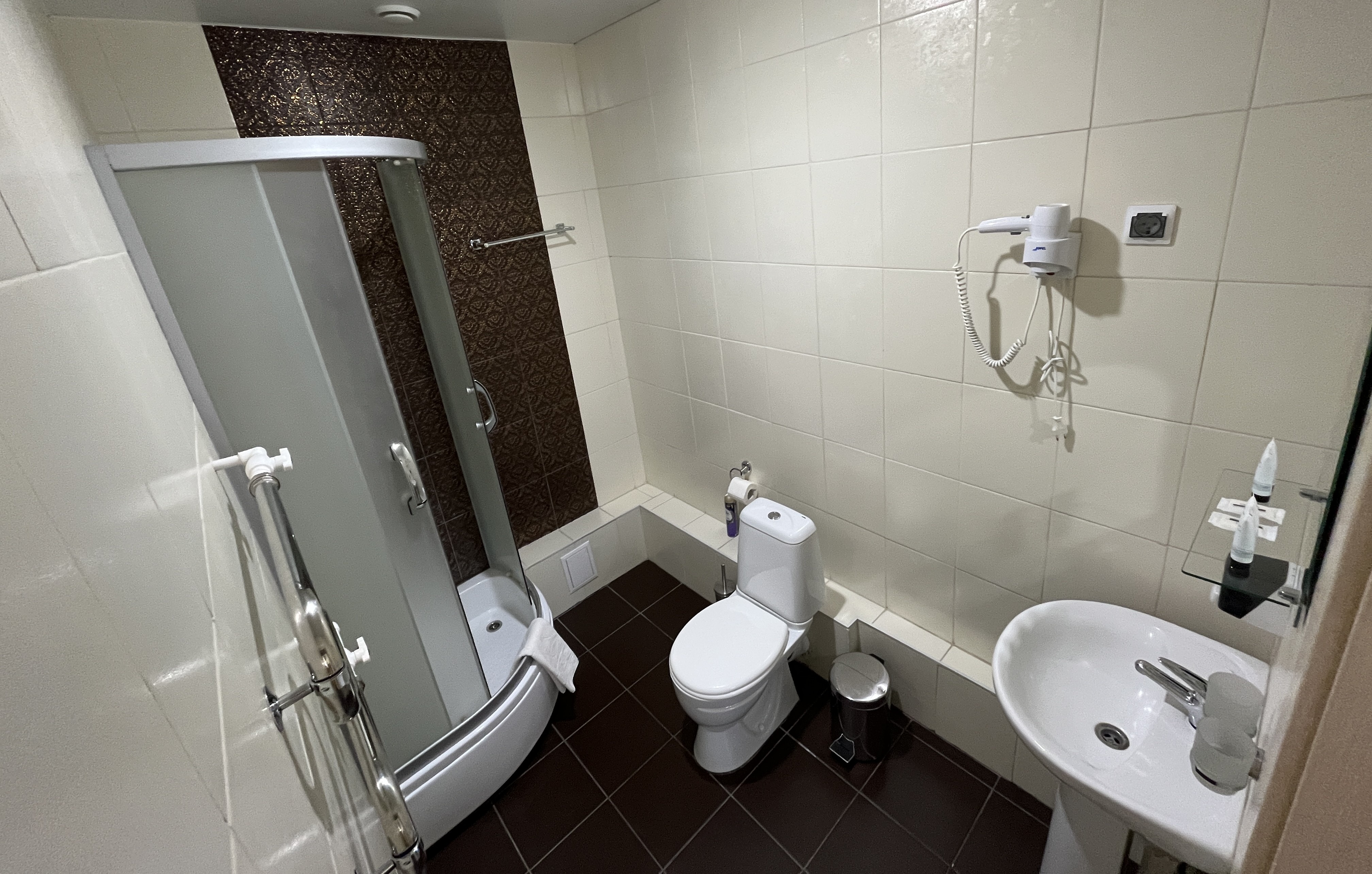 Санузел: с душевой кабиной, тапочки, туалетные принадлежности, фен