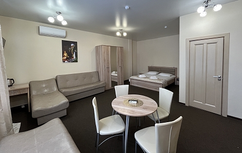 В номере: диван, кровать двуспальная, прикроватные тумбочки, стол, стулья, шкаф, кондиционер, телевизор, чайный набор посуды, электрочайник