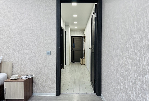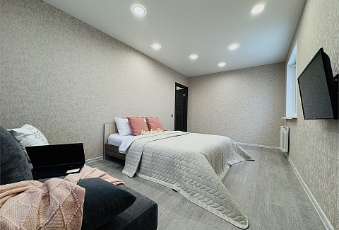 В номере: диван раскладной, кровать двуспальная, стол, стулья, шкаф, гладильная доска, духовой шкаф, микроволновая печь, набор посуды, плита электрическая, стиральная машина, телевизор, утюг, холодильник, чайник