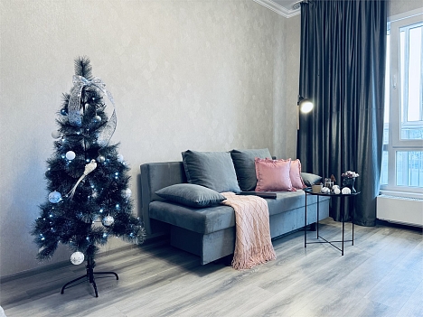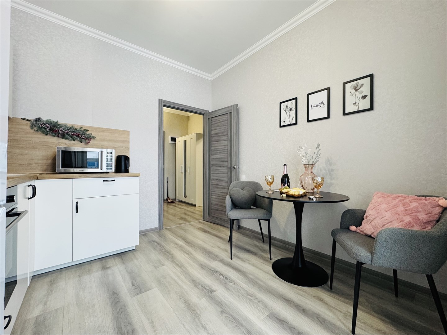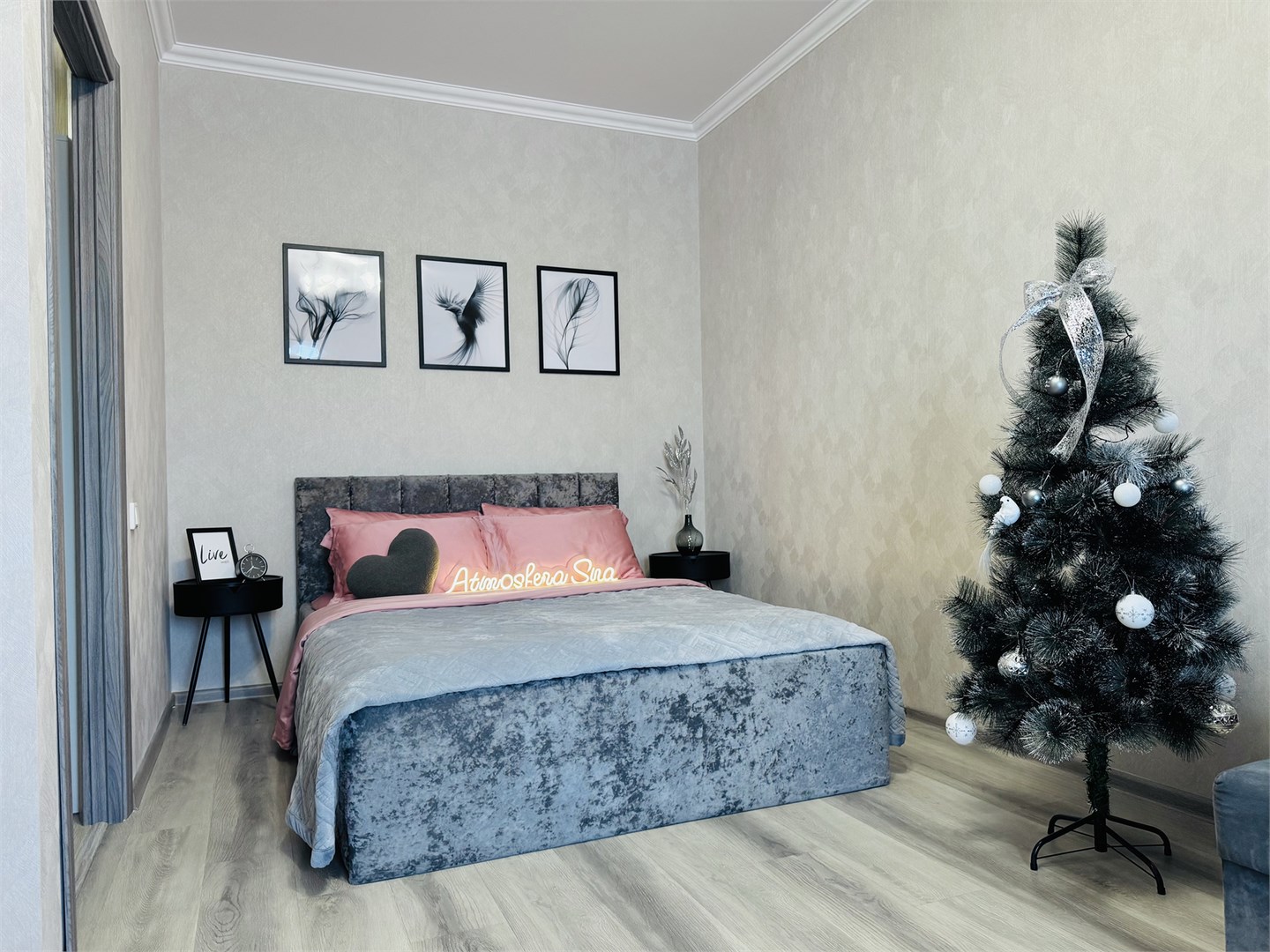 В номере: диван раскладной, кровать двуспальная, стол, стулья, шкаф, гладильная доска, микроволновая печь, набор посуды, плита электрическая, стиральная машина, телевизор, телефон, утюг, холодильник, чайник