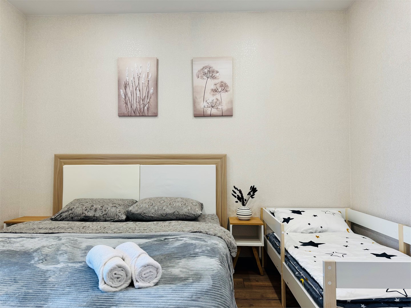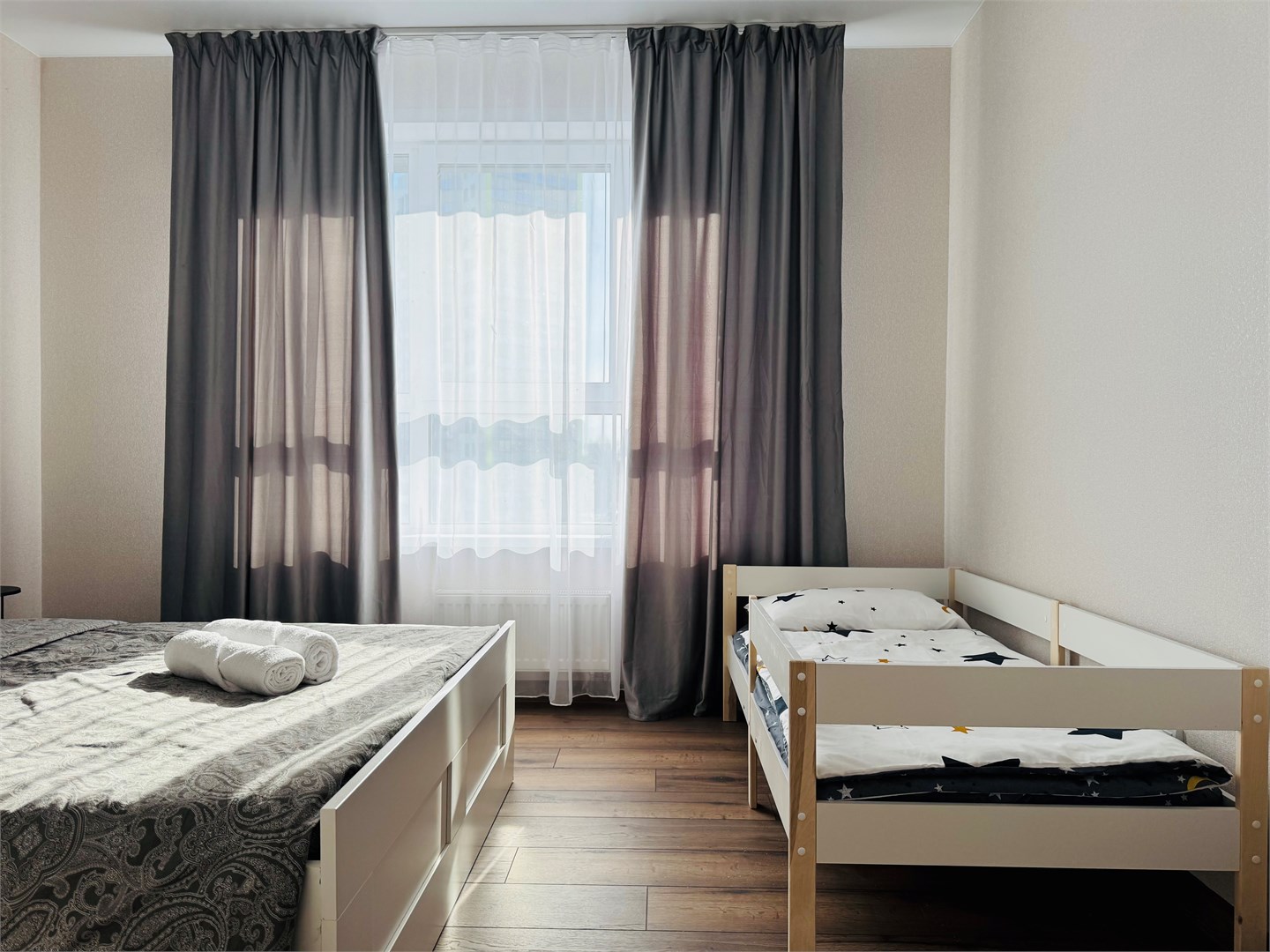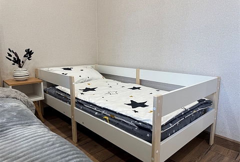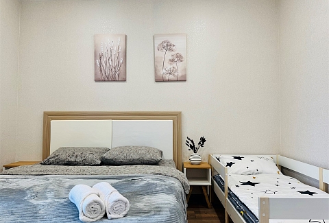 В номере: диван раскладной, кровать двуспальная, стол, стулья, шкаф, гладильная доска, микроволновая печь, набор посуды, плита электрическая, стиральная машина, телефон, утюг, холодильник, чайник