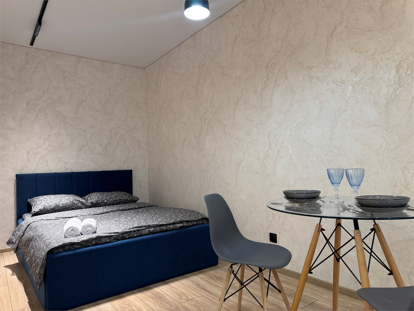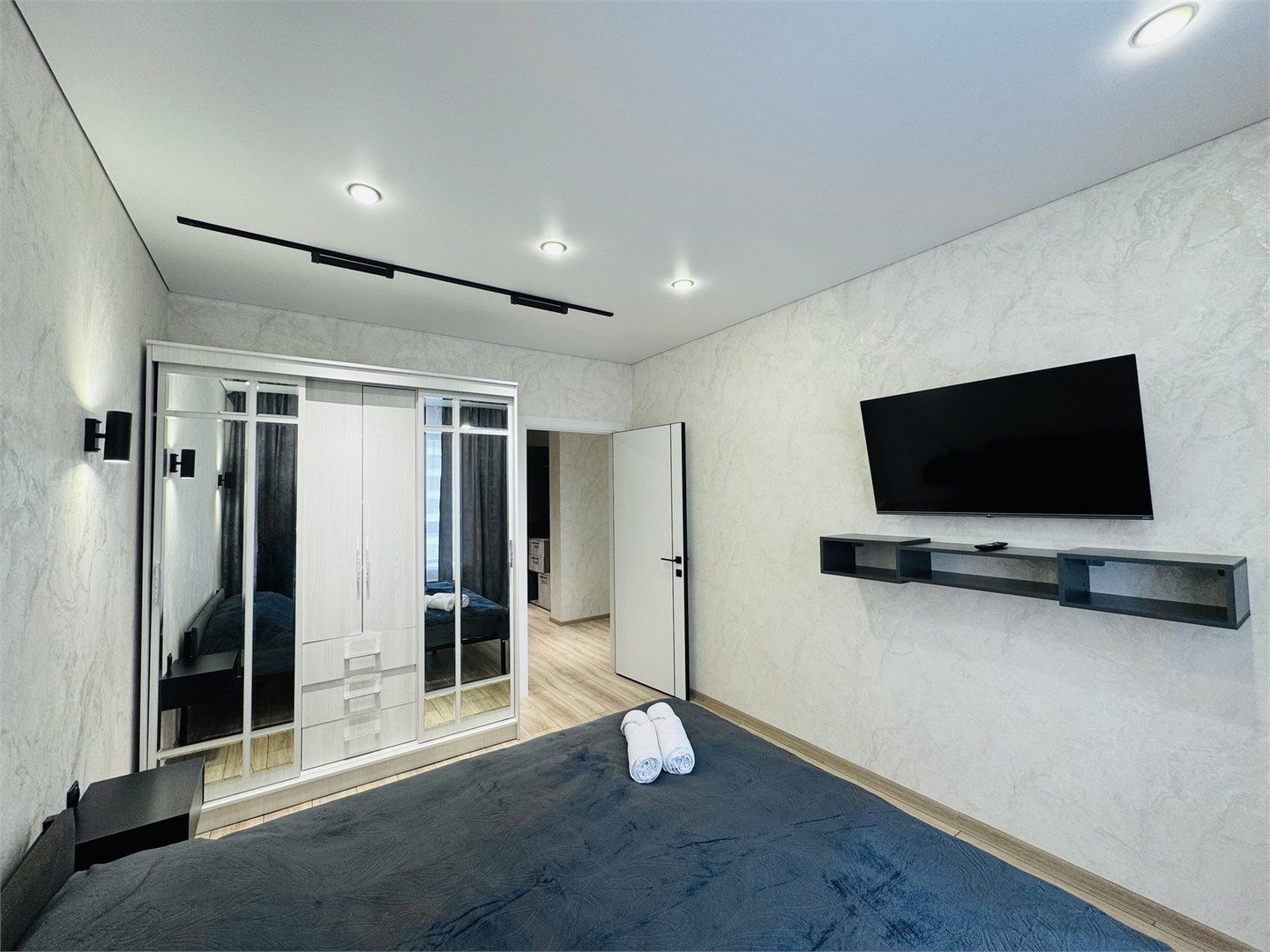 В номере: диван раскладной, кровать двуспальная, стол, стулья, шкаф, гладильная доска, микроволновая печь, набор посуды, плита электрическая, стиральная машина, телевизор, утюг, холодильник, чайник