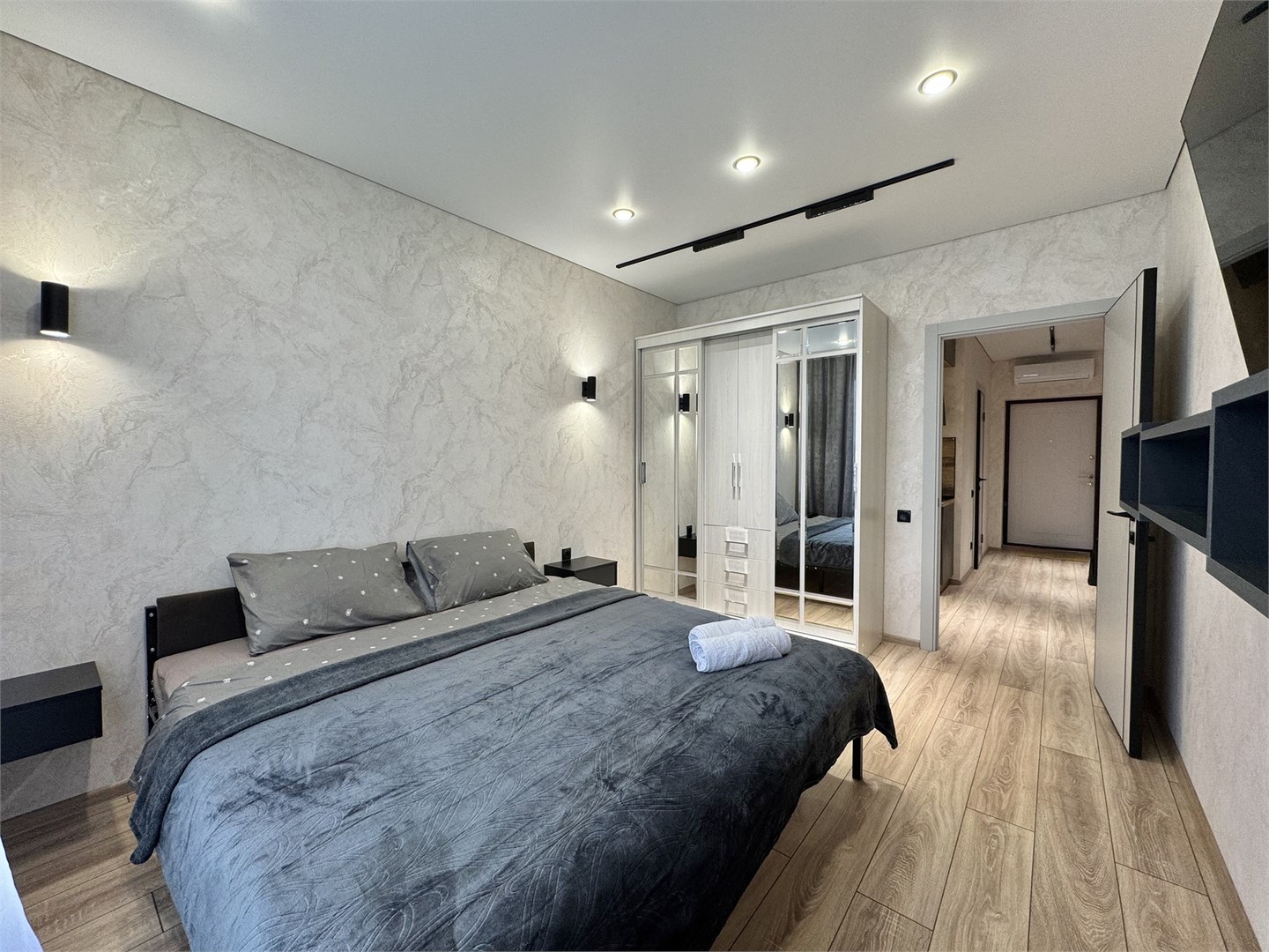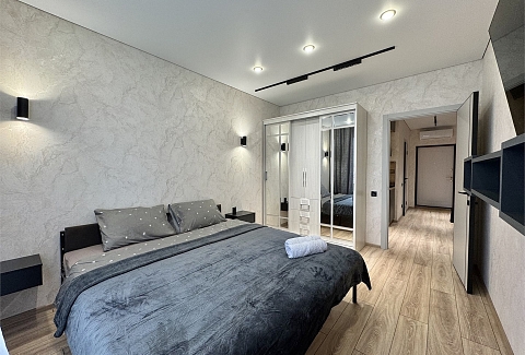 В номере: диван раскладной, кровать двуспальная, прикроватные тумбочки, стол, стулья, шкаф, кондиционер, микроволновая печь, набор посуды, плита электрическая, телевизор, холодильник, чайник