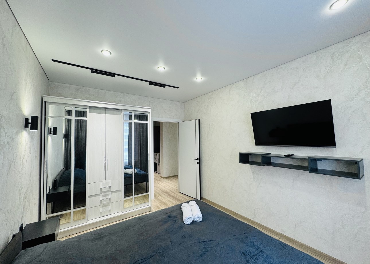 В номере: диван раскладной, кровать двуспальная, стол, стулья, шкаф, гладильная доска, кондиционер, микроволновая печь, набор посуды, плита электрическая, стиральная машина, телевизор, утюг, холодильник, чайник