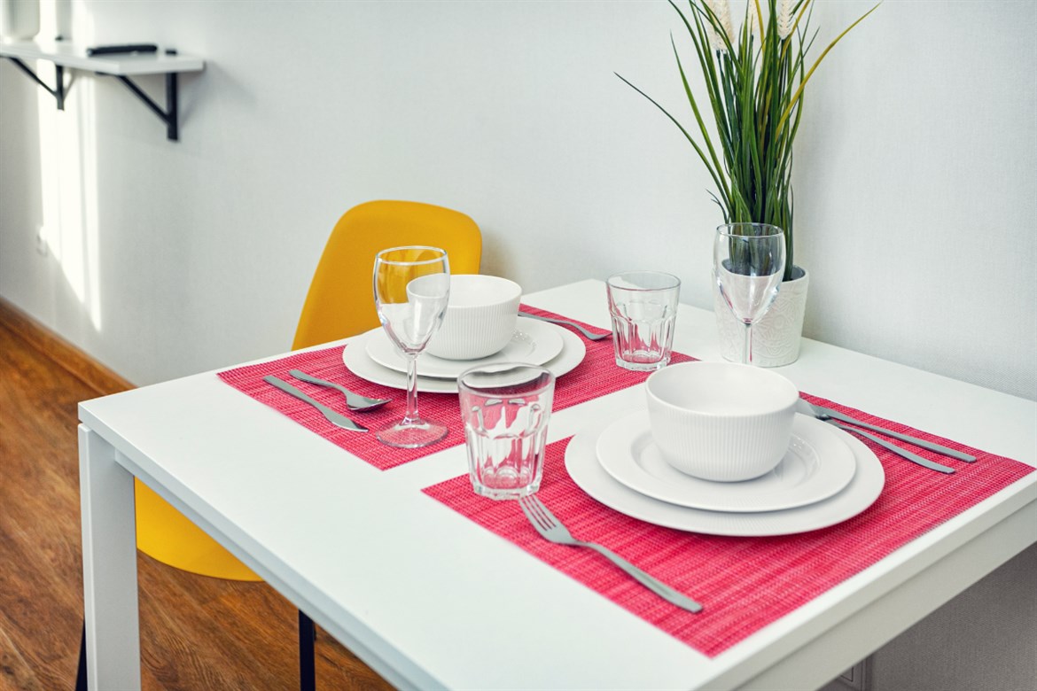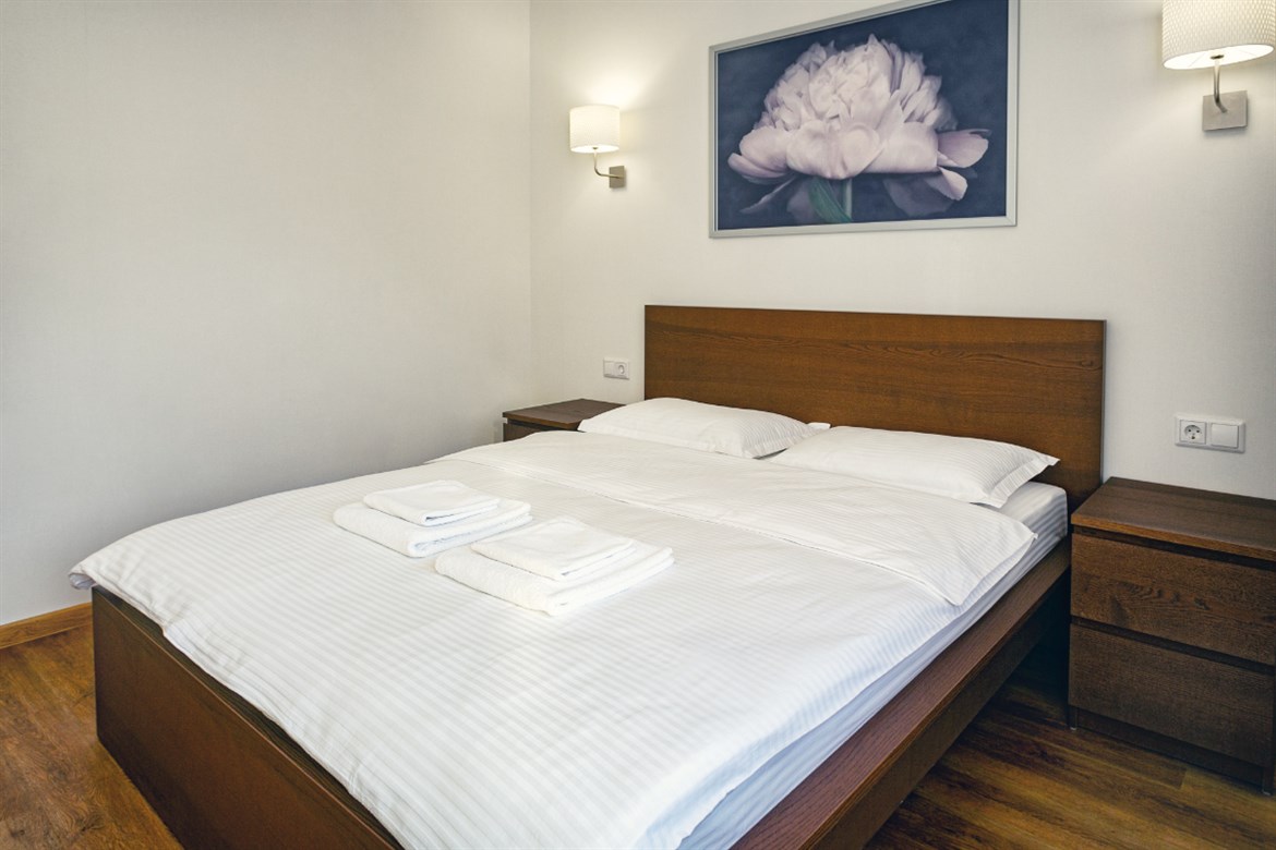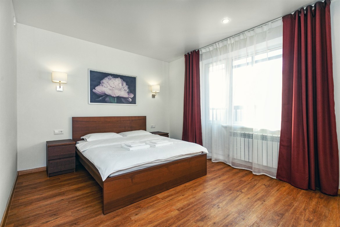 В номере: диван раскладной, кровать двуспальная, обувная полка, прикроватная тумбочка, стол, стулья, тумба под телевизор, шкаф-купе, духовой шкаф, мини-холодильник, набор посуды, плита электрическая, стиральная машина, телевизор, утюг, электрочайник
