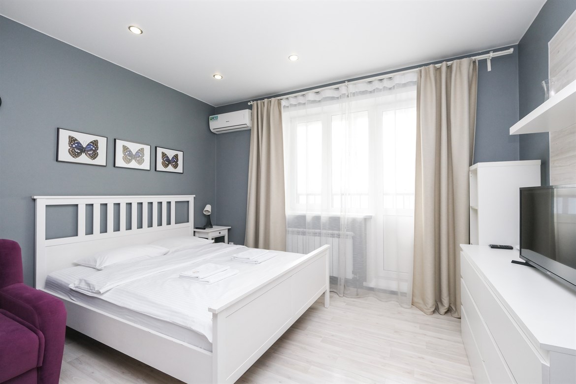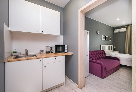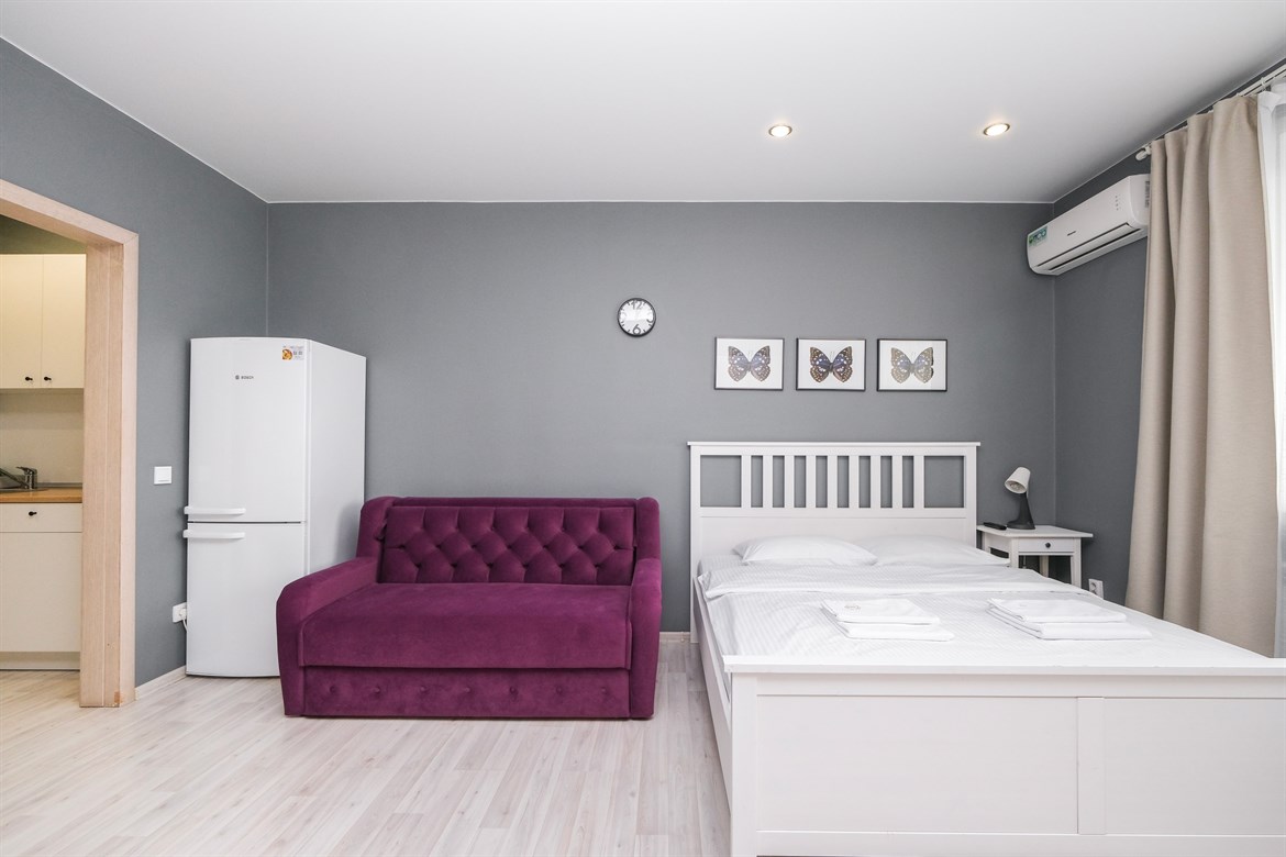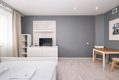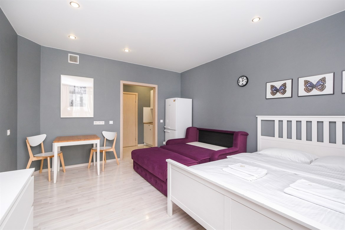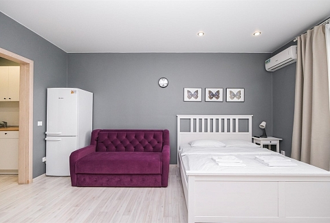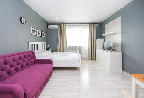 Просторный внутренний двор располагает спортивным и игровым оборудованием, парковочными местами. В здании работает продуктовый магазин. В апартаментах могут разместиться 4 гостя: жилая комната оснащена кроватью и диваном. Есть выход на застекленный балкон. Небольшая, но функциональная кухня установлена в прихожей. Совмещенный санузел оборудован ванной, стиральной машиной. Гости могут подключиться к Wi-Fi. Доступно заселение с питомцем.