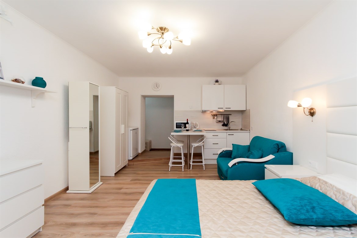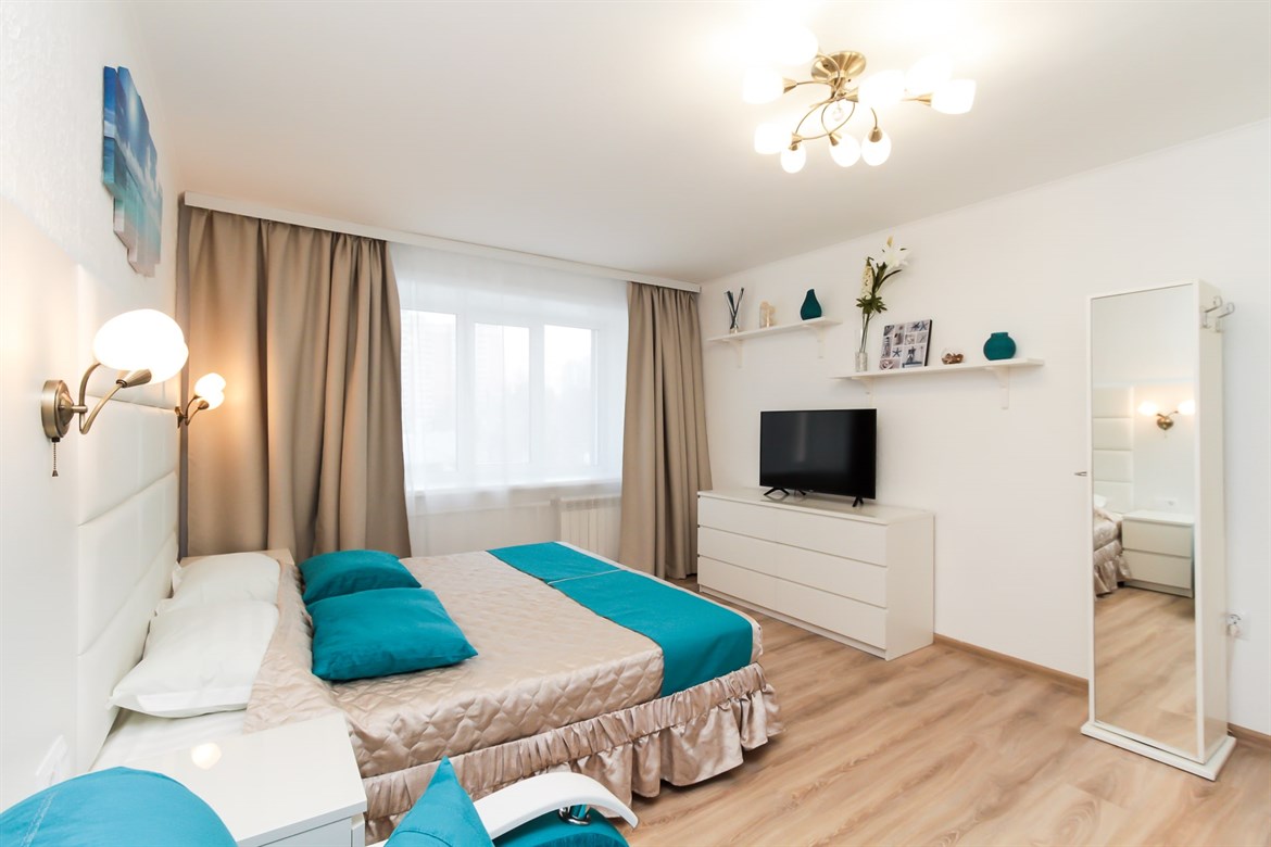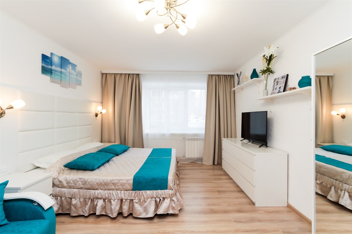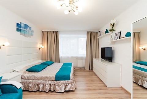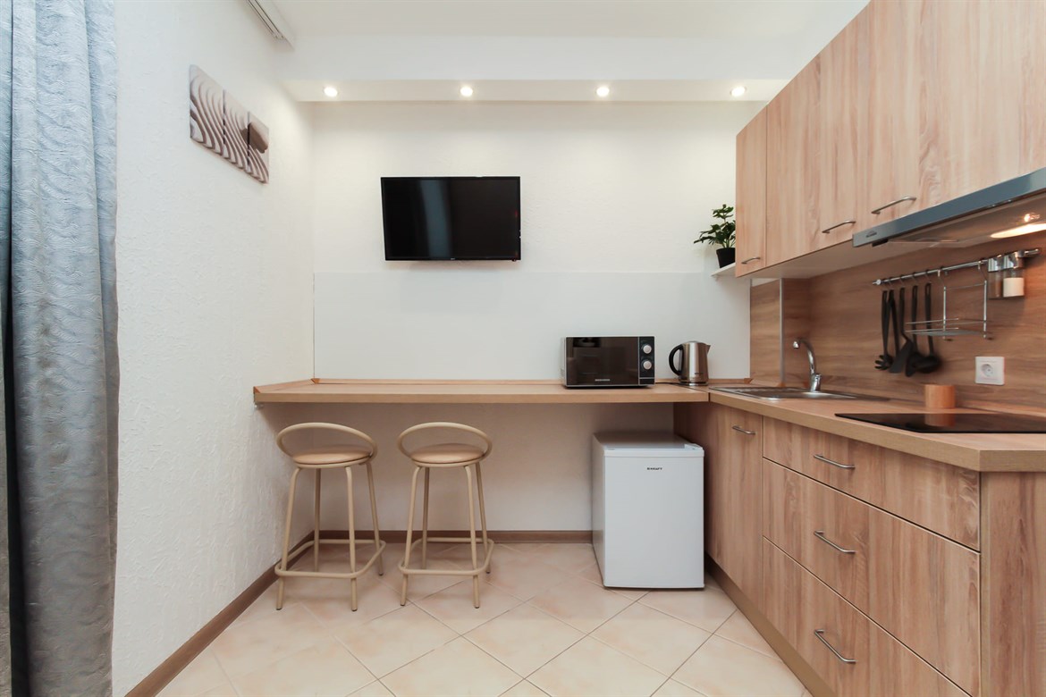 В номере: зеркало, кровать двуспальная, стол, стулья, шкаф, микроволновая печь, мини-холодильник, набор посуды, плита электрическая, телевизор, электрочайник