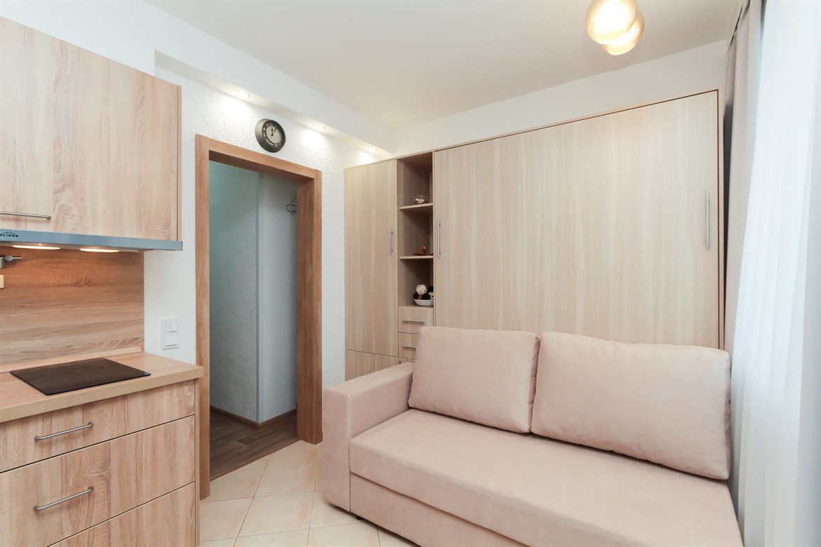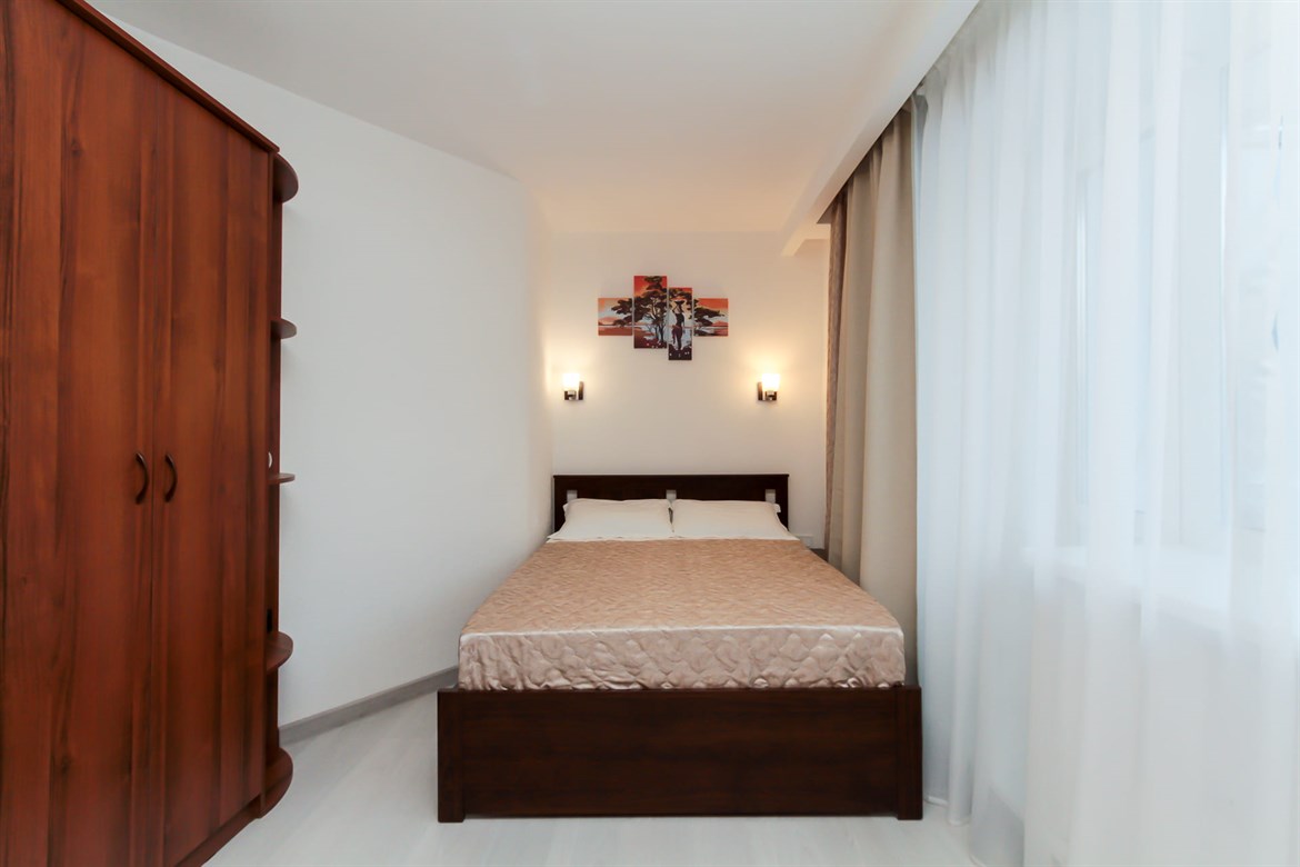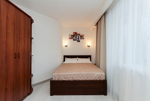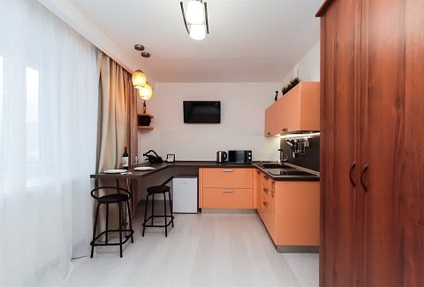 В номере: диван, стол, стулья, шкаф, микроволновая печь, мини-холодильник, набор посуды, плита электрическая, телевизор, электрочайник