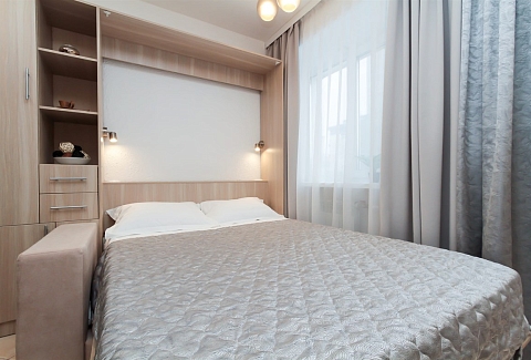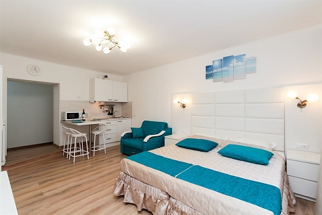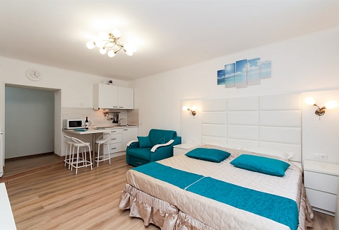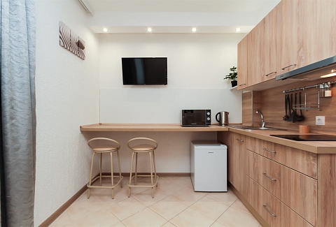 В номере: кресло-кровать, кровать двуспальная, прикроватные тумбочки, стол, стулья, тумба под телевизор, шкаф, микроволновая печь, мини-холодильник, набор посуды, плита электрическая, телевизор, электрочайник