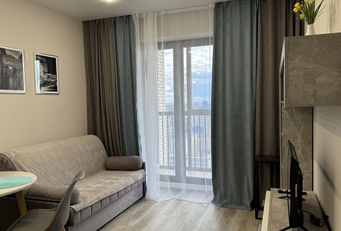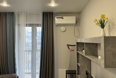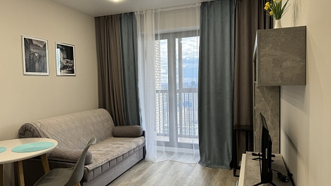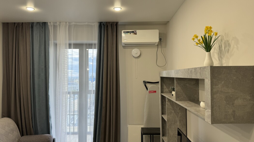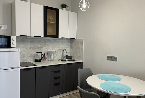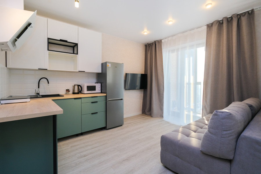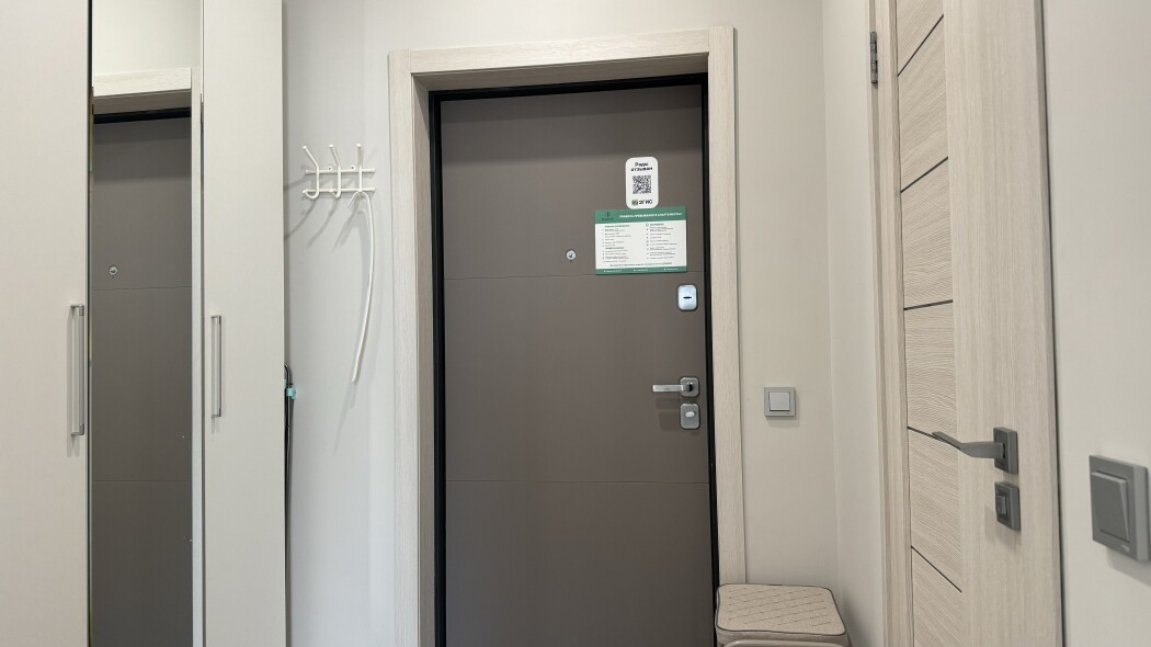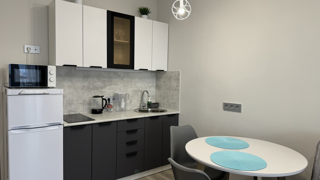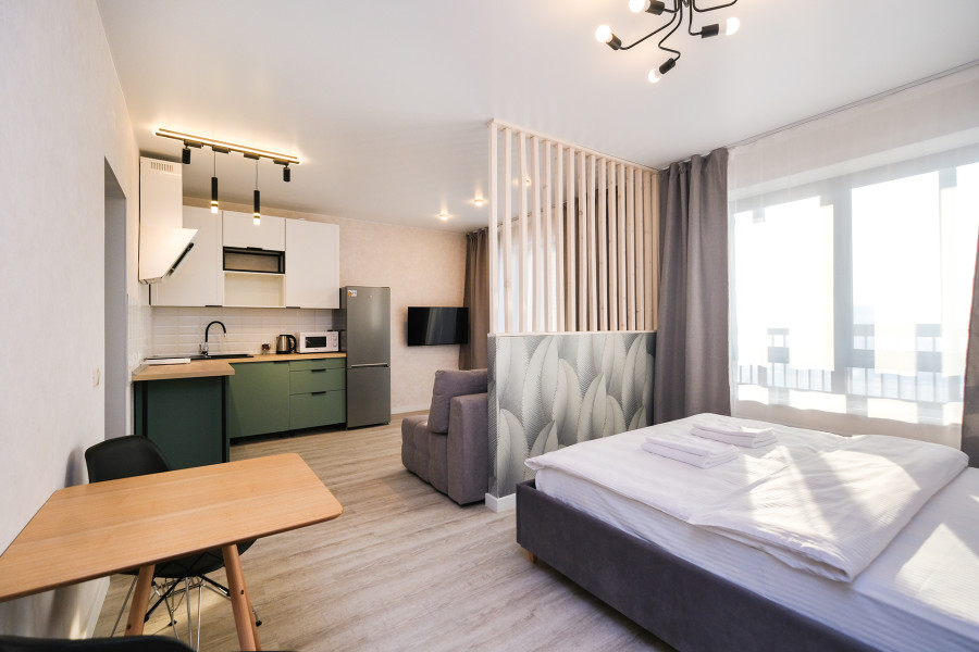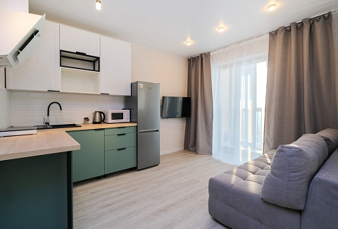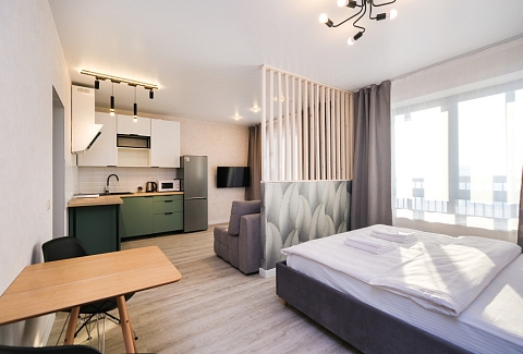 В номере: вешалка, диван раскладной, зеркало, кухонная мебель, стол, стулья, тумба, шкаф, гладильная доска, кондиционер, микроволновая печь, набор посуды, плита электрическая, сейф, стиральная машина, телевизор ЖК, утюг, холодильник, электрочайник
