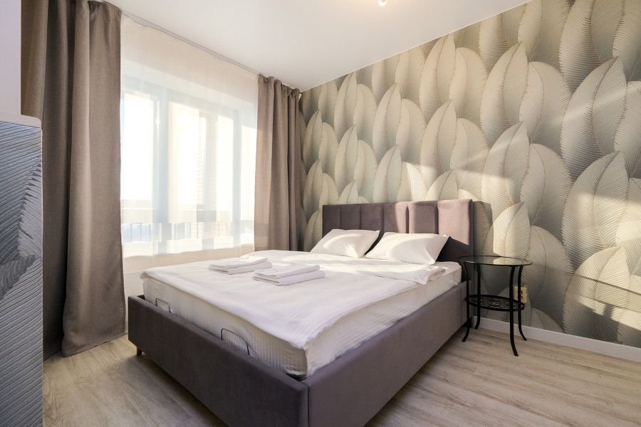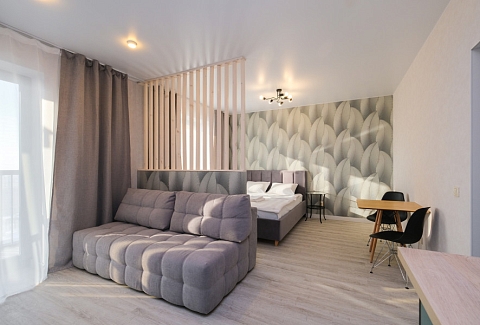 В номере: вешалка, диван раскладной, кровать двуспальная, кухонная мебель, прикроватный столик, стол, стулья, шкаф, гладильная доска, кондиционер, микроволновая печь, набор посуды, плита электрическая, сейф, стиральная машина, телевизор ЖК, утюг, холодильник, электрочайник