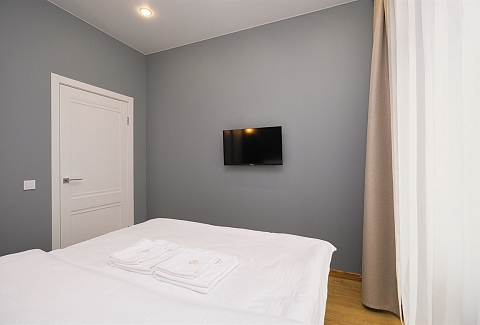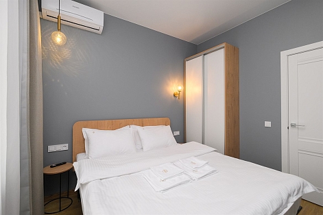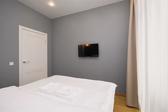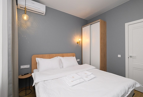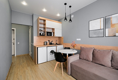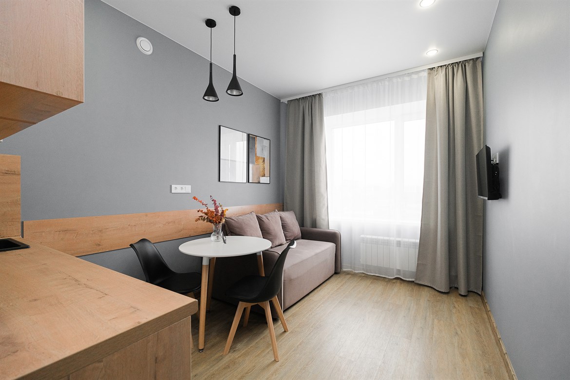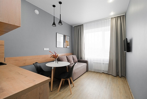 Апартаменты размещены в новом высотном доме с закрытой территорией. На первом этаже открыты магазин продуктов и кофейня. Номерной фонд состоит из трех уютных студий на 2 и 4 гостей. Все категории стильно оформлены в сдержанных тонах, располагают удобными спальными местами, мини-кухней, ванной комнатой. В наличии — полный комплект бытовой техники, включая стиральную машину. Везде для постояльцев доступно подключение к Wi-Fi.