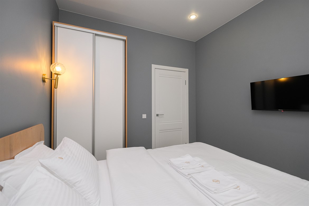 В номере: вешалка, диван, зеркало, кровать двуспальная, стол, стулья, шкаф, микроволновая печь, мини-холодильник, набор посуды, плита электрическая, стиральная машина, телевизор, электрочайник