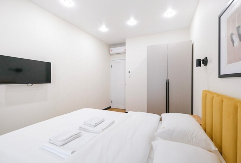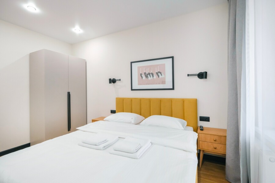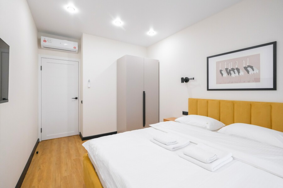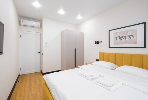 В номере: диван раскладной, кровать двуспальная, прикроватные тумбочки, стол, стулья, шкаф, кондиционер, набор посуды, стиральная машина, телевизор, холодильник, чайник