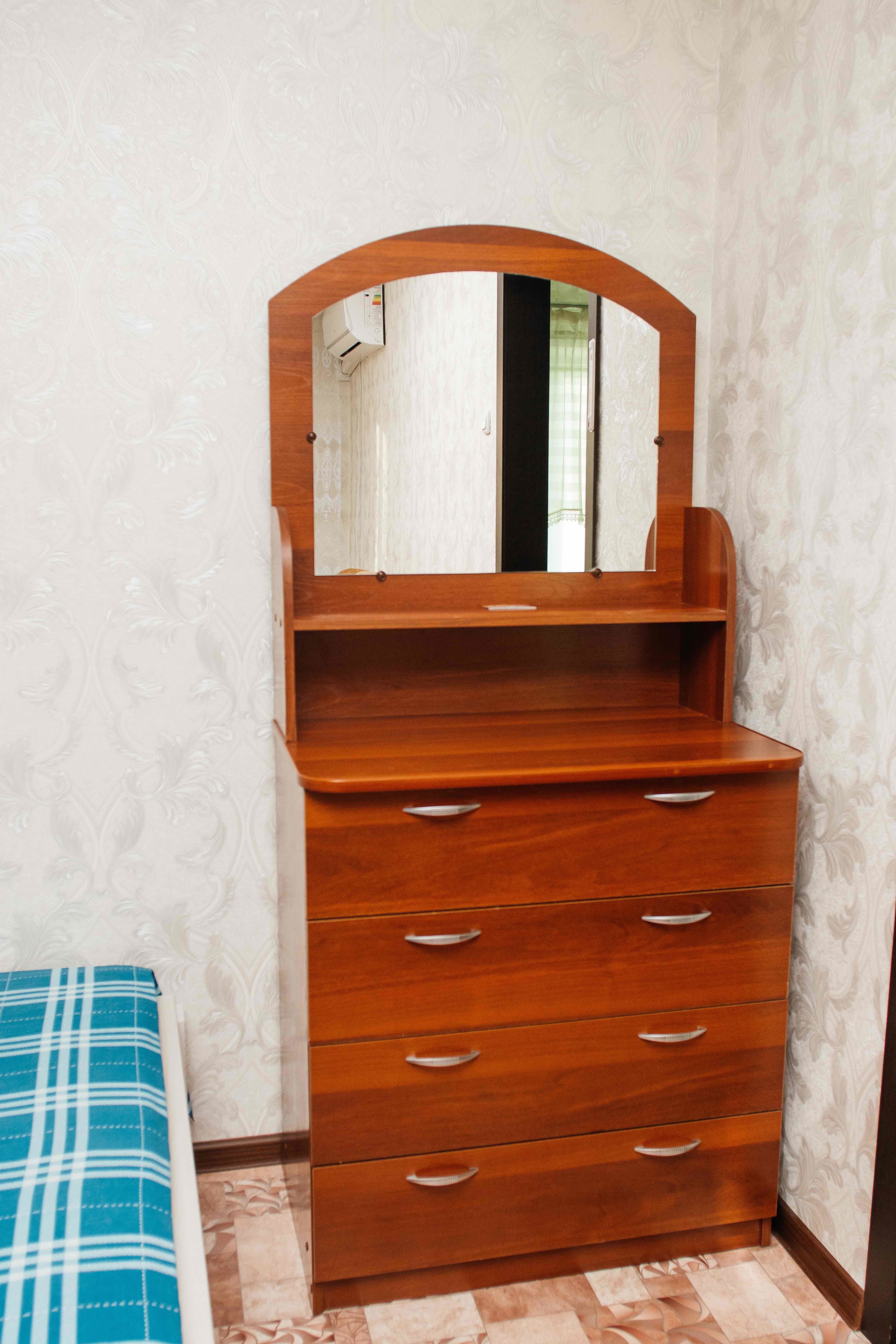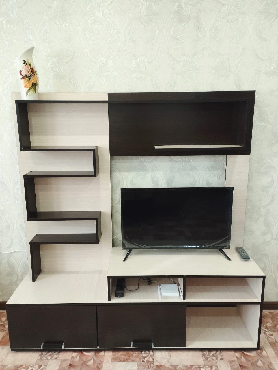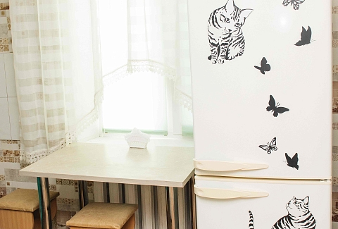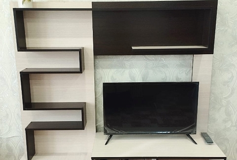 В номере: диван раскладной, кровать полутороспальная, стол, стулья, шкаф, гладильная доска, кондиционер, микроволновая печь, набор посуды, плита электрическая, стиральная машина, сушилка для белья, телевизор, утюг, холодильник, электрочайник