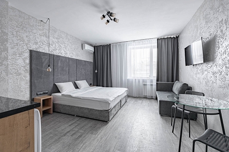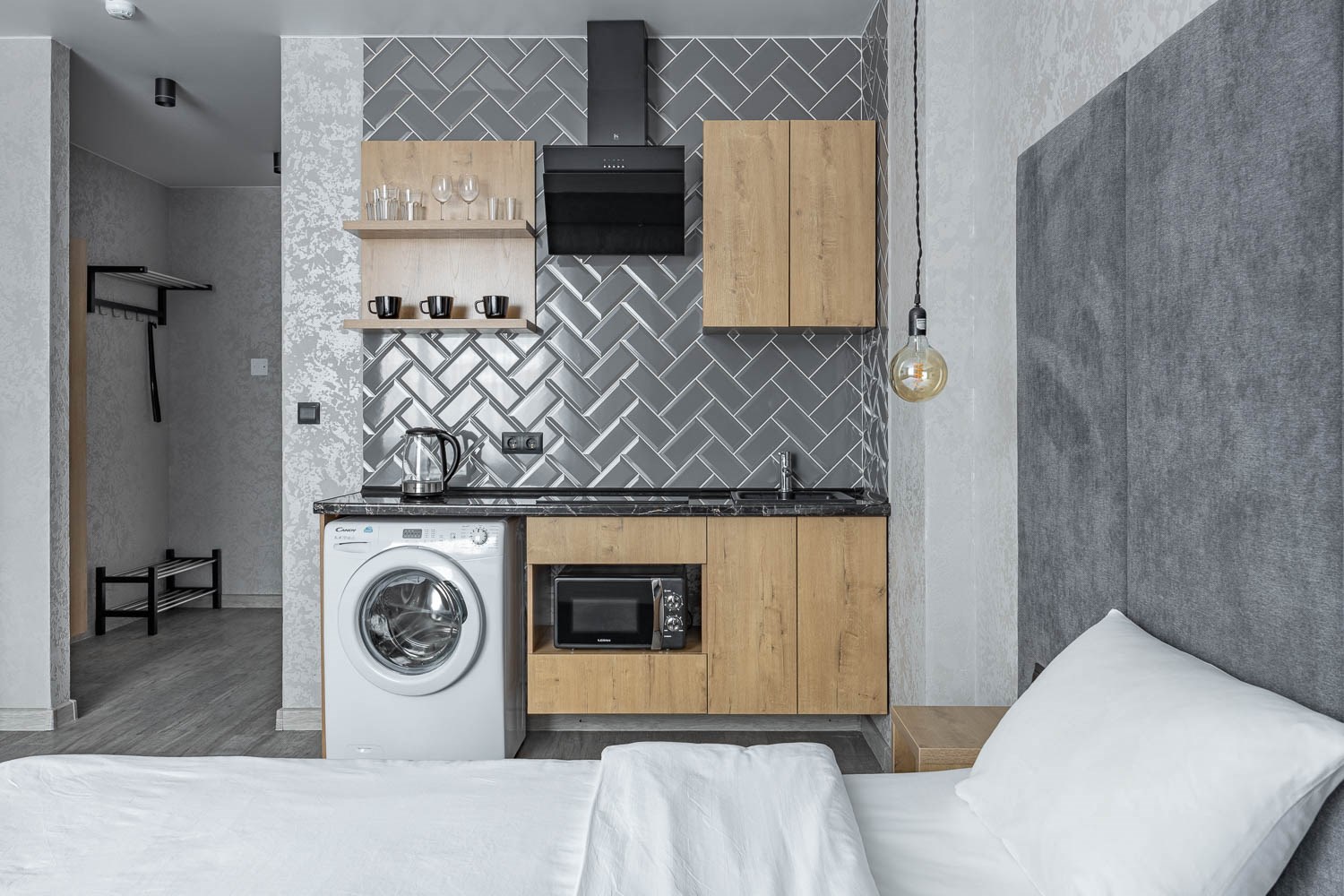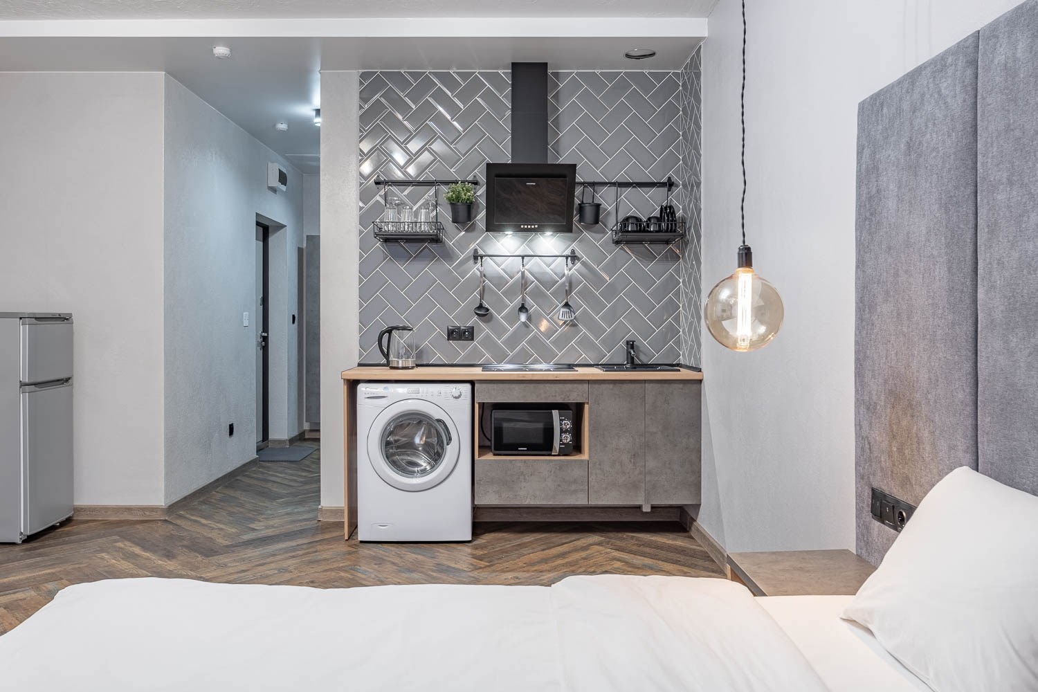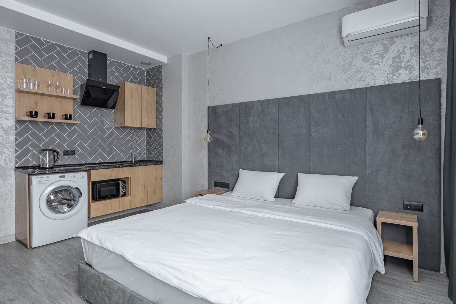 В номере: диван, кровать двуспальная, стол, стулья, шкаф, гладильная доска, микроволновая печь, мини-холодильник, набор посуды, плита электрическая, стиральная машина, телевизор, утюг, чайник
