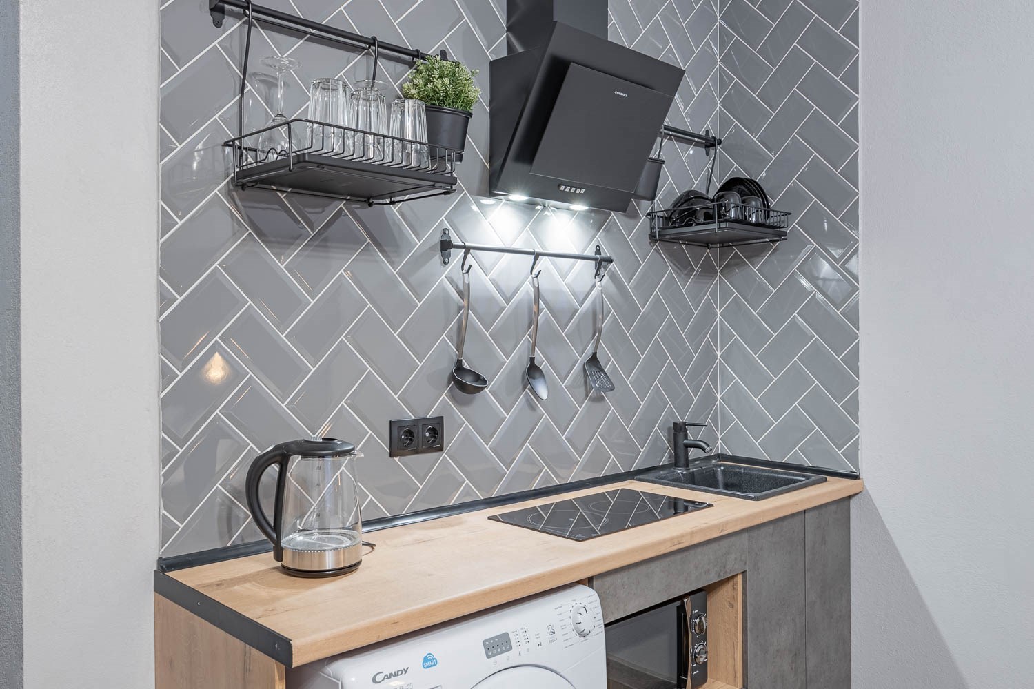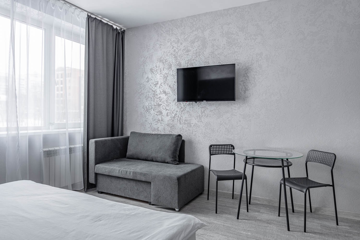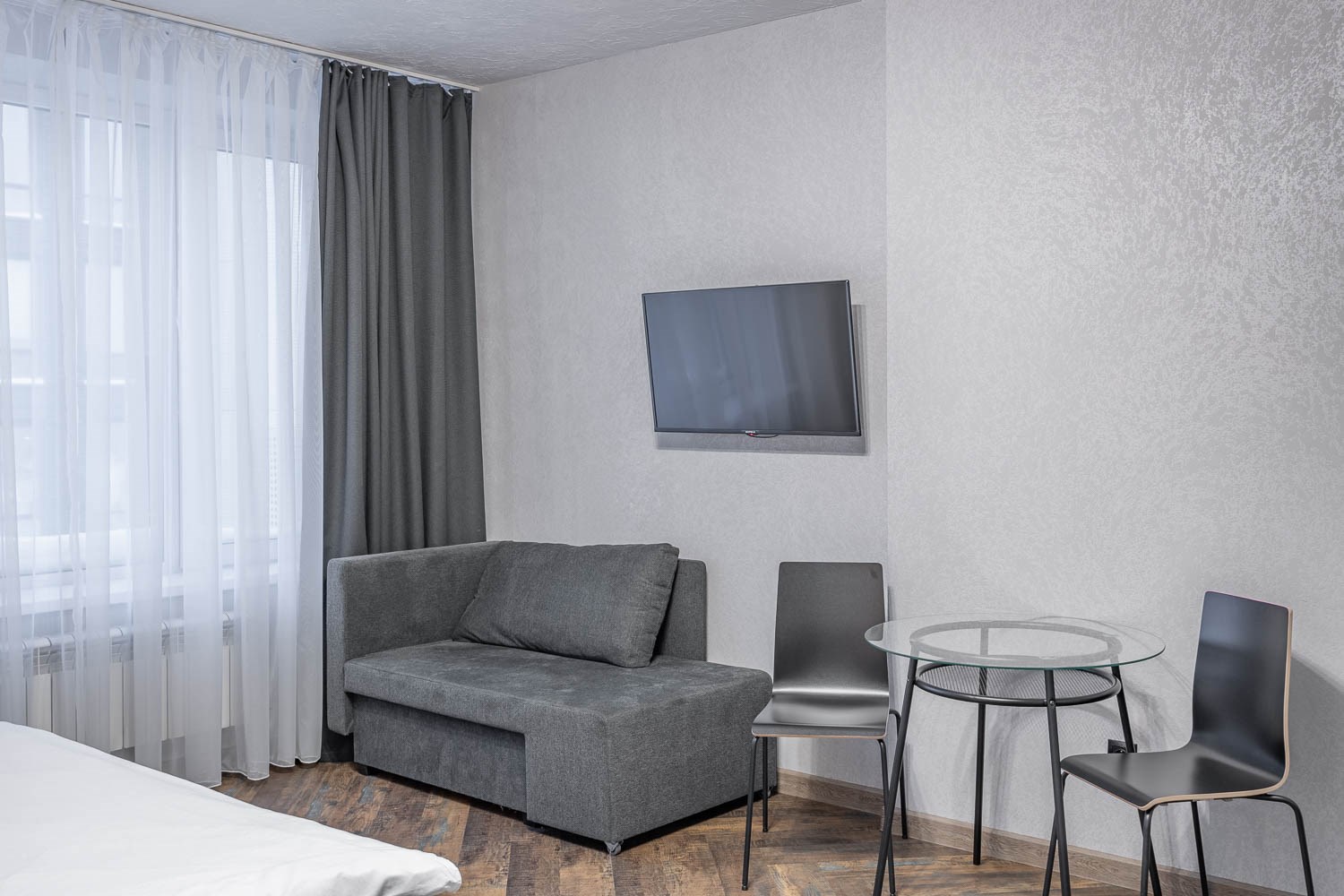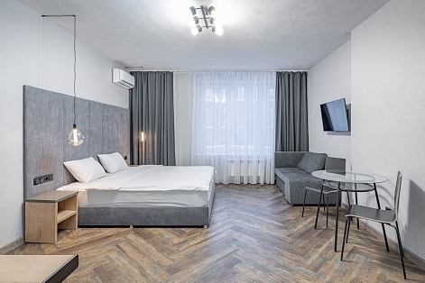 В номере: диван, кровать двуспальная, стол, стулья, шкаф, гладильная доска, микроволновая печь, мини-холодильник, набор посуды, плита электрическая, стиральная машина, телевизор, утюг, чайник