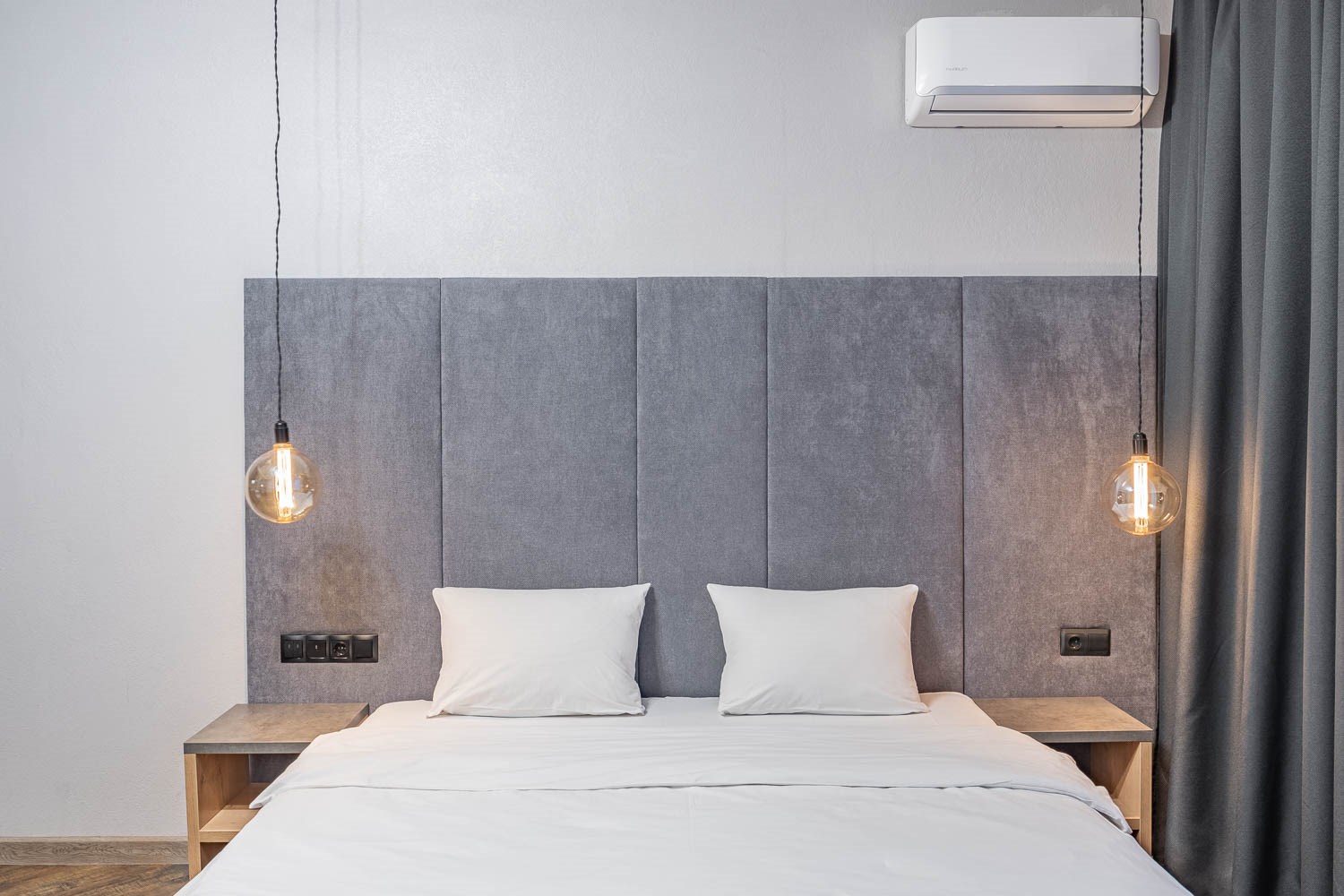 В номере: диван, кровать двуспальная, прикроватные тумбочки, стол, стулья, шкаф, гладильная доска, кондиционер, микроволновая печь, мини-холодильник, набор посуды, плита электрическая, стиральная машина, телевизор, утюг, чайник