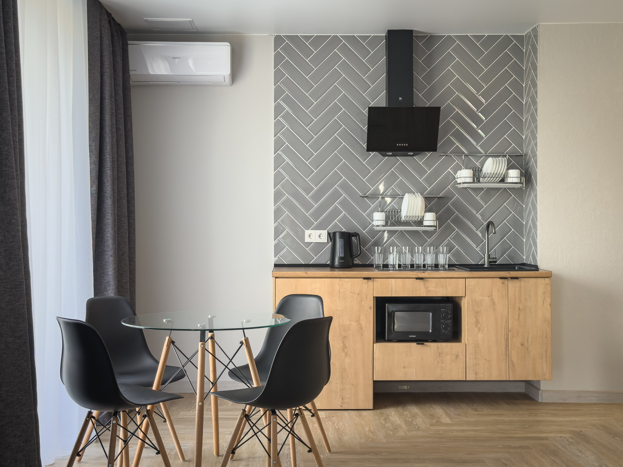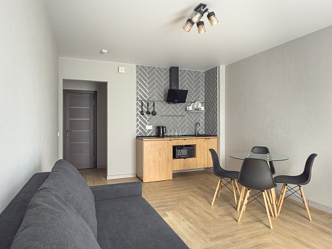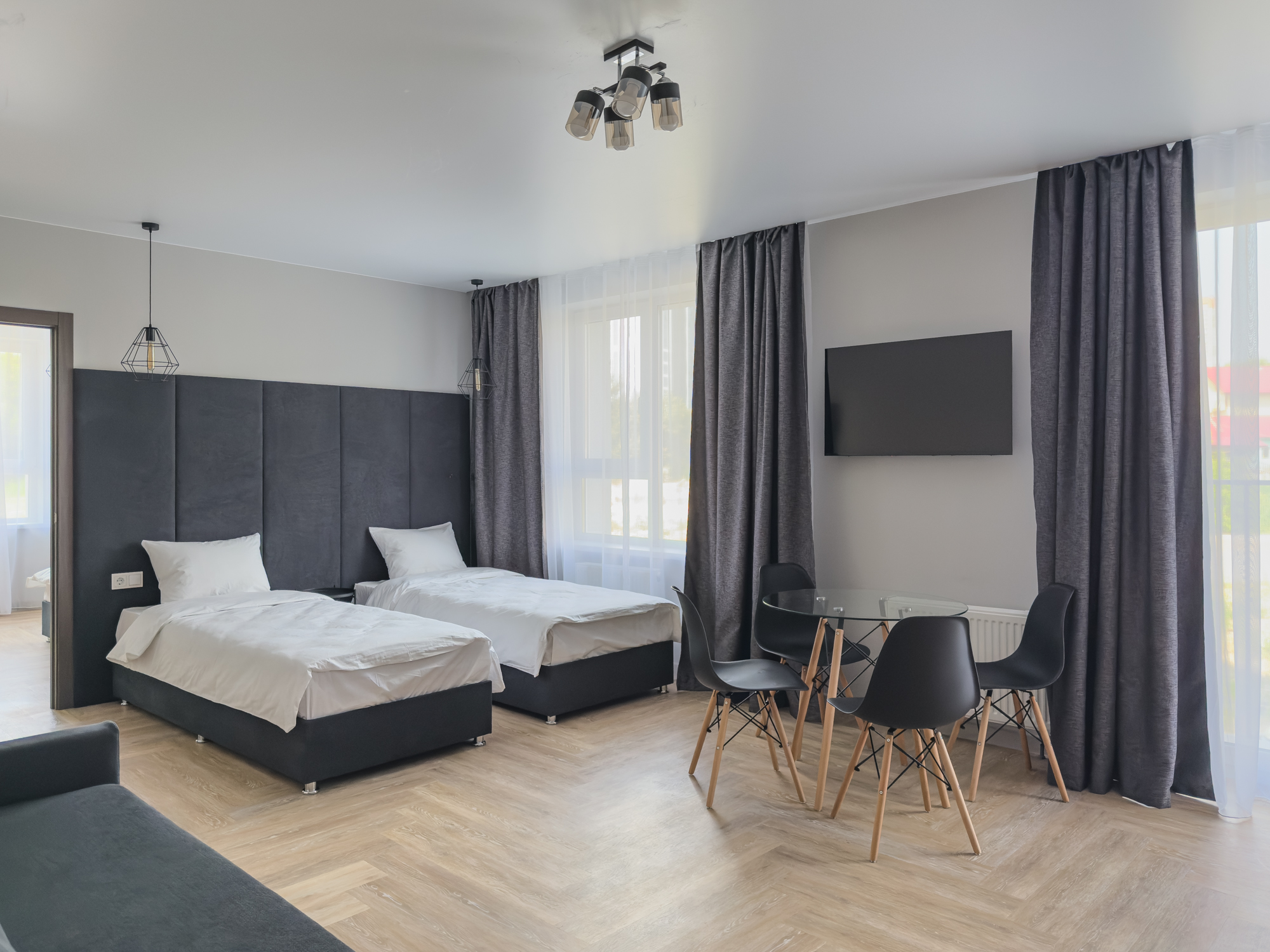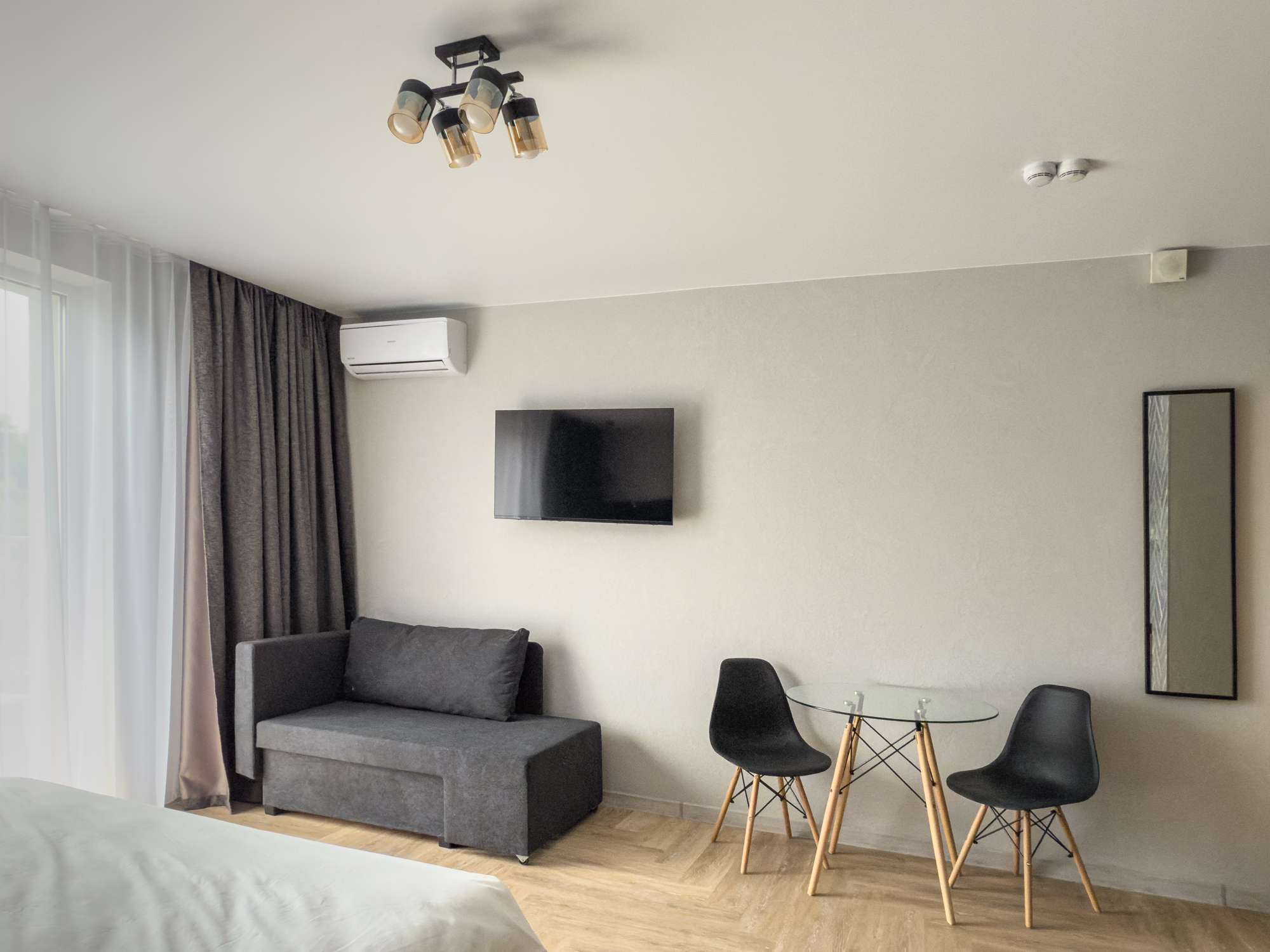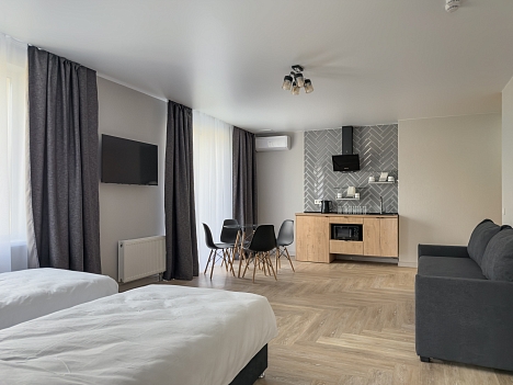 В номере: диван раскладной, кровать двуспальная, стол, стулья, шкаф, гладильная доска, кондиционер, микроволновая печь, набор посуды, плита электрическая, стиральная машина, телевизор, утюг, холодильник, чайник