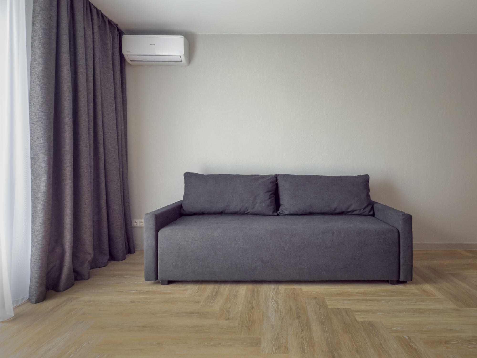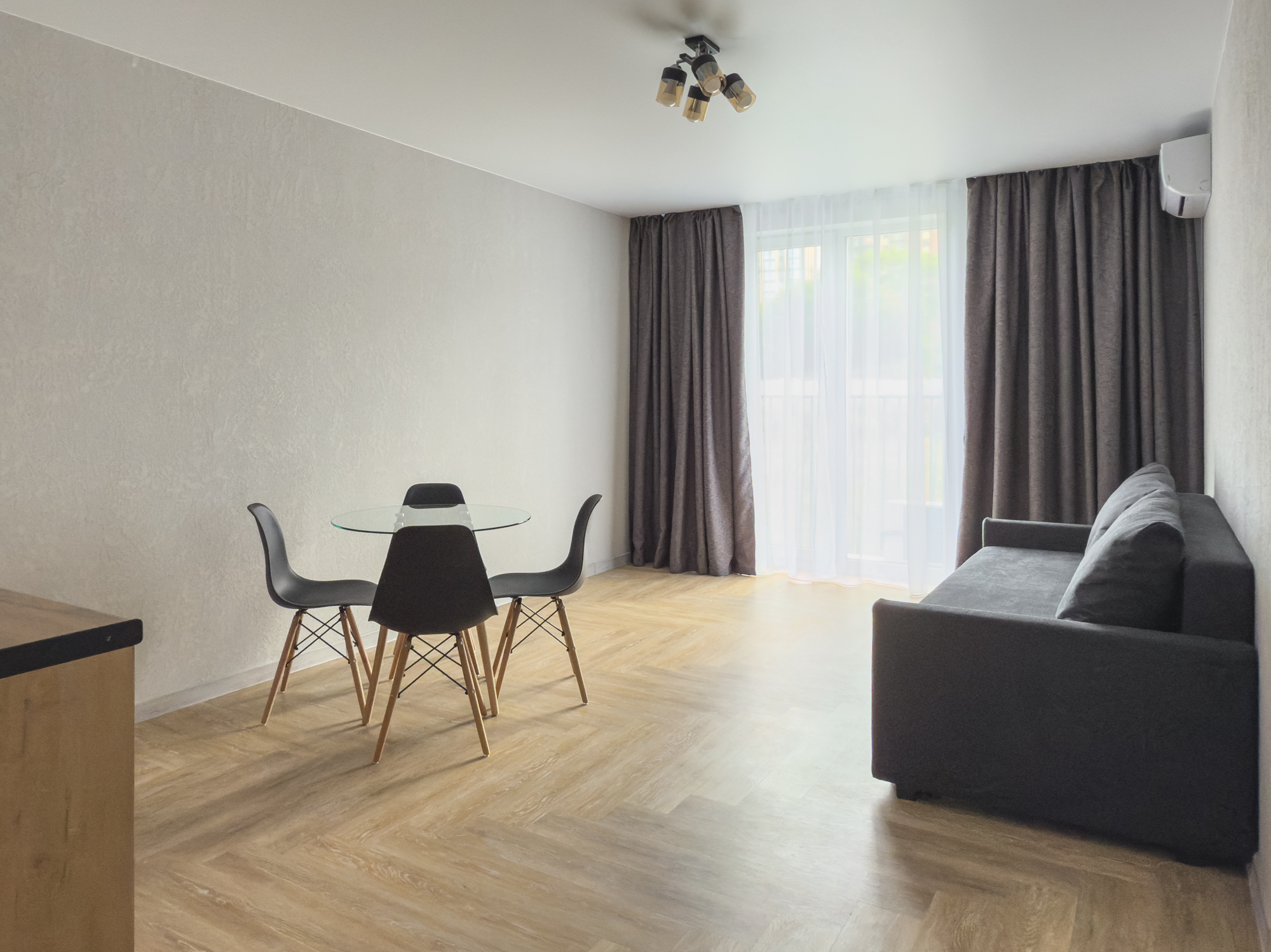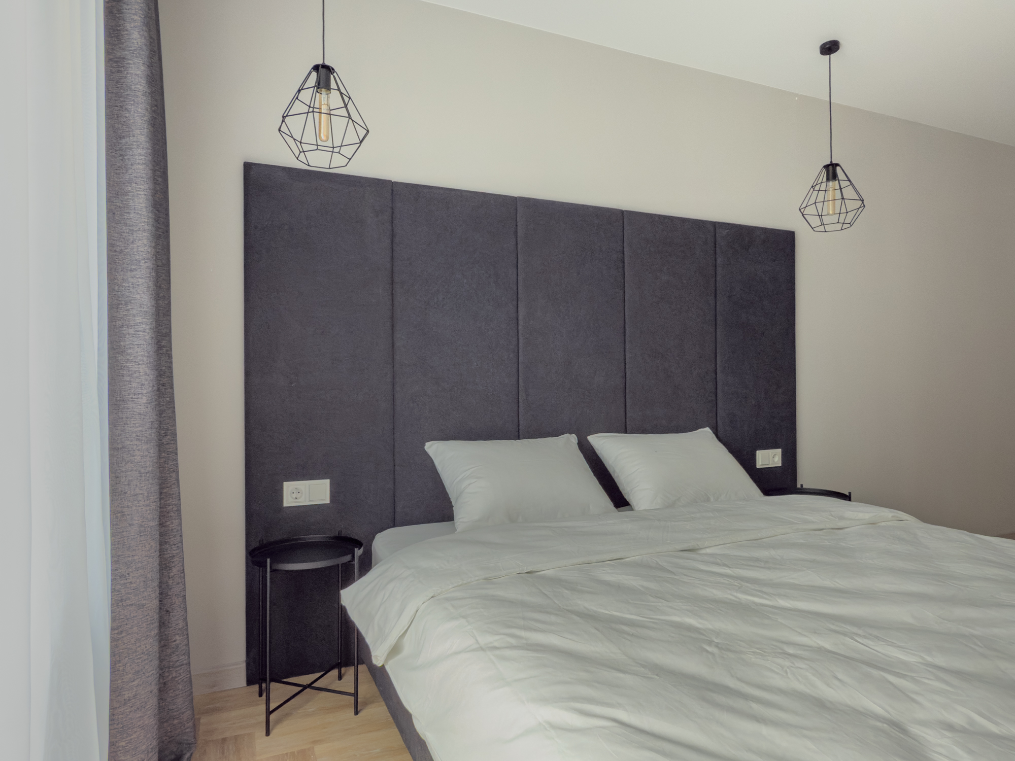 В номере: диван раскладной, кровать двуспальная, стол, стулья, шкаф, гладильная доска, кондиционер, микроволновая печь, набор посуды, плита электрическая, стиральная машина, телевизор, утюг, холодильник, чайник