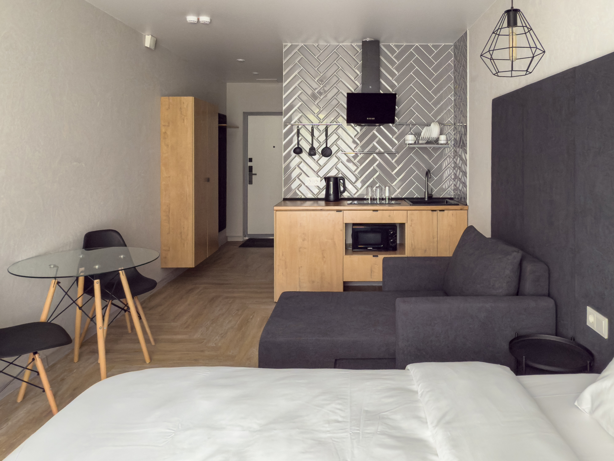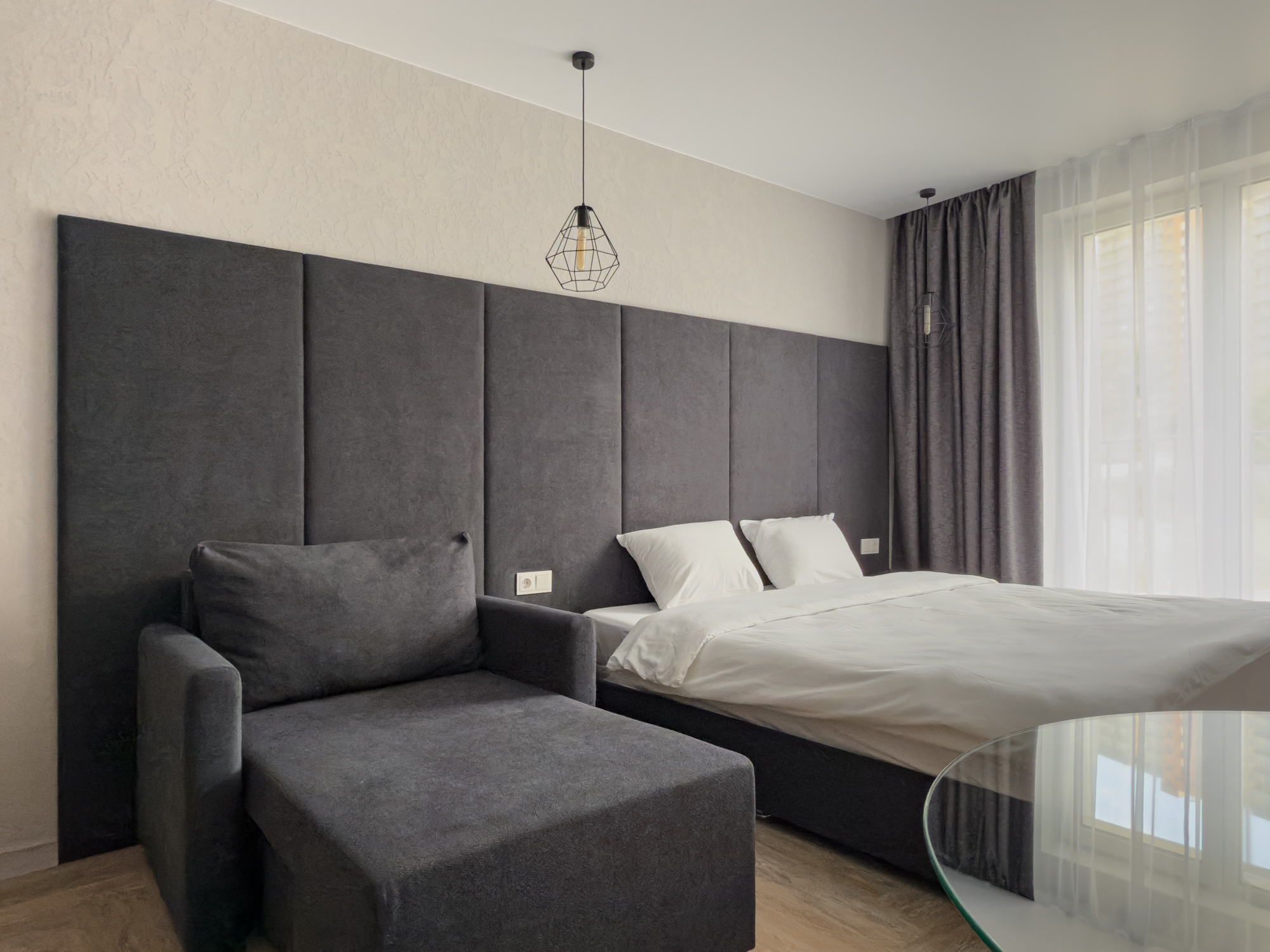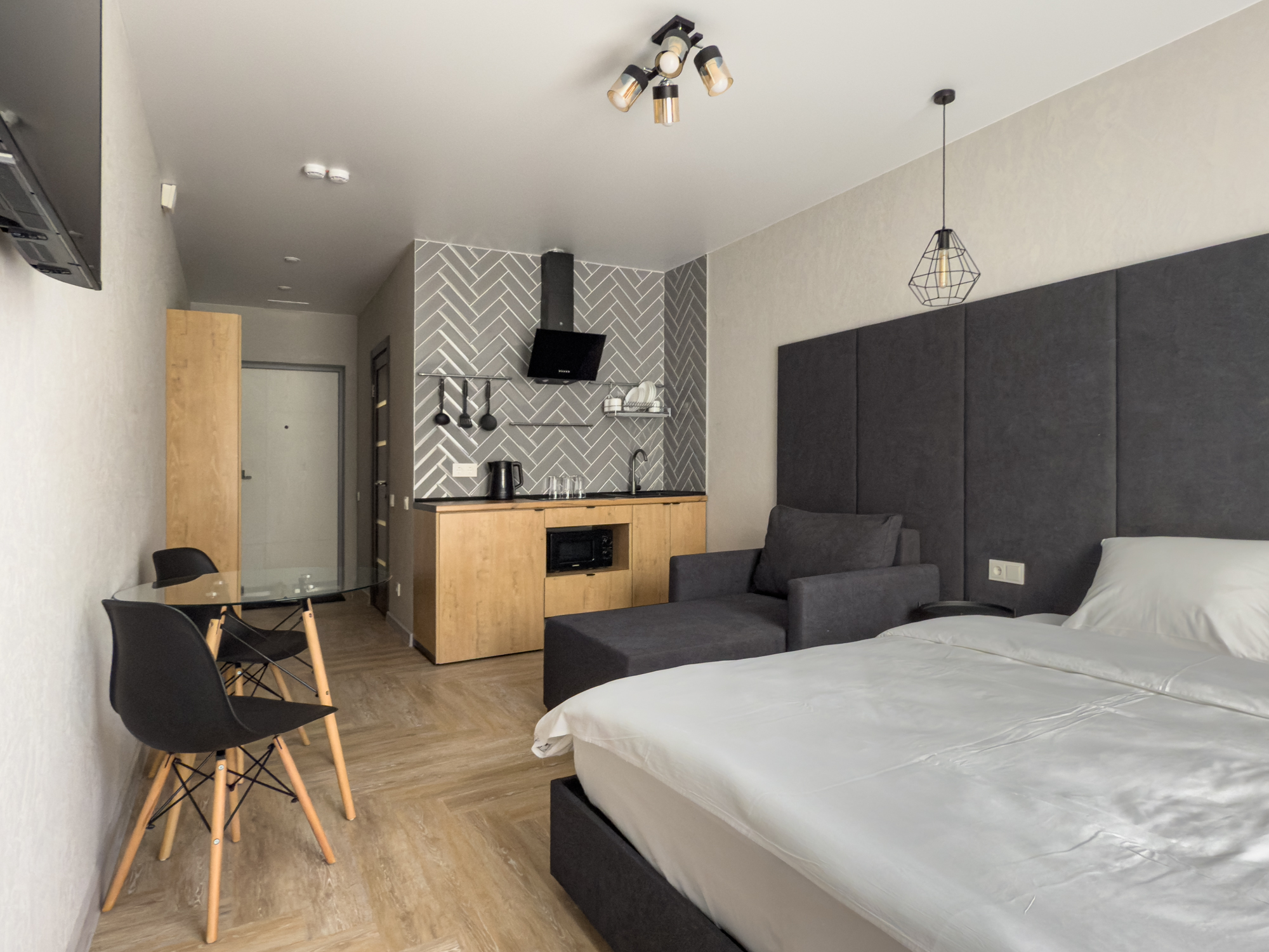 В номере: диван, кровать двуспальная, стол, стулья, шкаф, гладильная доска, кондиционер, мини-холодильник, набор посуды, плита электрическая, стиральная машина, телевизор, утюг, чайник