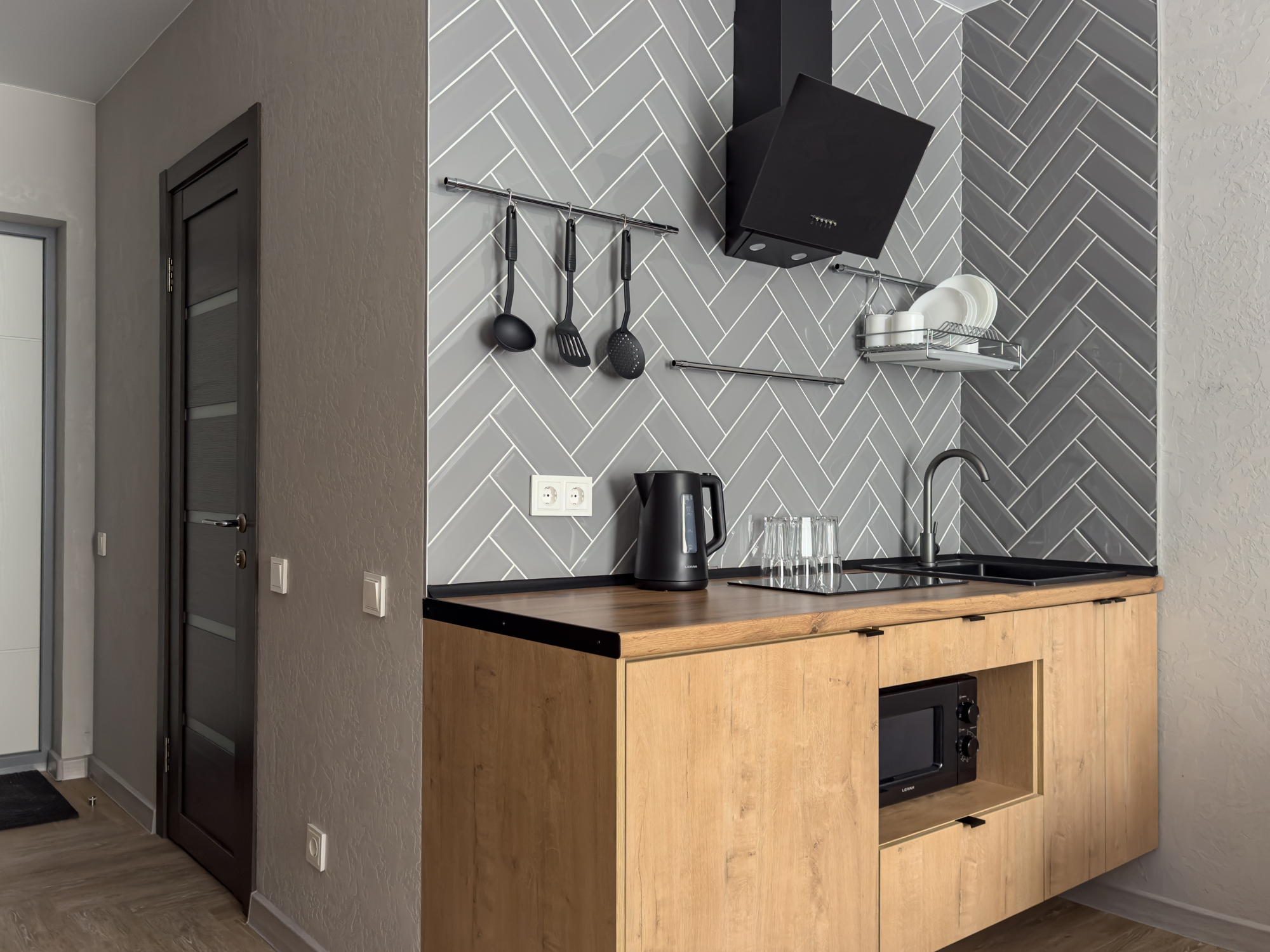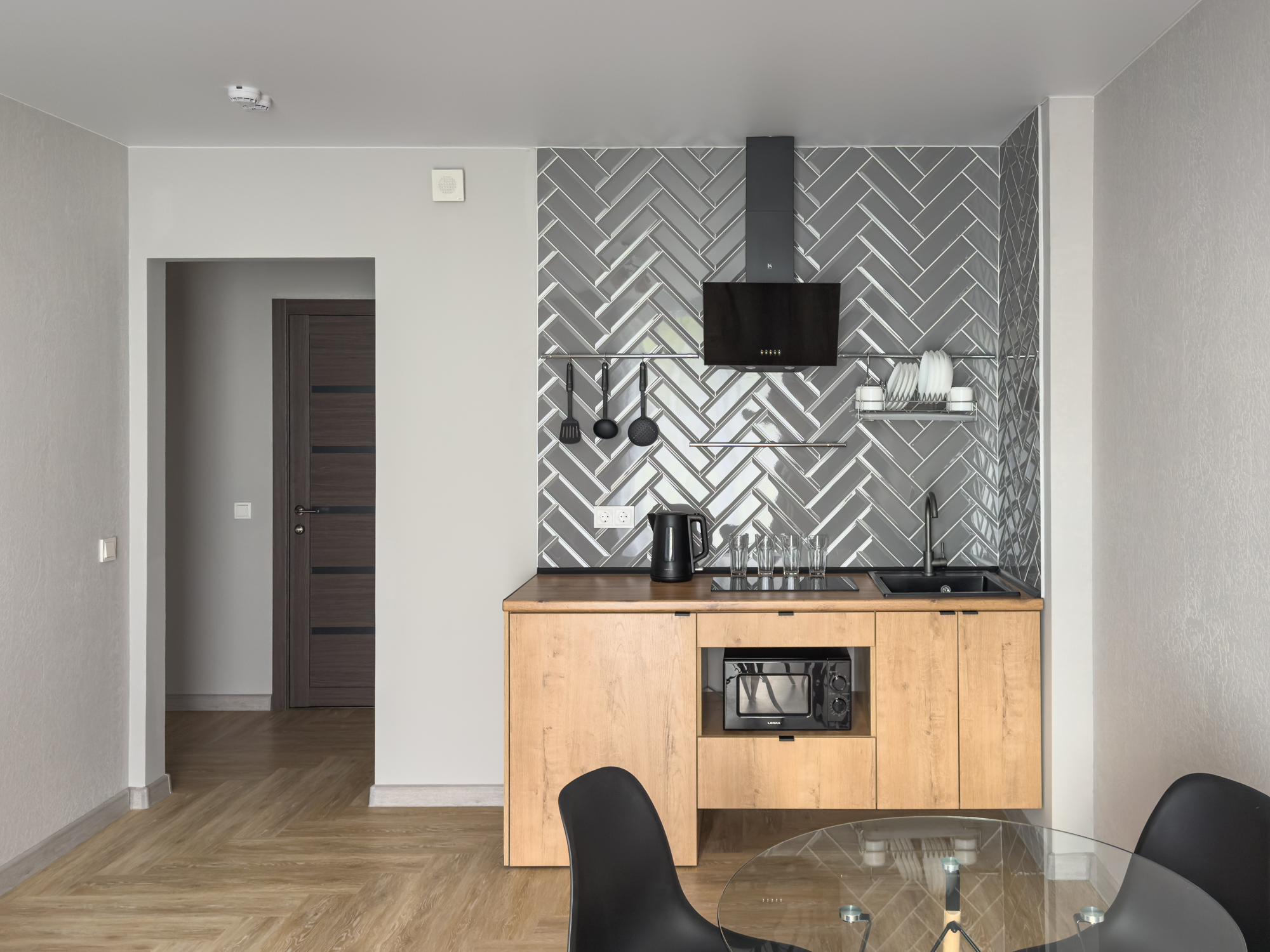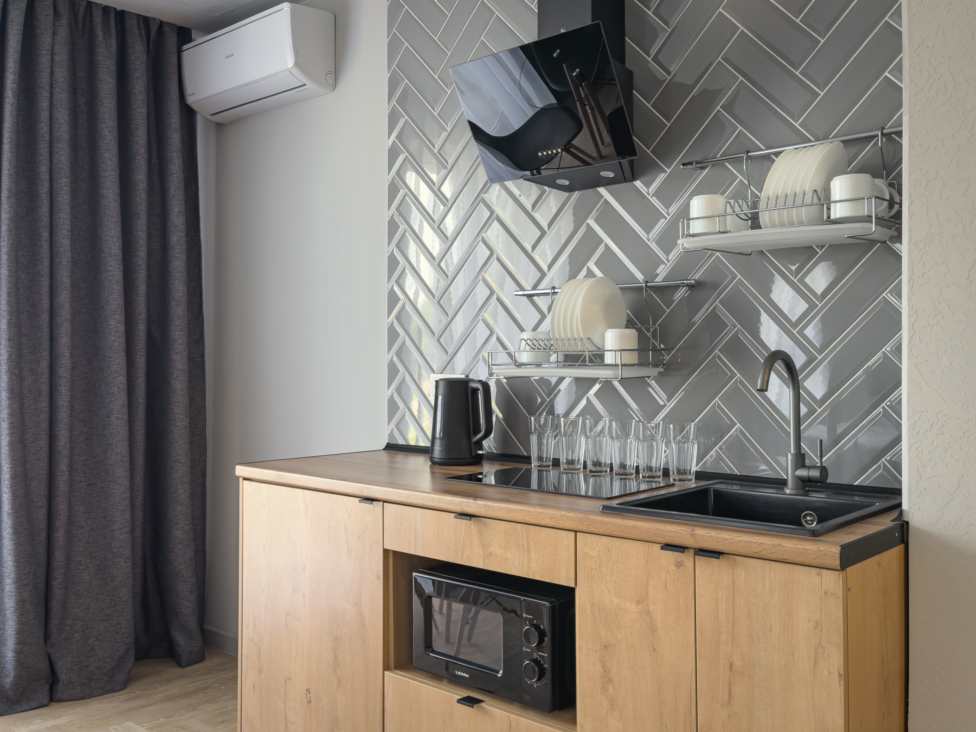 В номере: диван, кровать двуспальная, стол, стулья, шкаф, гладильная доска, кондиционер, мини-холодильник, набор посуды, плита электрическая, стиральная машина, телевизор, утюг, чайник
