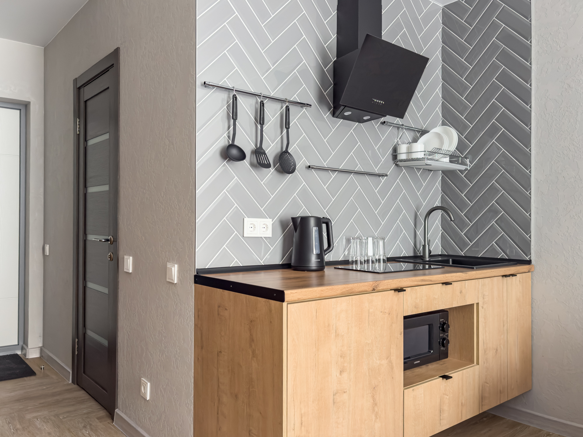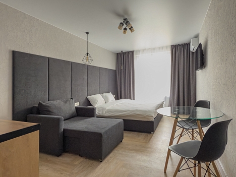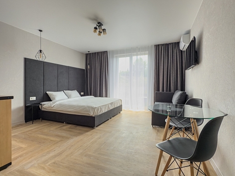 В номере: диван, кровать двуспальная, стол, стулья, шкаф, кондиционер, микроволновая печь, мини-холодильник, набор посуды, плита электрическая, стиральная машина, телевизор, утюг, чайник