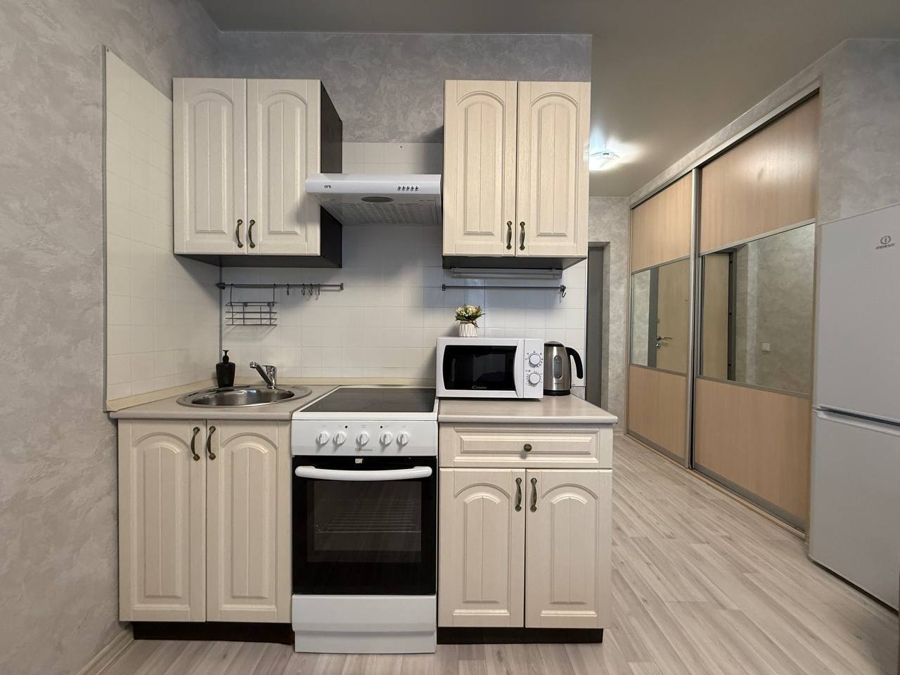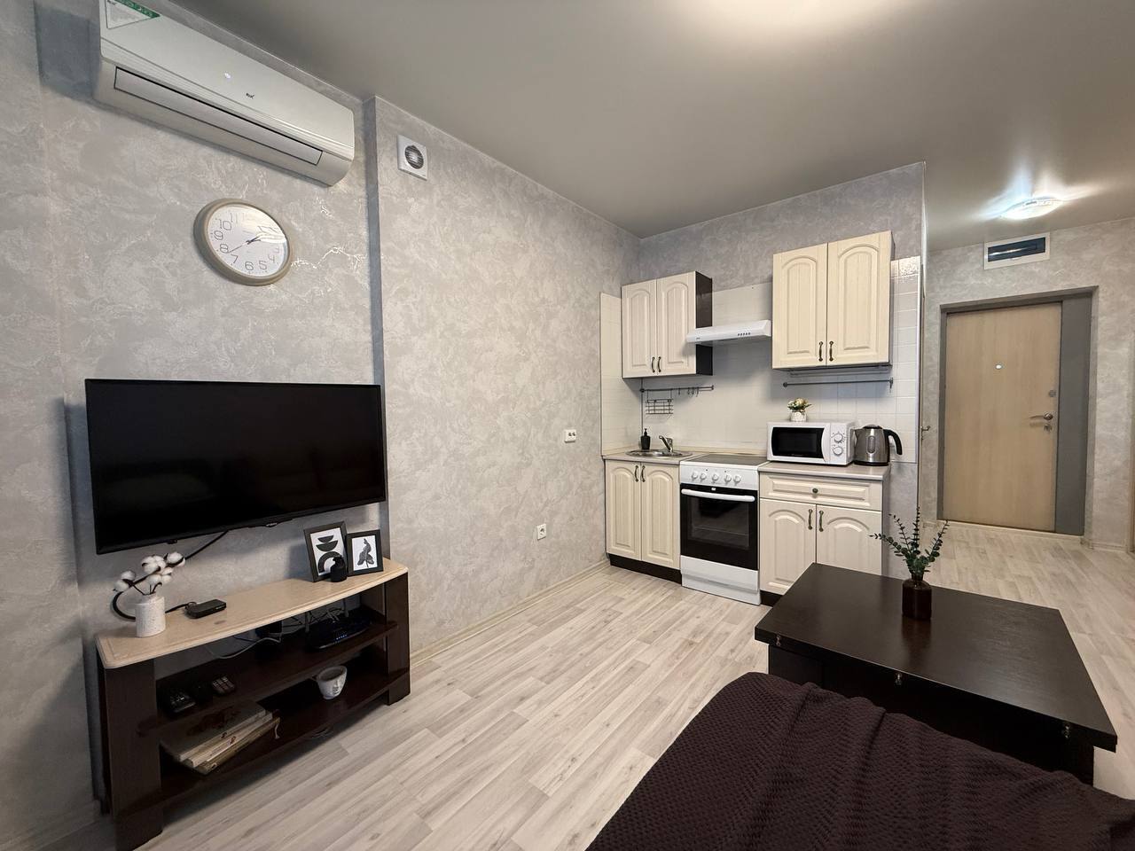 В номере: кондиционер, микроволновая печь, музыкальный центр, стиральная машина, телевизор, утюг, холодильник